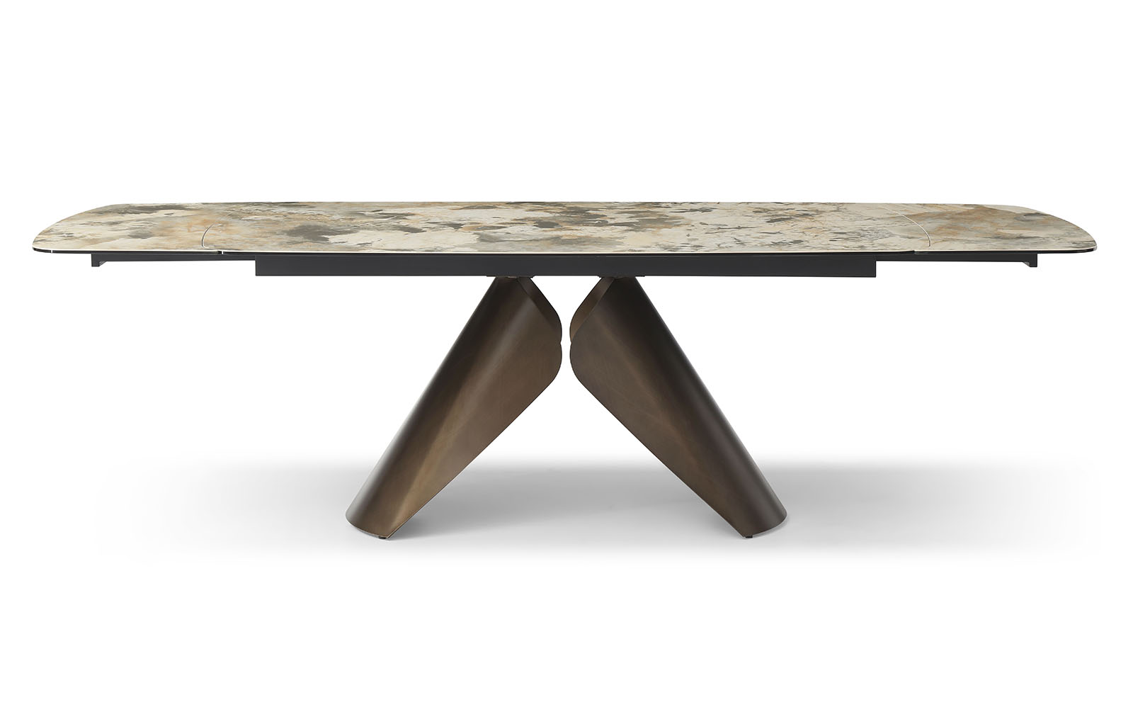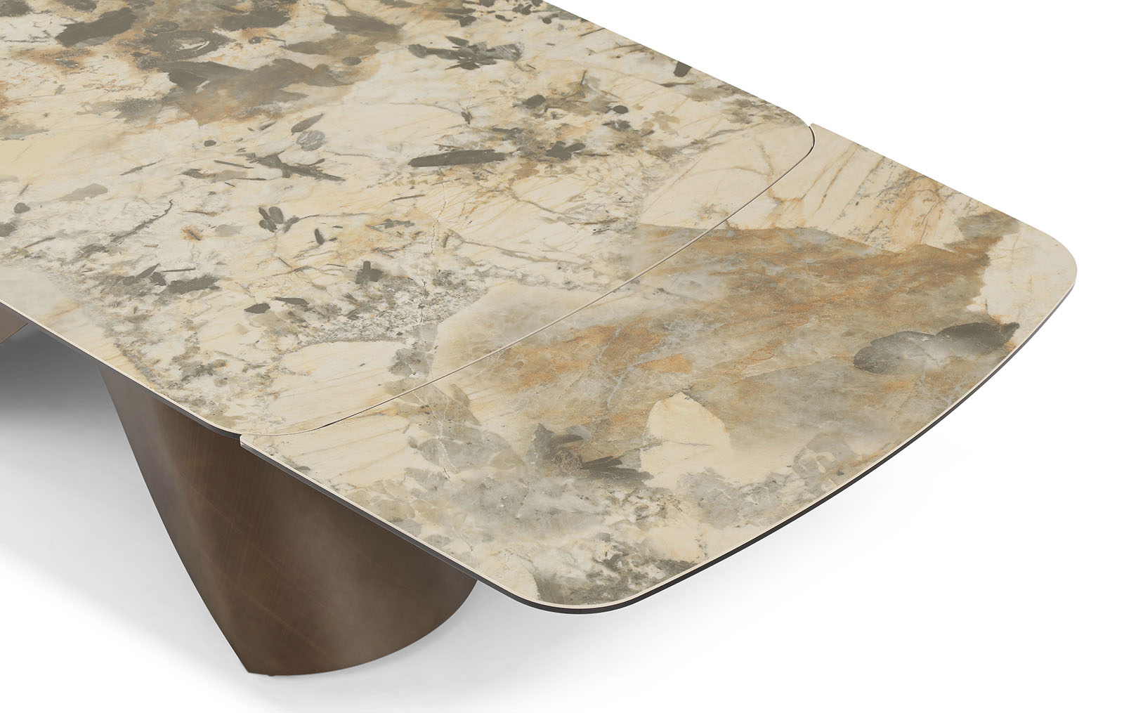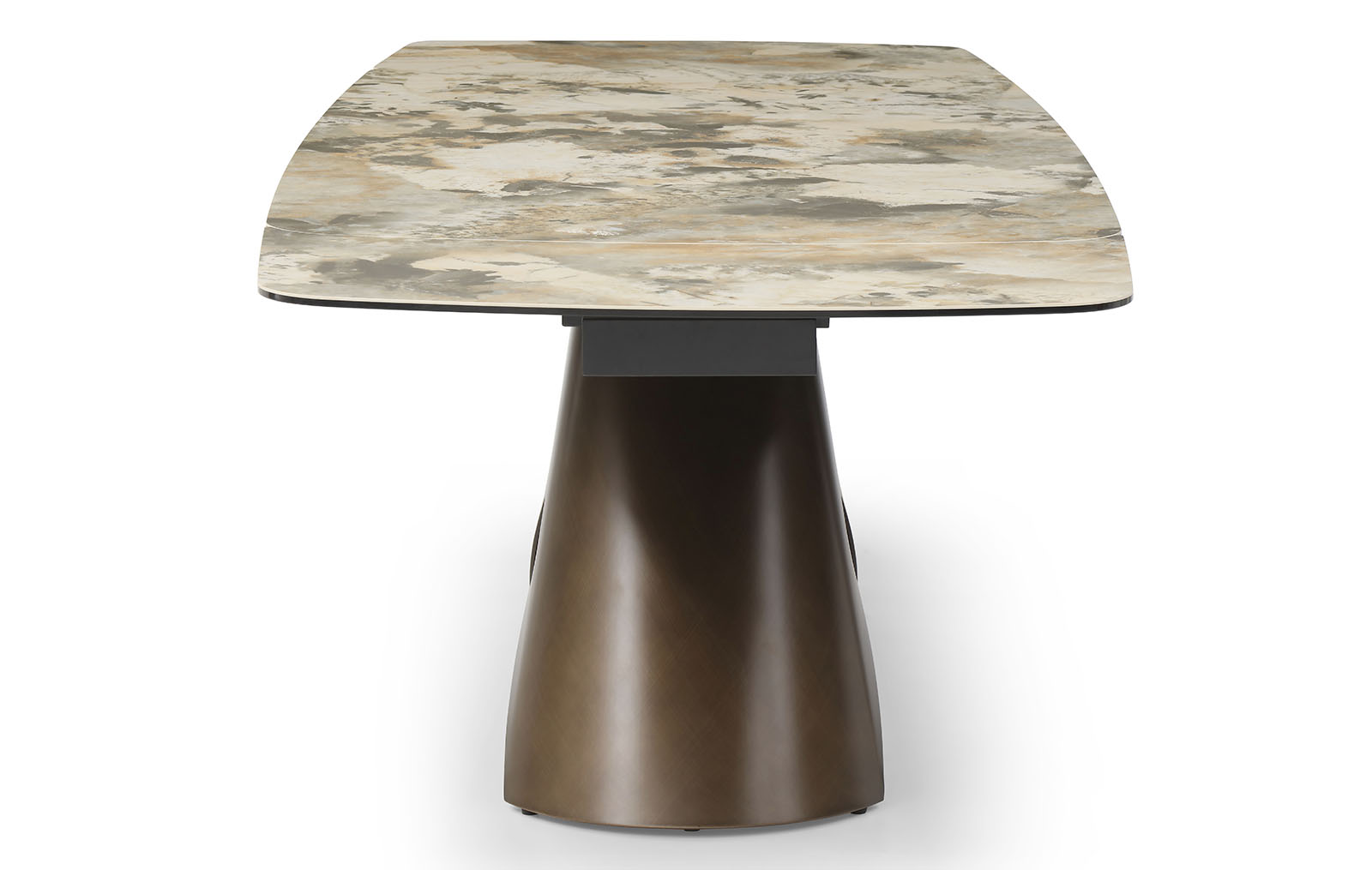 Раскладной обеденный стол Memphis (Мемфис) с керамической столешницей на металлическом подстолье в vмедно-коричневом оттенке.