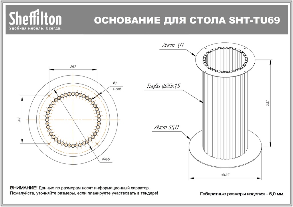 Подстолье имеет основание с листом 5 мм, что обеспечивает устойчивость подстолья со столешницами вплоть до 900 мм.