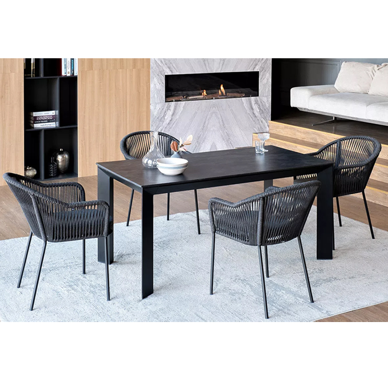 Цвет роупа - темно-серый, что прекрасно сочетается с цветом столешницы и каркасом стульев, создавая гармоничный и современный образ обеденной группы «Лион». "Лион" стул плетеный из роупа, каркас из стали темно-серый (RAL7024) муар, роуп темно-серый круглый, ткань темно-серая 027 4шт. 570Х620Х820, "Диего" обеденный стол из HPL круглый Ø90см, цвет "серый гранит" 1шт. 900Х900Х750,