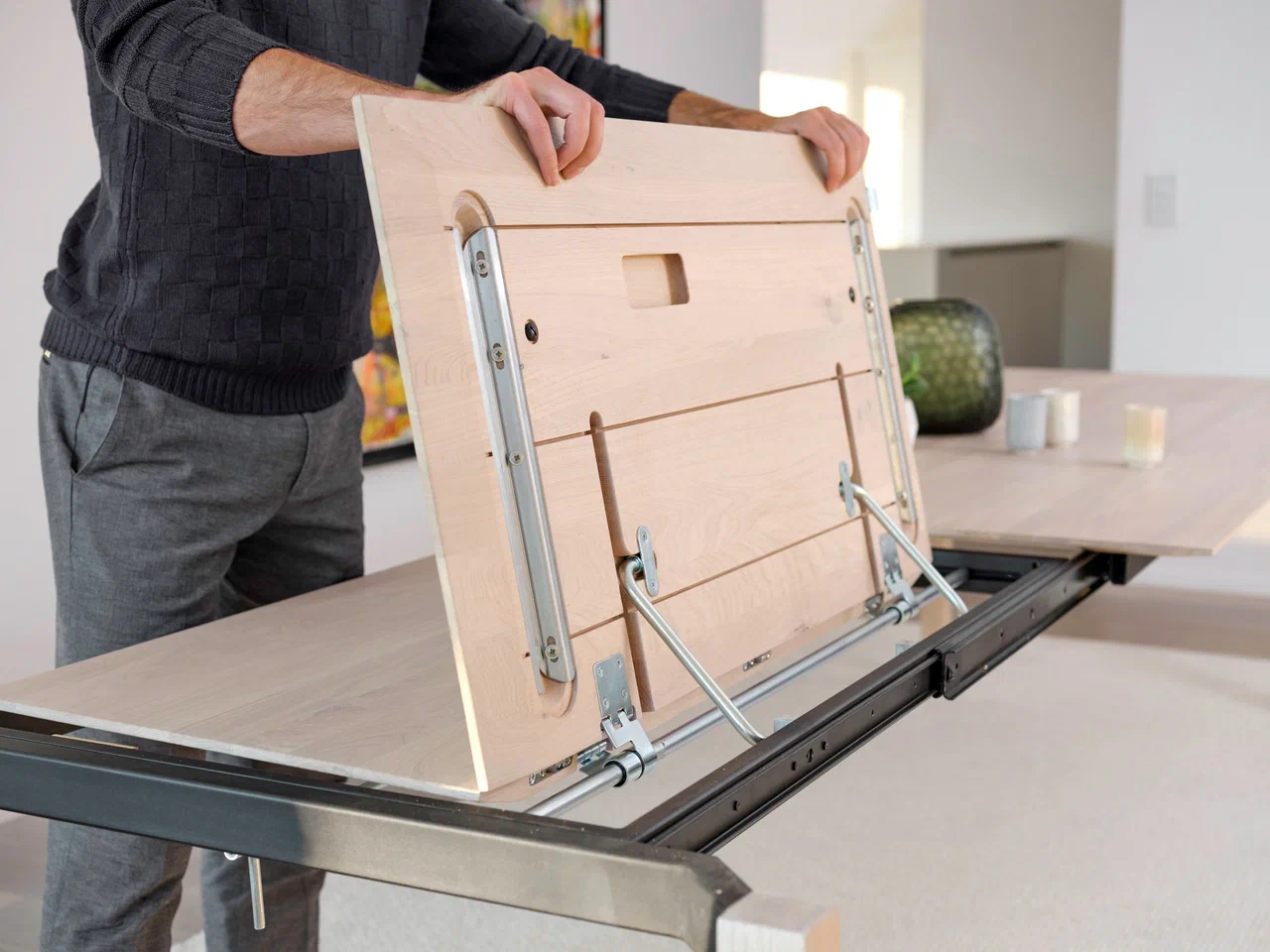 Запросить индивидуальное предложениеОбеденный стол с эффектом парящей столешницы и раскладным механизмом. Столешница из промасленного массива бука (8 оттенков) толщиной 24 мм с глубокой фрезеровкой края на фацет. Видимая часть столешницы - 8 мм. Увеличение столешницы на 1000 мм. Металлическое основание - 22 цвета металла. Раскладные столы других размеров - по запросу.