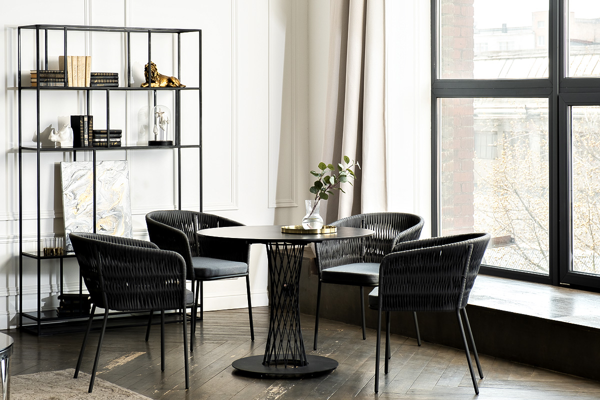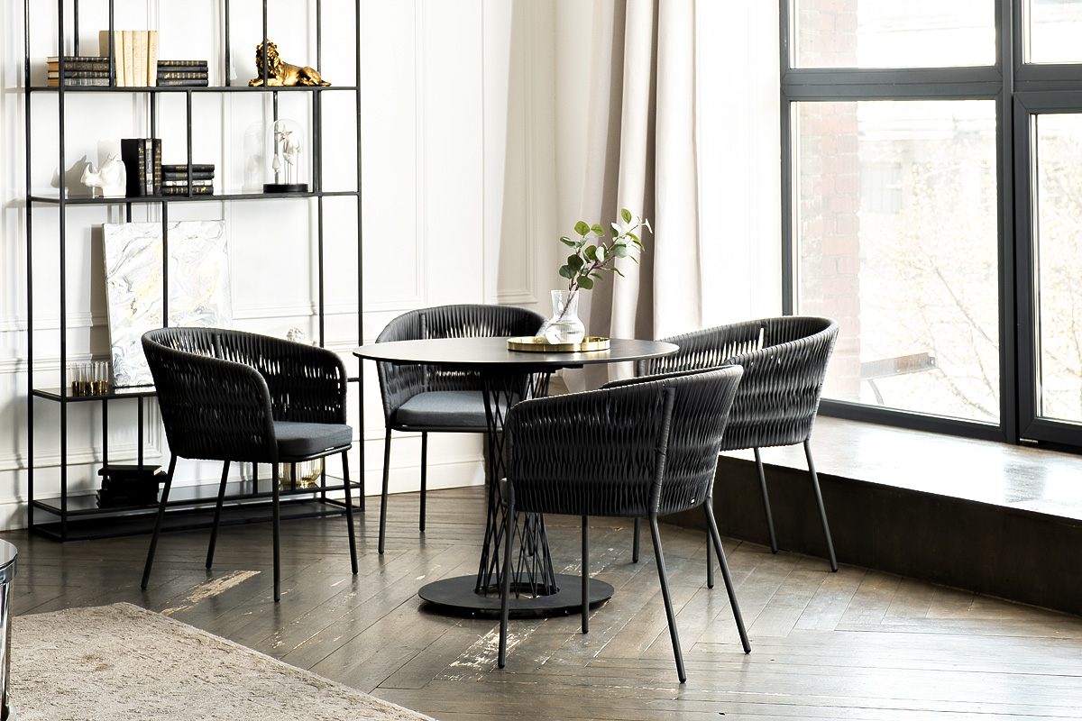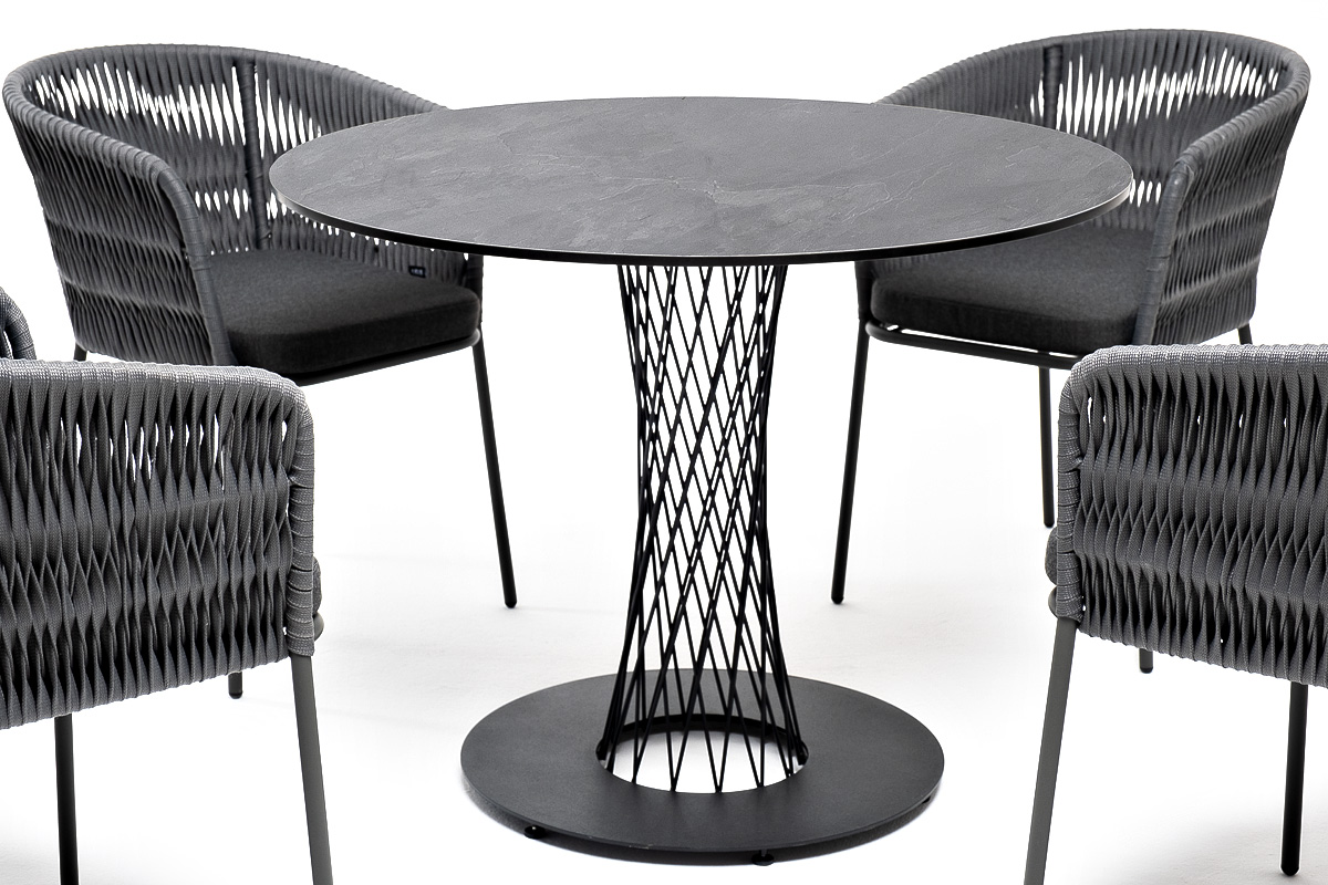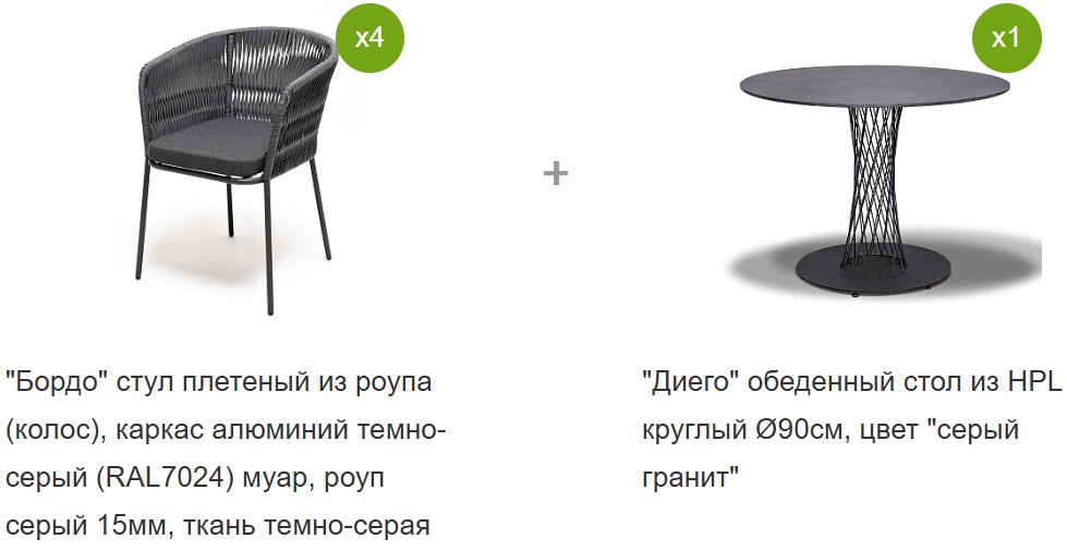 Обеденная группа «Диего» является стильным и практичным решением для обустройства кухни или жилой зоны, она идеально сочетается с различными интерьерами благодаря универсальности использованных материалов и цвета. Она подходит как для ежедневного использования, так и для приема гостей, обеспечивая удобство сидения и качественное исполнение всех элементов. "Диего" обеденный стол из HPL круглый Ø90см, цвет "серый гранит" 1шт. 900Х900Х750, "Бордо" стул плетеный из роупа (колос), каркас алюминий темно-серый (RAL7024) муар, роуп серый 15мм, ткань темно-серая 027 4шт. 570Х620Х775,