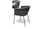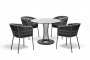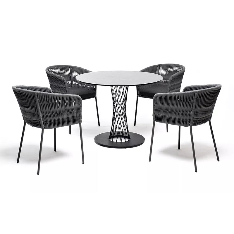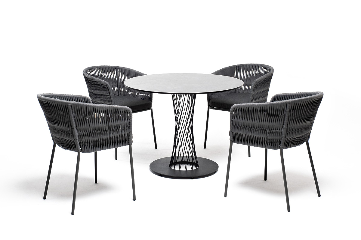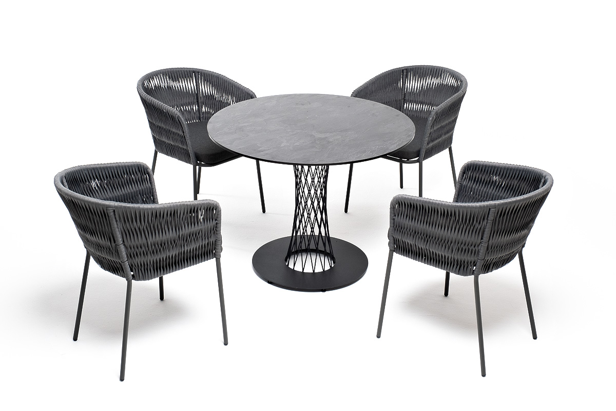 Вместе с этим, в комплектацию входит 4 плетеных стула «Бордо», выполненных с использованием высокопрочного роуп-волокна серого цвета с плетением вида «колос». Стулья имеют размеры 570×620×775 мм и устойчивый каркас из алюминия, окрашенной порошковой краской темно-серого цвета.