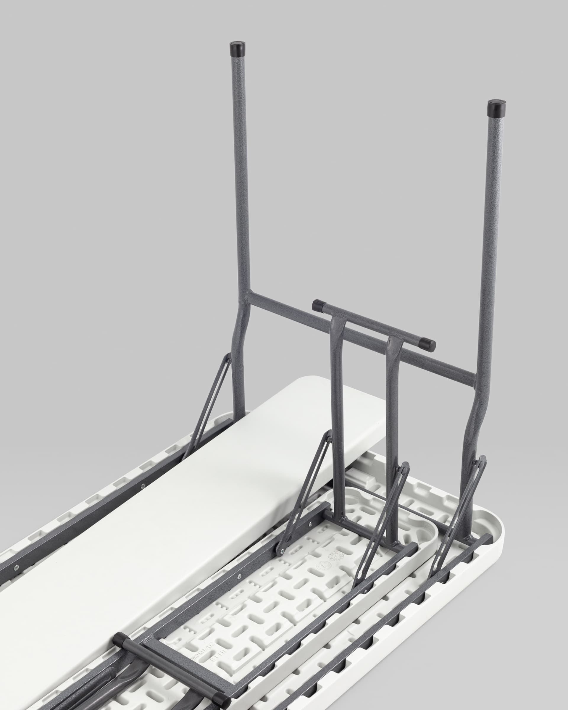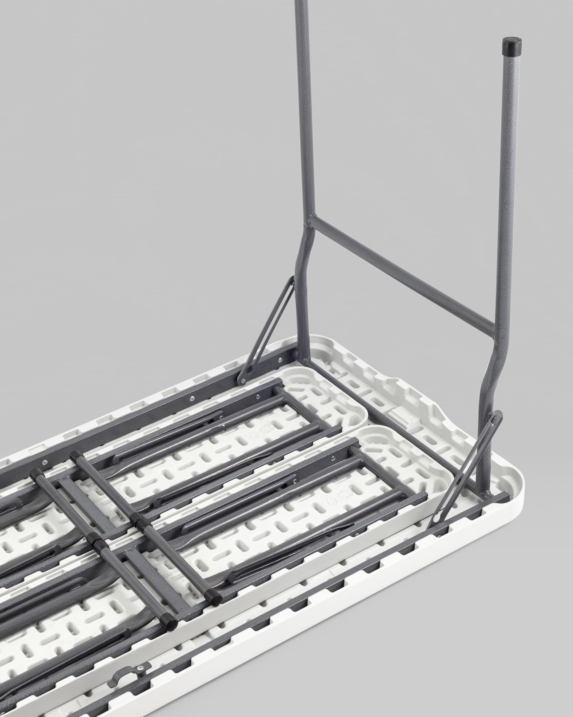 Для каркаса используется стальная труба особой прочности, а столешница выполнена из 100% не переработанного полиэтилена HDPE (полиэтилен высокой плотности). Считается одним из более безопасных видов пластика. HDPE пластик выдерживает высокие нагрузки, не трескается при ударной нагрузке, эластичен в диапазоне температур от –70 до +100 °С.