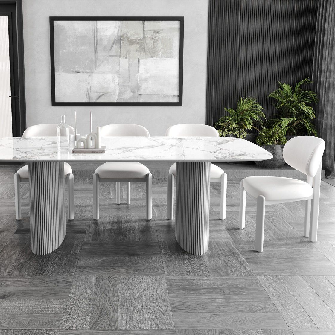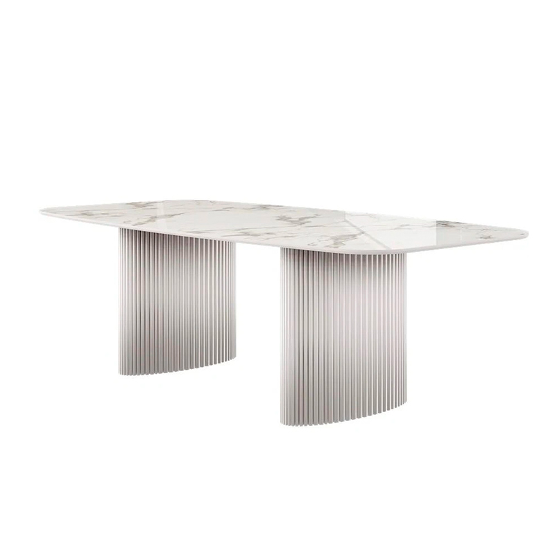 Стол оснащен прямоугольной столешницей с закругленными углами, с керамическим покрытием 6 мм, что обеспечивает прочность и устойчивость к царапинам и пятнам. Опора стола выполнена из МДФ, покрытого натуральным шпоном, что добавляет изделию элегантности и гармонично вписывается в современные и классические интерьеры.