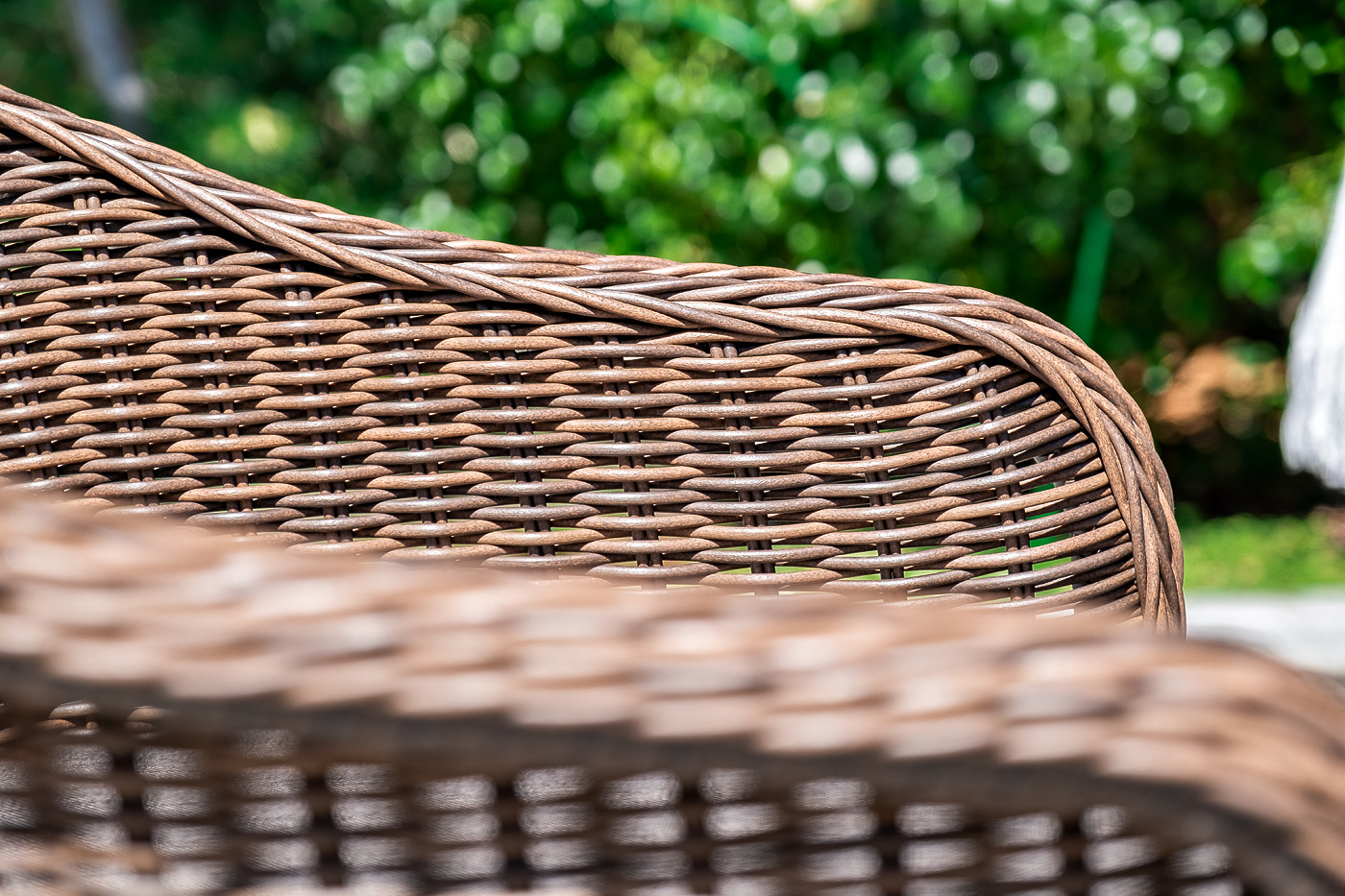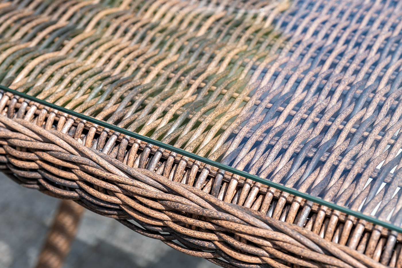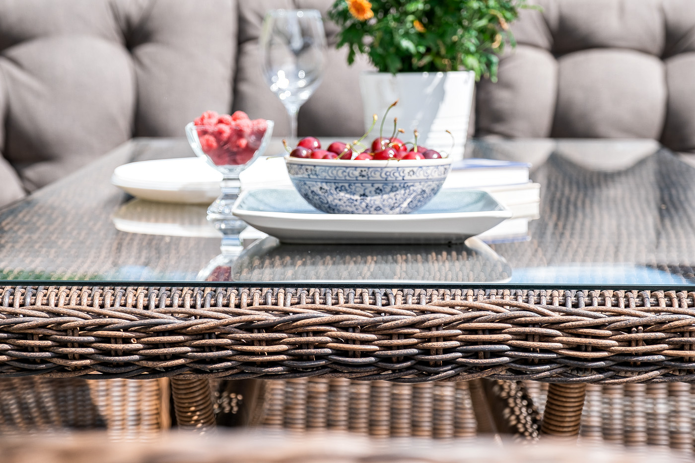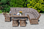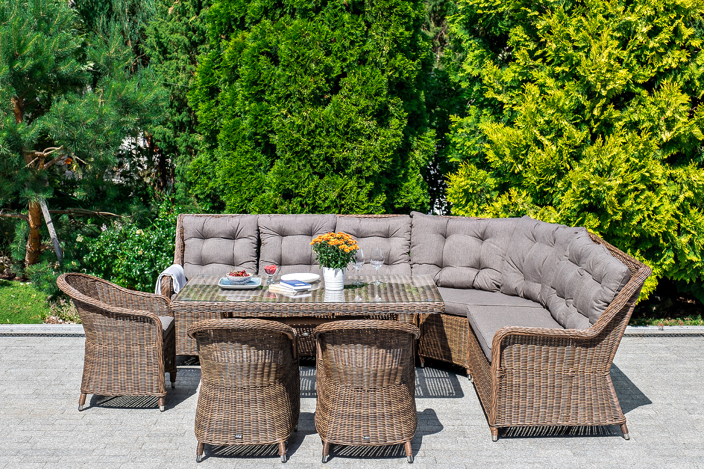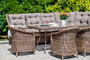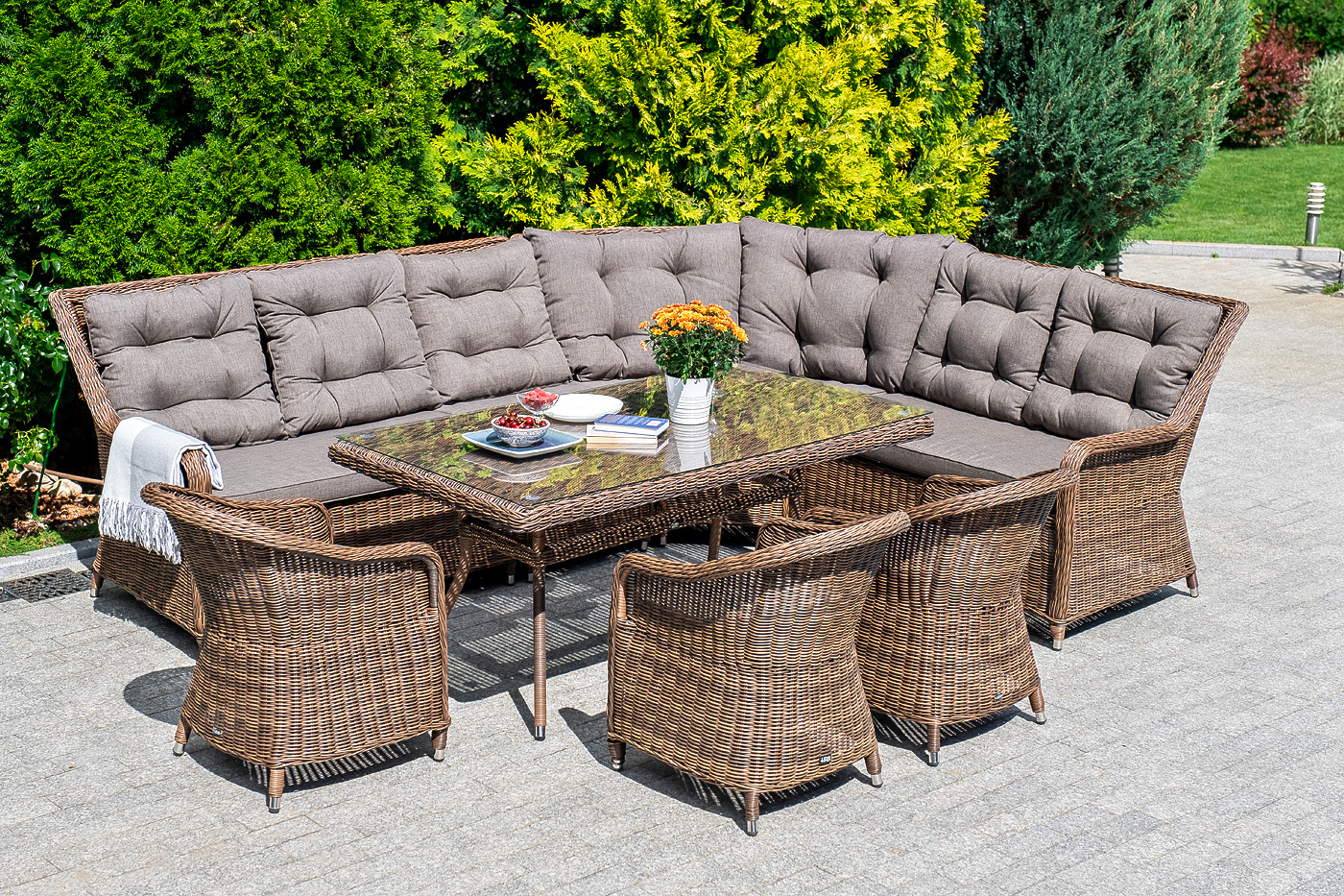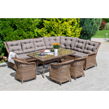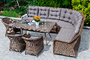 Угловая модульная лаунж-зона с обеденным столом и тремя стульями. Искусственный ротанг, плетение круглое, цвет коричневый, алюминиевый каркас. Столешница из закаленого стекла 5 мм.