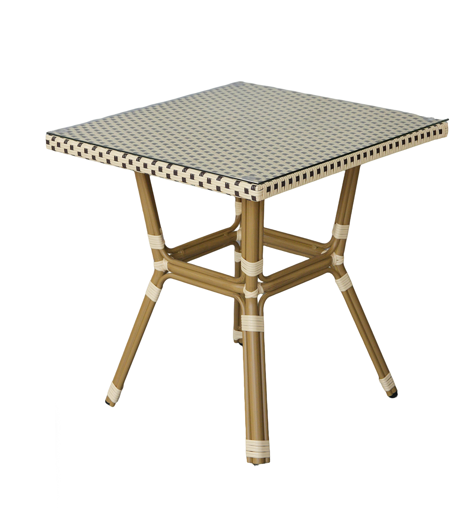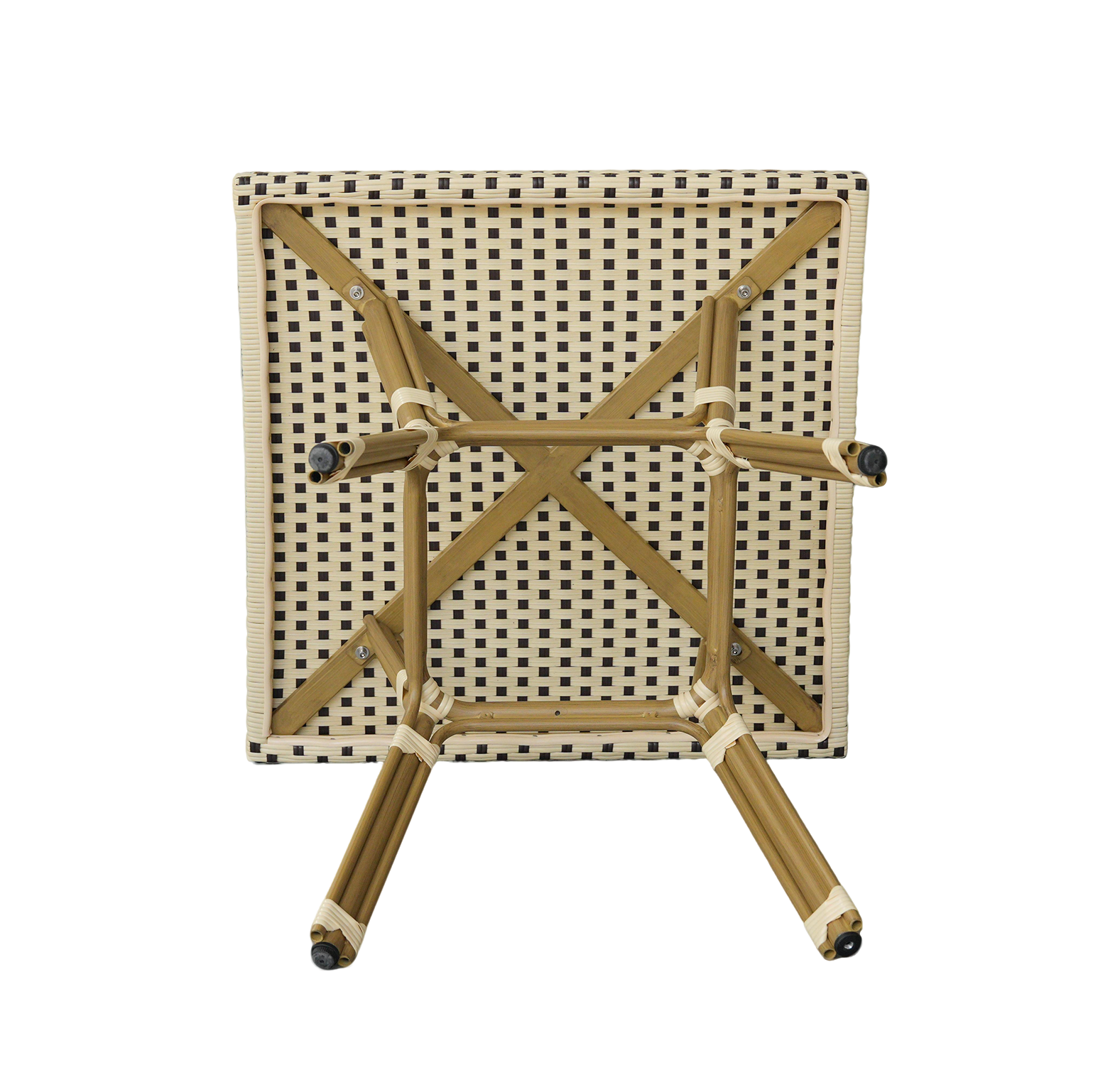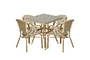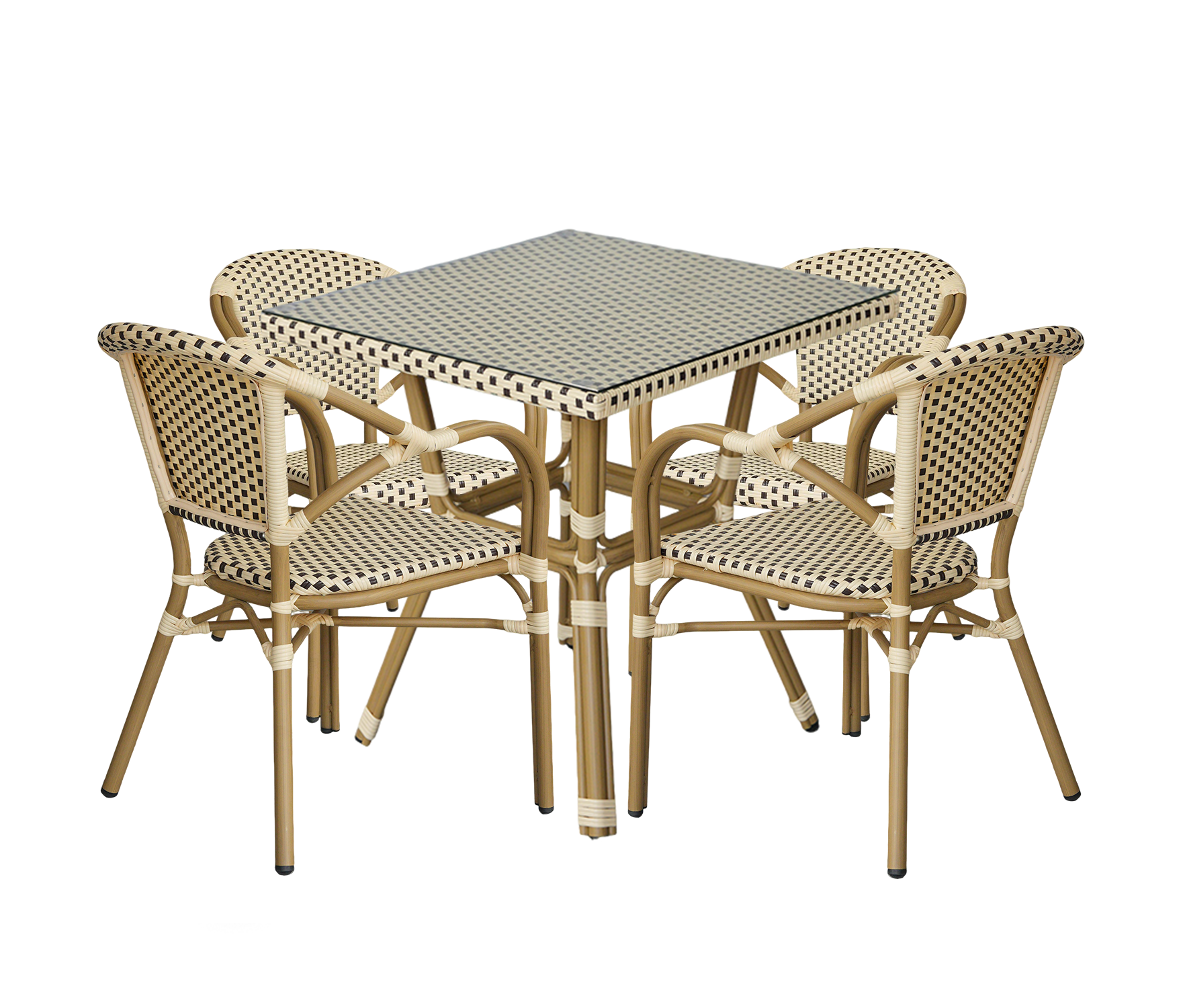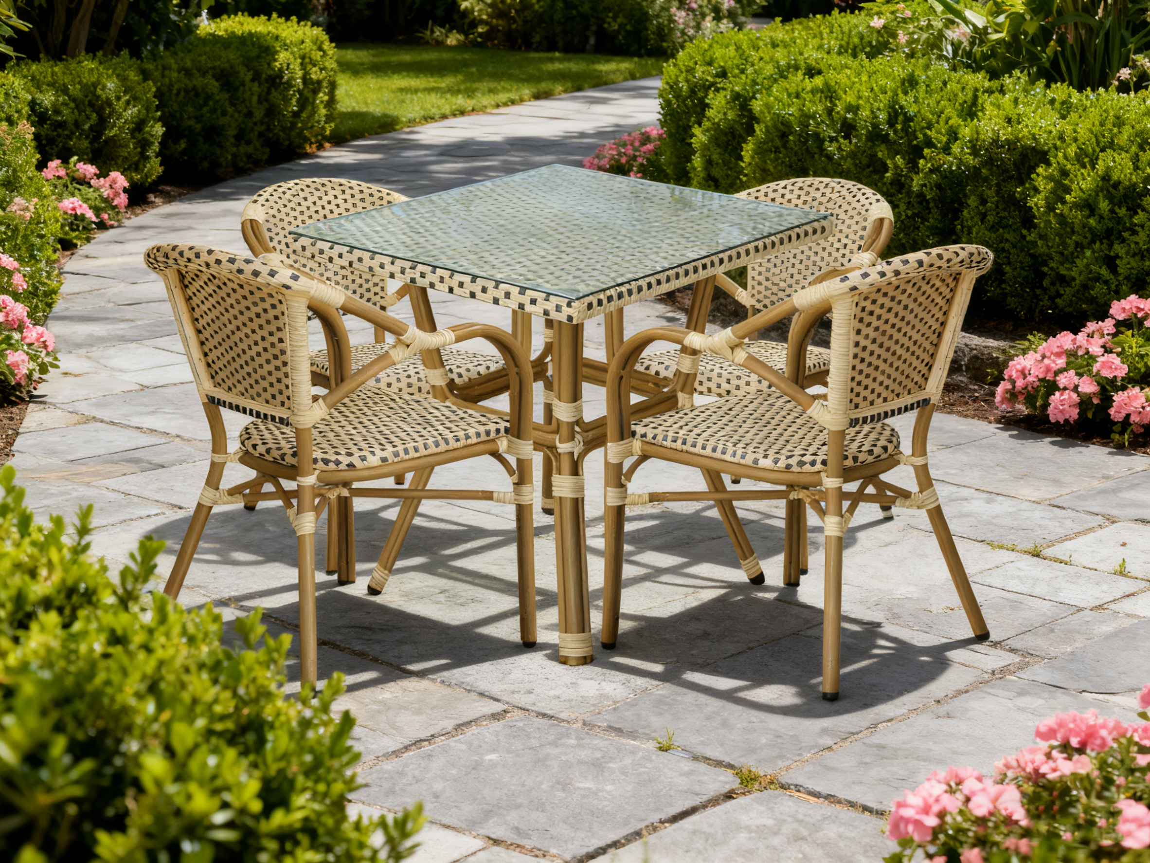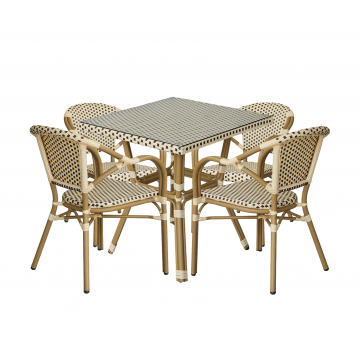В набор входят квадратный стол и четыре стула, объединённые единым дизайнерским решением: изысканное ручное плетение из плоского искусственного ротанга в бежево‑коричневой гамме эффектно дополняет прочный алюминиевый каркас с износостойким покрытием.