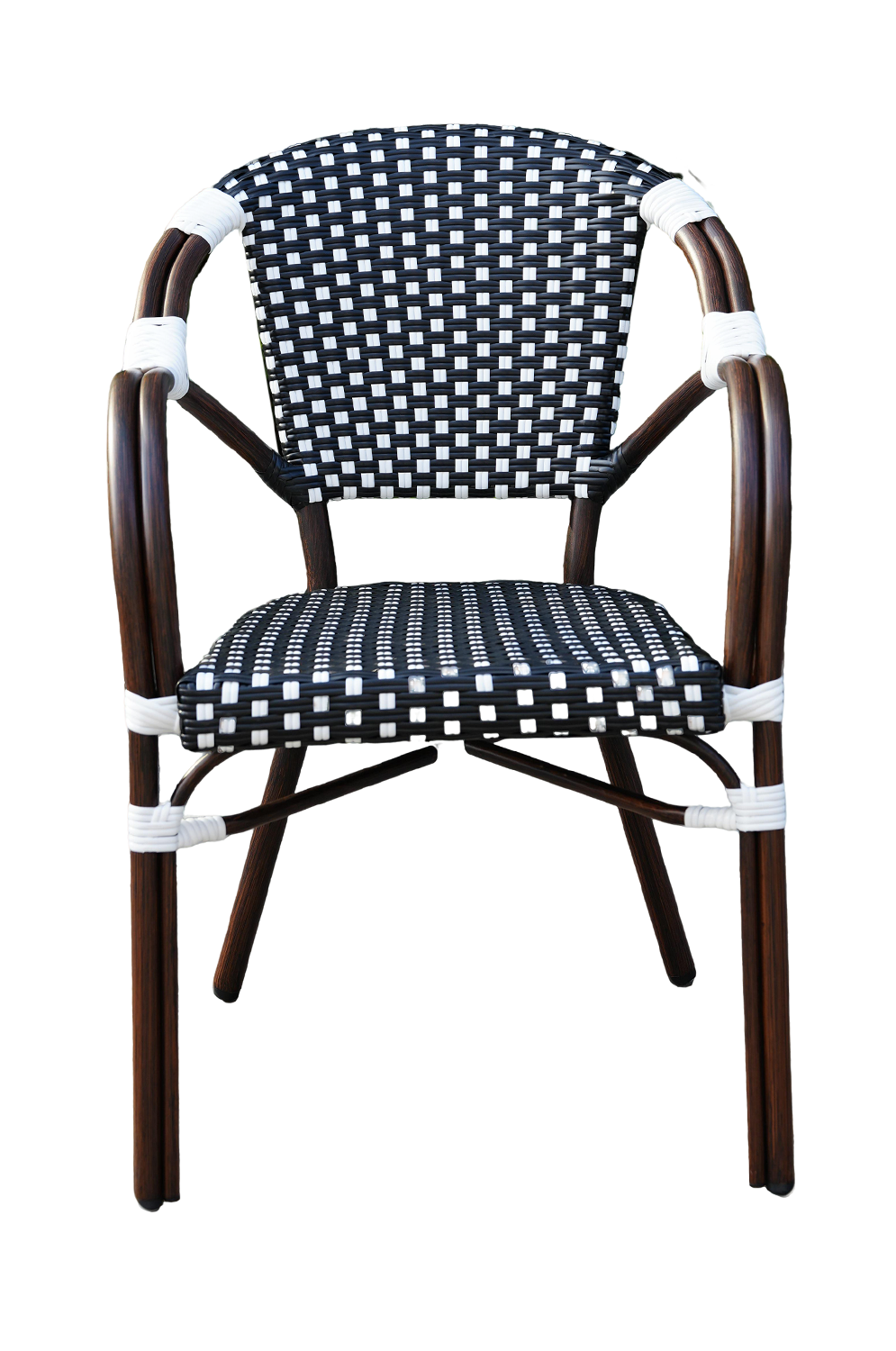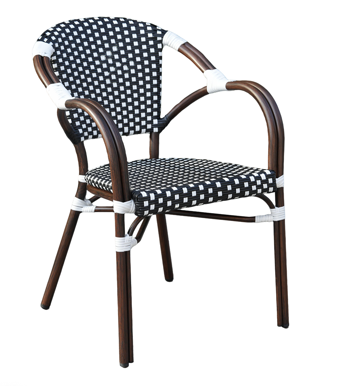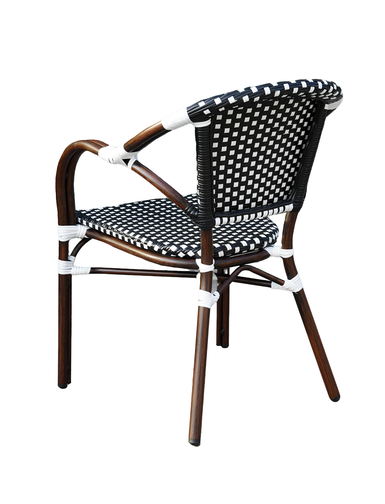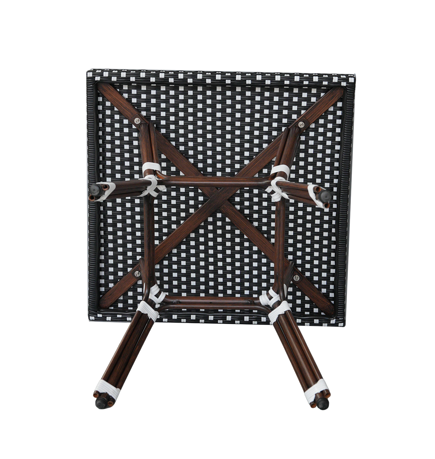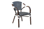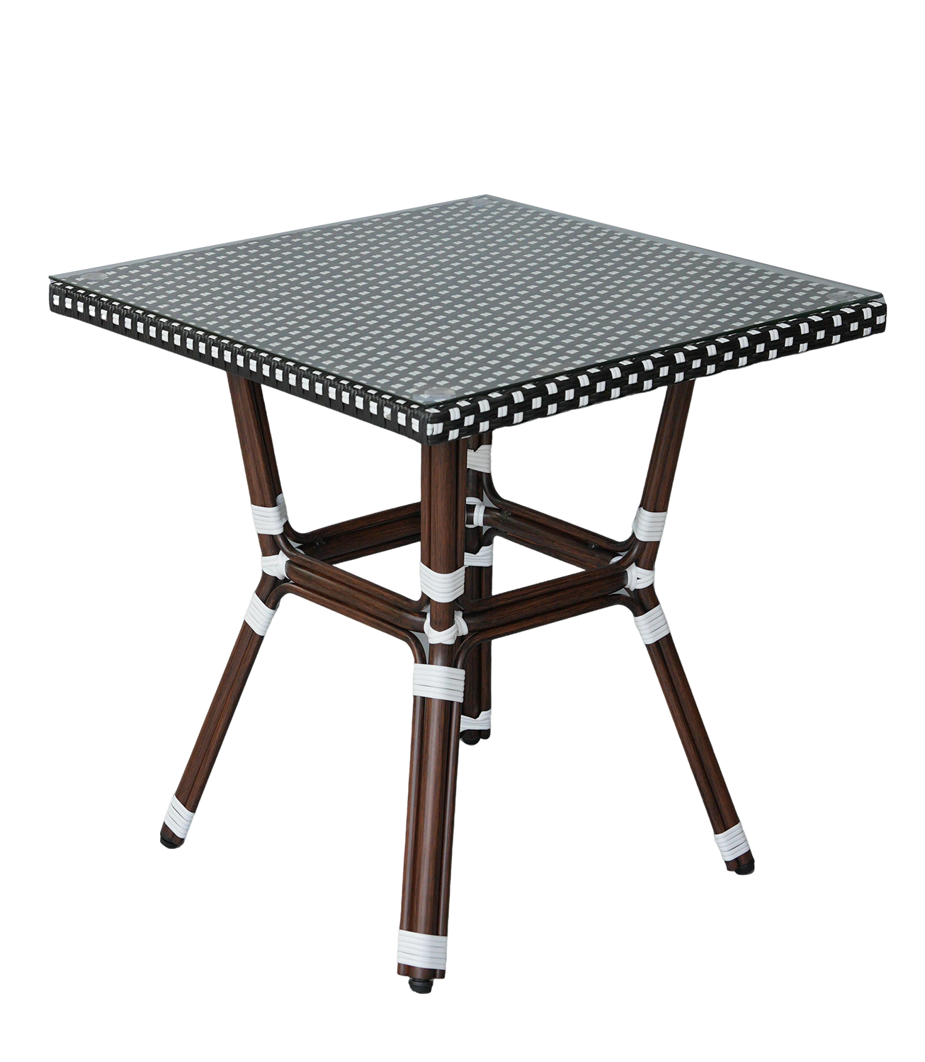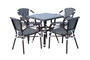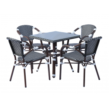 В набор входят квадратный стол и четыре стула, объединённые единым дизайнерским решением: изысканное ручное плетение из плоского искусственного ротанга в черно‑белой гамме эффектно дополняет прочный алюминиевый каркас с износостойким покрытием.