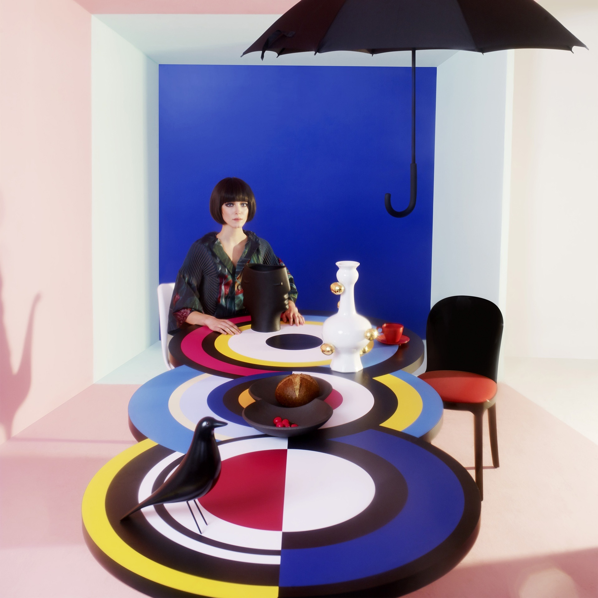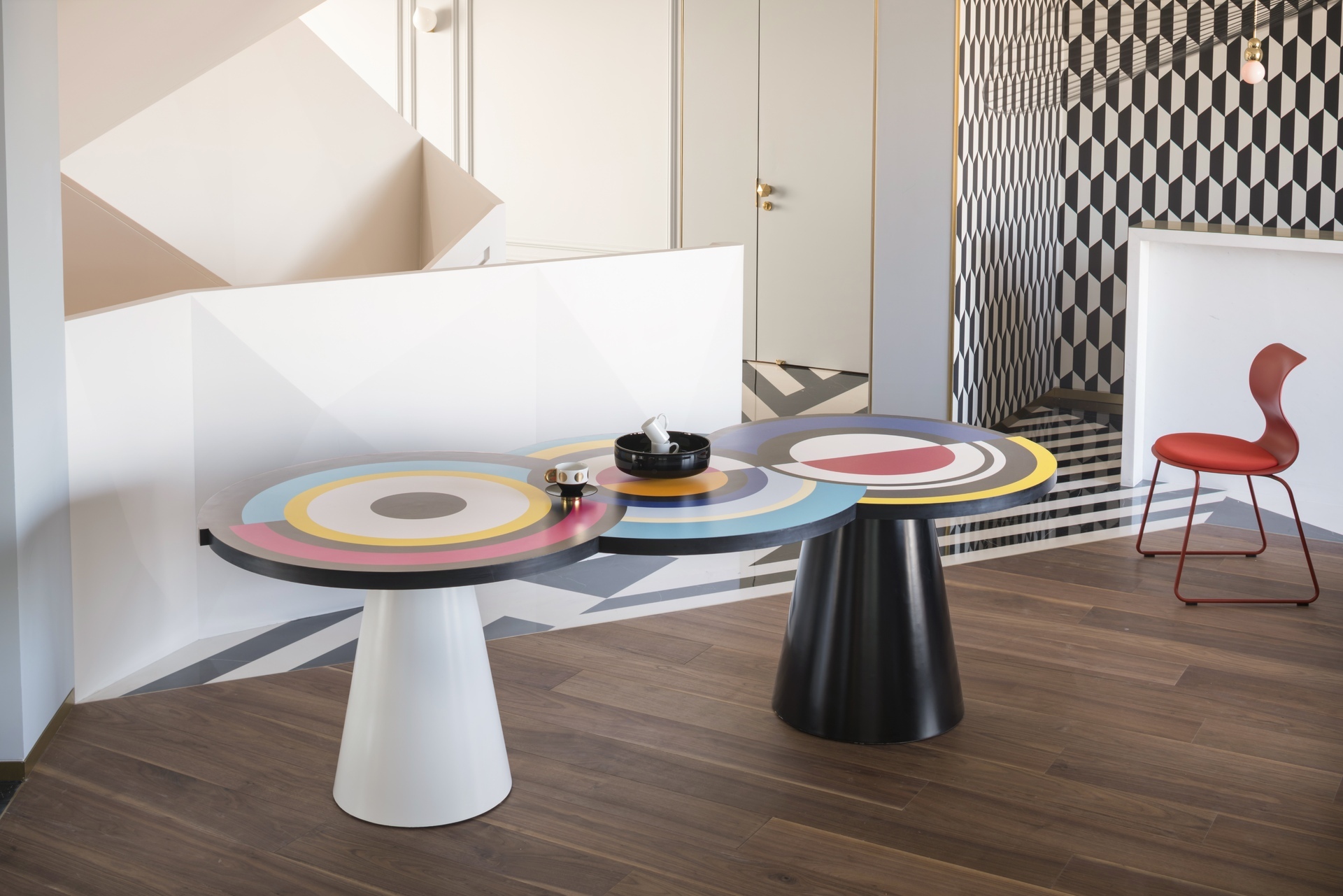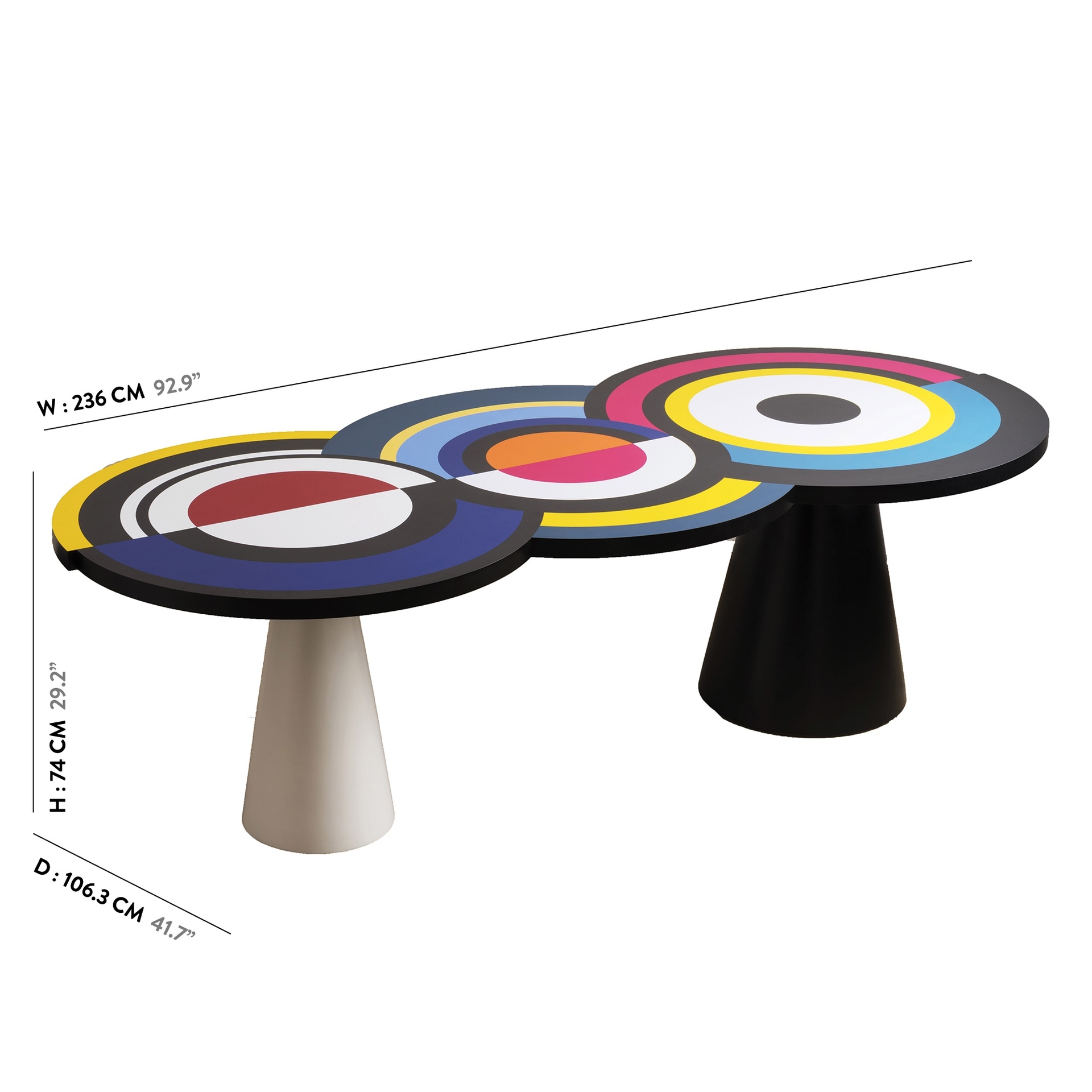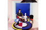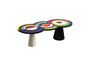 Вдохновленный ее картинами и абстрактным искусством, этот предмет мебели отличается от традиционного дизайна обеденного стола. Закрепленный на одной или двух конических цилиндрических ножках, столешница играет с движением. Она состоит из трех концентрических круга, каждый из которых состоит из широких цветовых полос, которые сливаются друг с другом. "Sonia et Ctera" привлекает внимание, где бы она ни была.