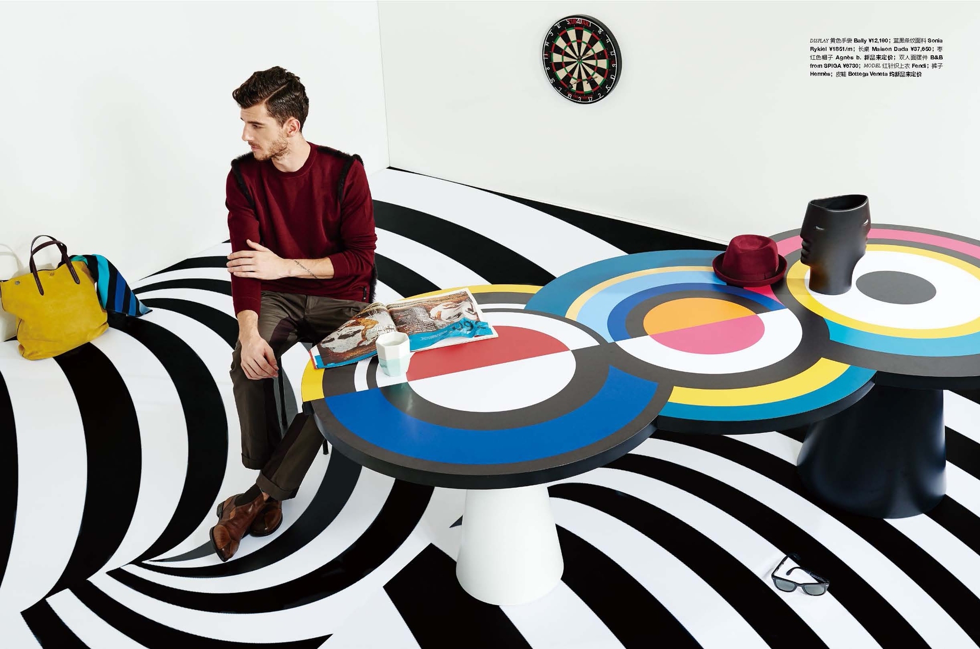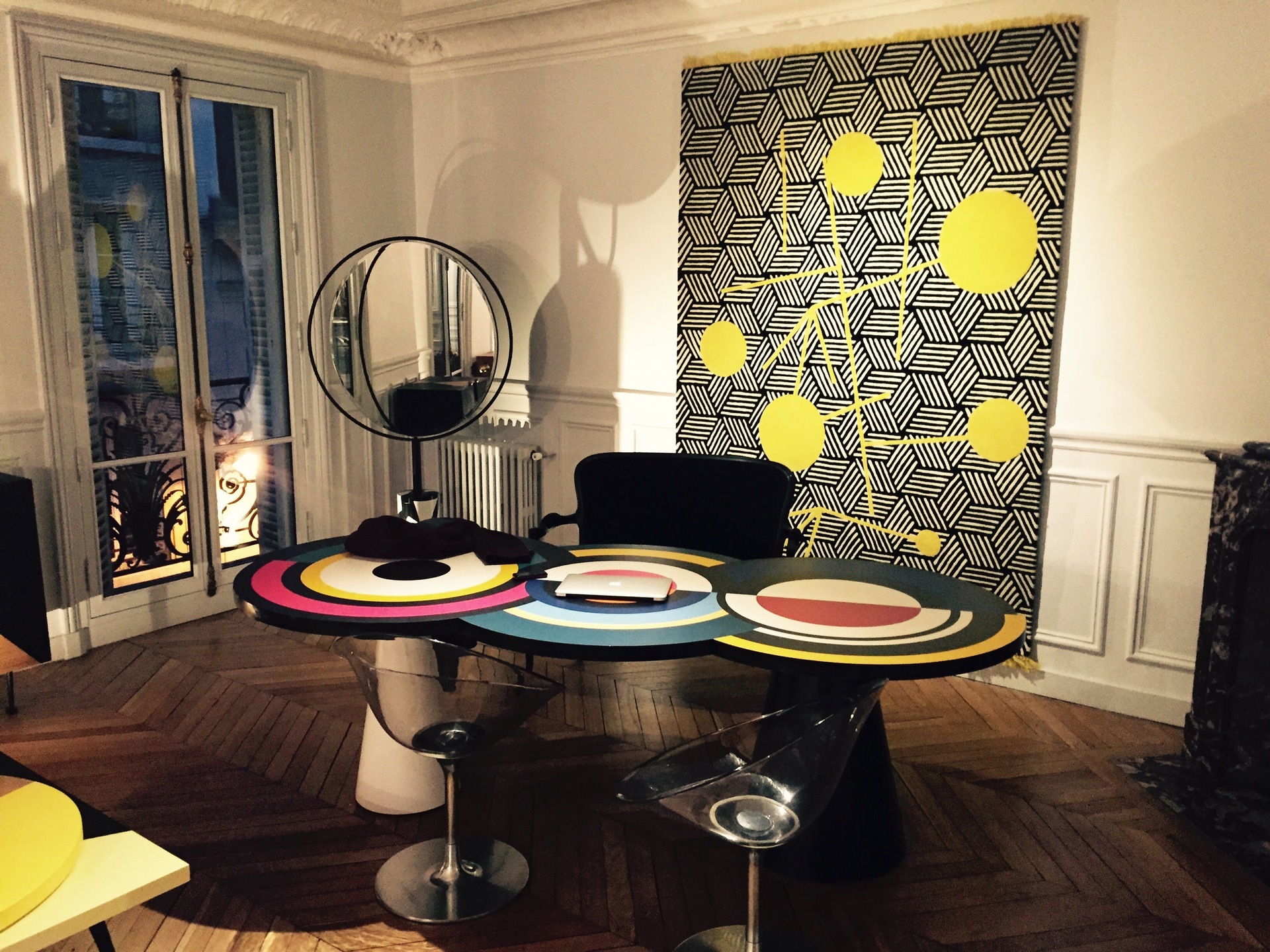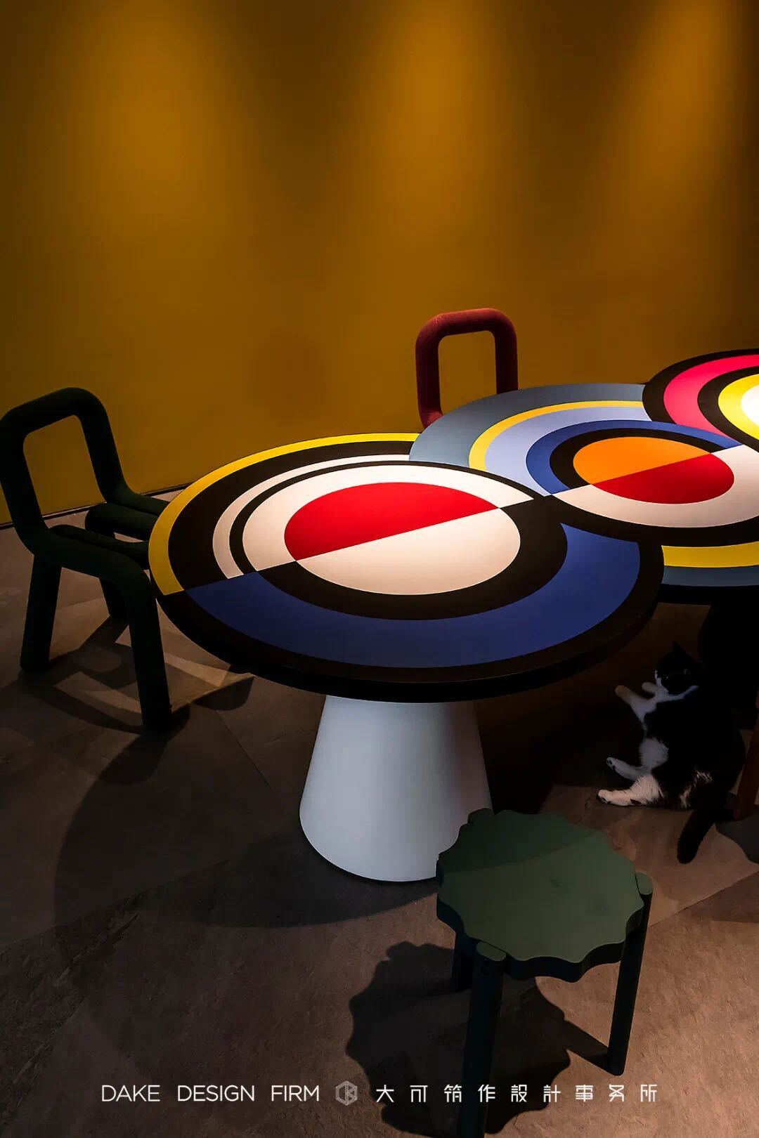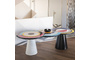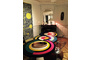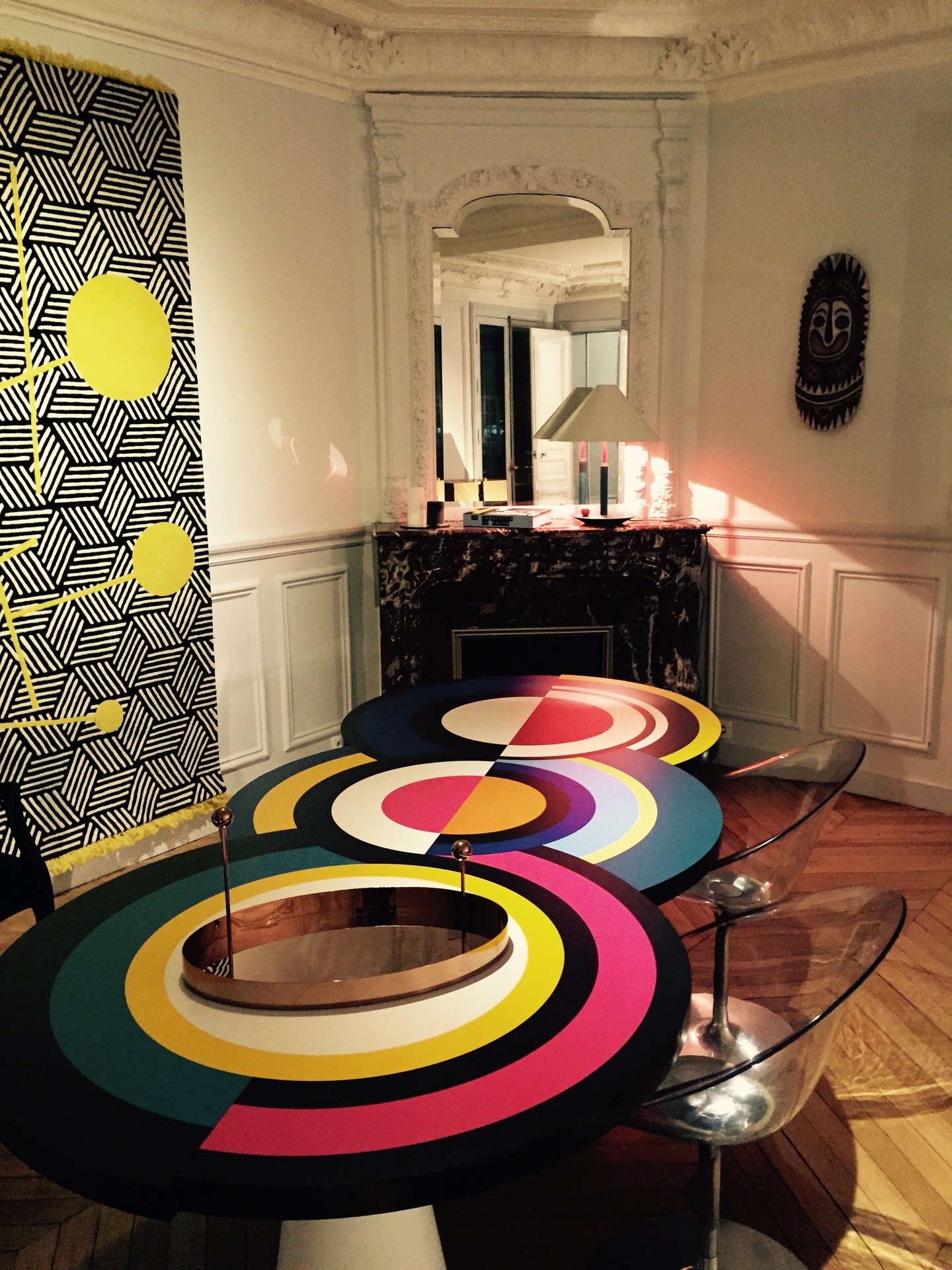 Вдохновленный ее картинами и абстрактным искусством, этот предмет мебели отличается от традиционного дизайна обеденного стола. Закрепленный на одной или двух конических цилиндрических ножках, столешница играет с движением. Она состоит из трех концентрических круга, каждый из которых состоит из широких цветовых полос, которые сливаются друг с другом. "Sonia et Ctera" привлекает внимание, где бы она ни была.