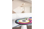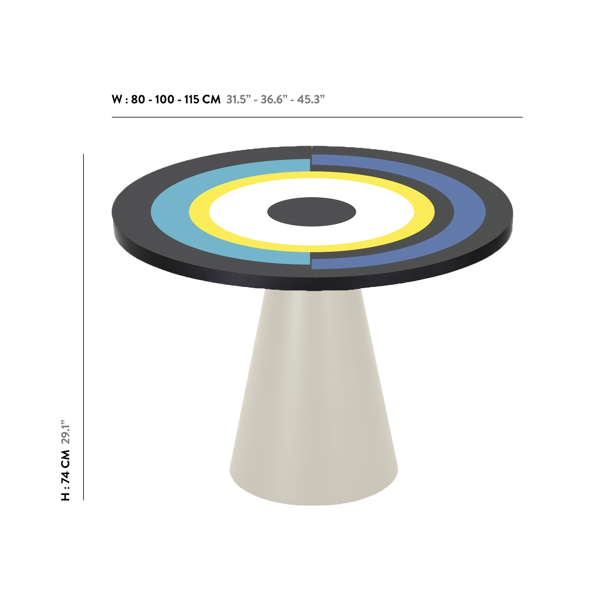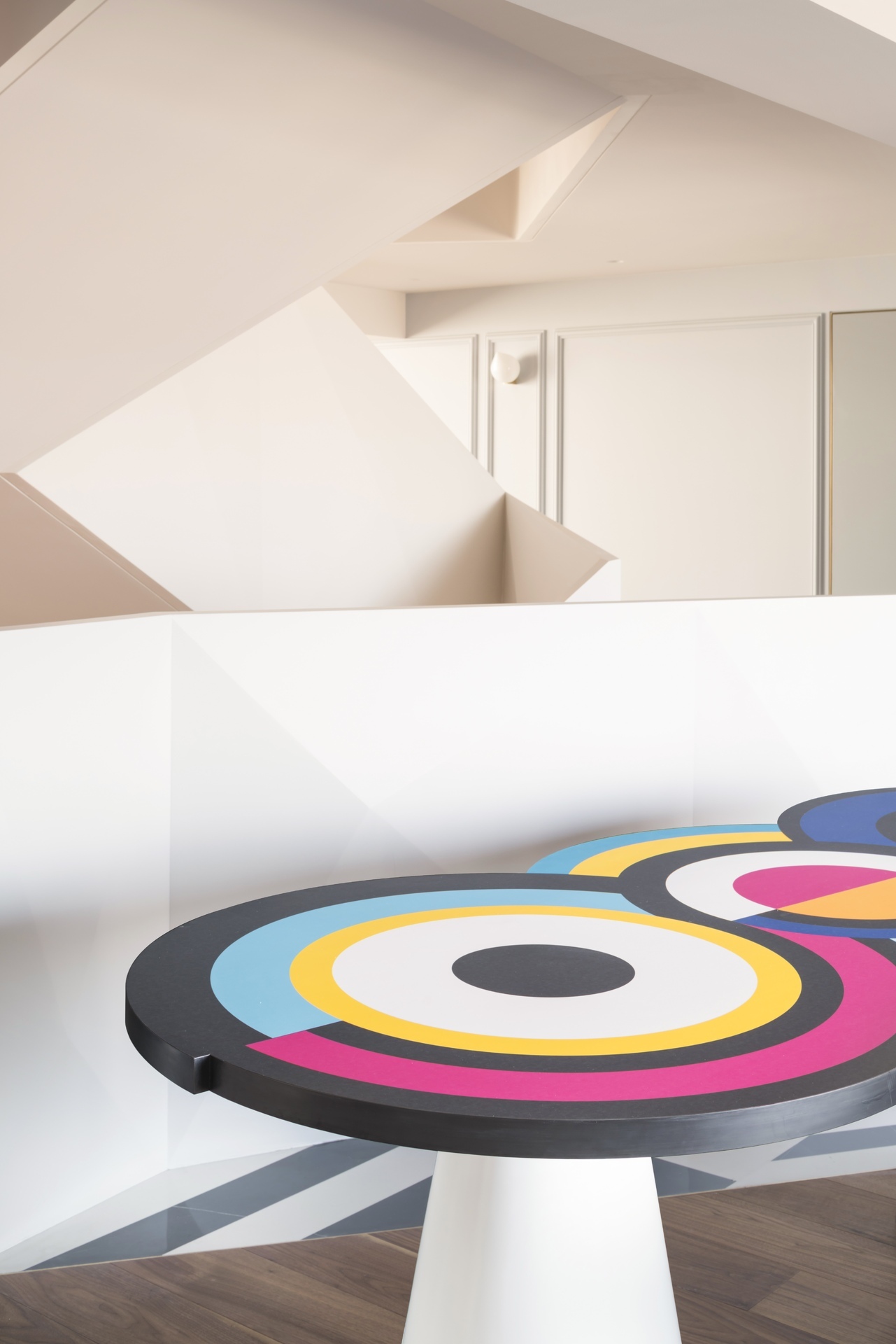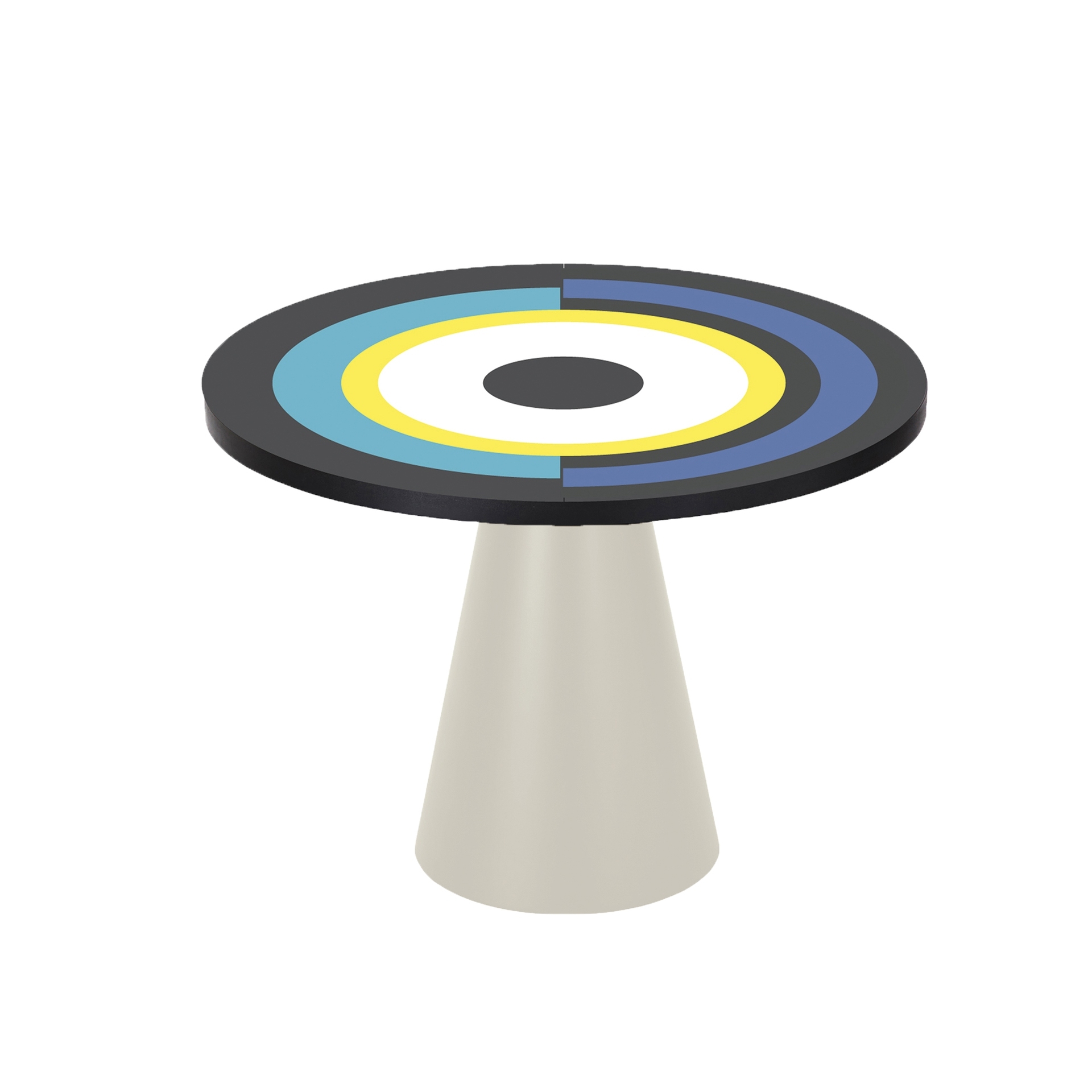 Вдохновленный ее картинами и абстрактным искусством, этот предмет мебели отличается от традиционного дизайна обеденного стола. Закрепленный на одной или двух конических цилиндрических ножках, столешница играет с движением. Она состоит из трех концентрических круга, каждый из которых состоит из широких цветовых полос, которые сливаются друг с другом. "Sonia et Ctera" привлекает внимание, где бы она ни была.