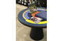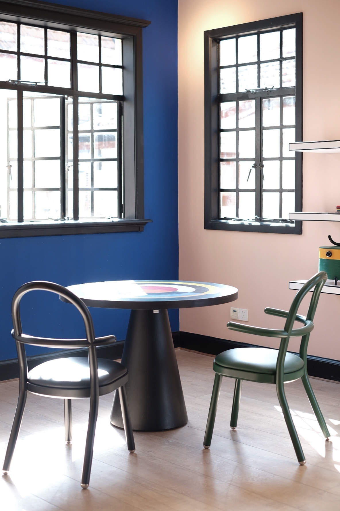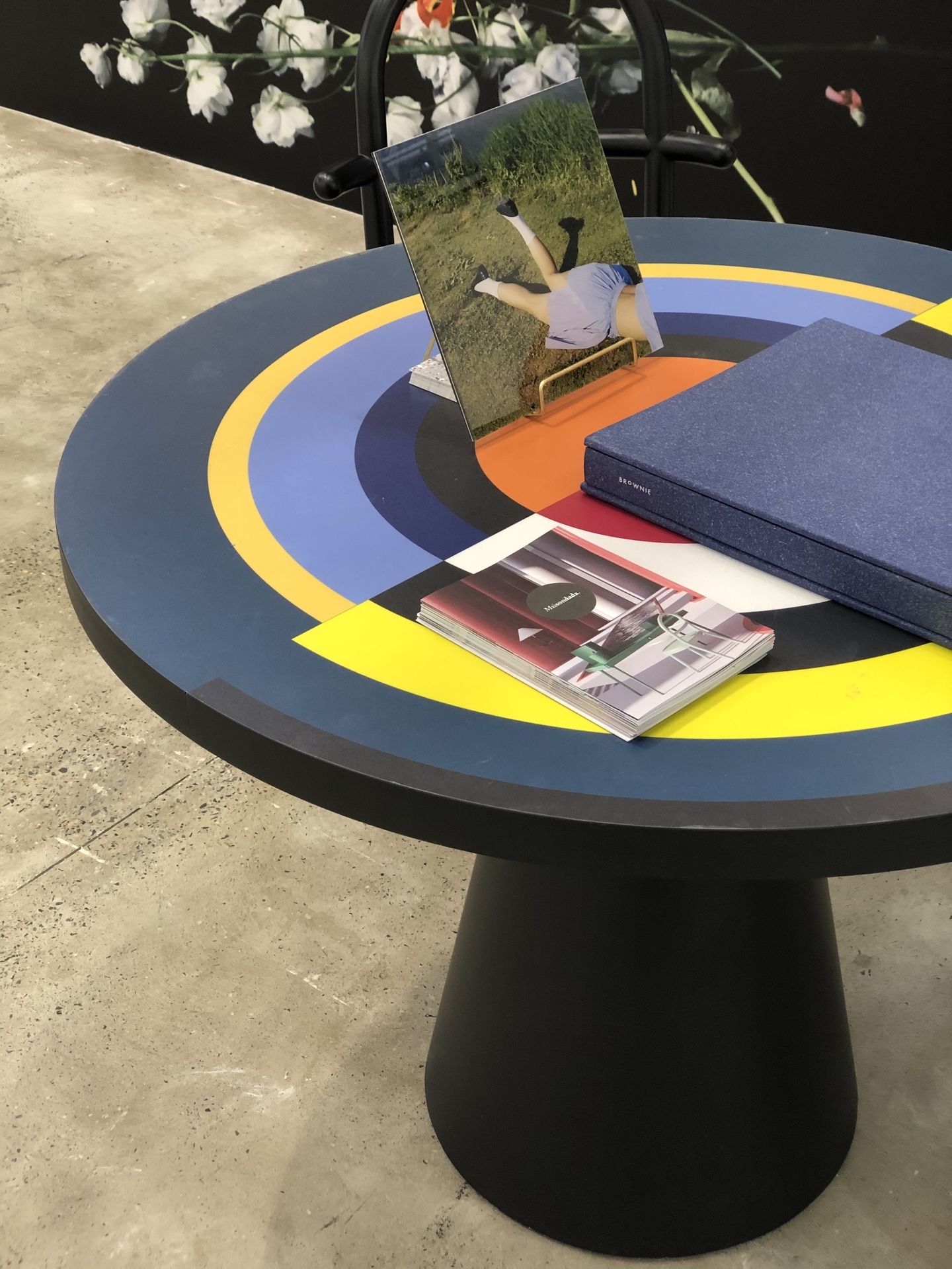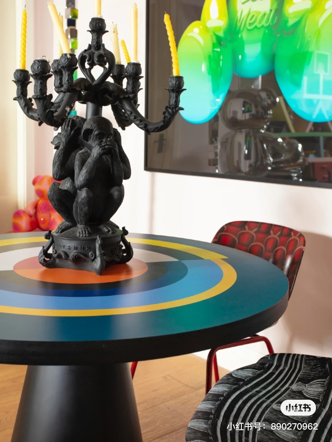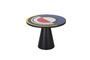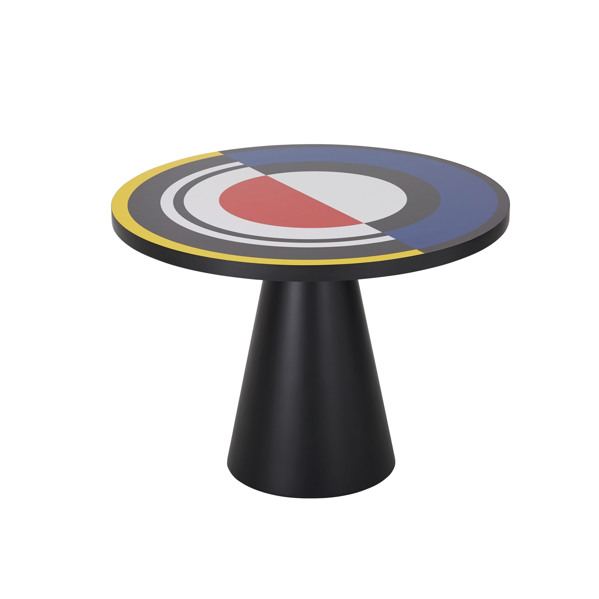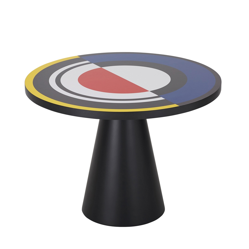 Вдохновленный ее картинами и абстрактным искусством, этот предмет мебели отличается от традиционного дизайна обеденного стола. Закрепленный на одной или двух конических цилиндрических ножках, столешница играет с движением. Она состоит из трех концентрических круга, каждый из которых состоит из широких цветовых полос, которые сливаются друг с другом. "Sonia et Ctera" привлекает внимание, где бы она ни была.