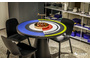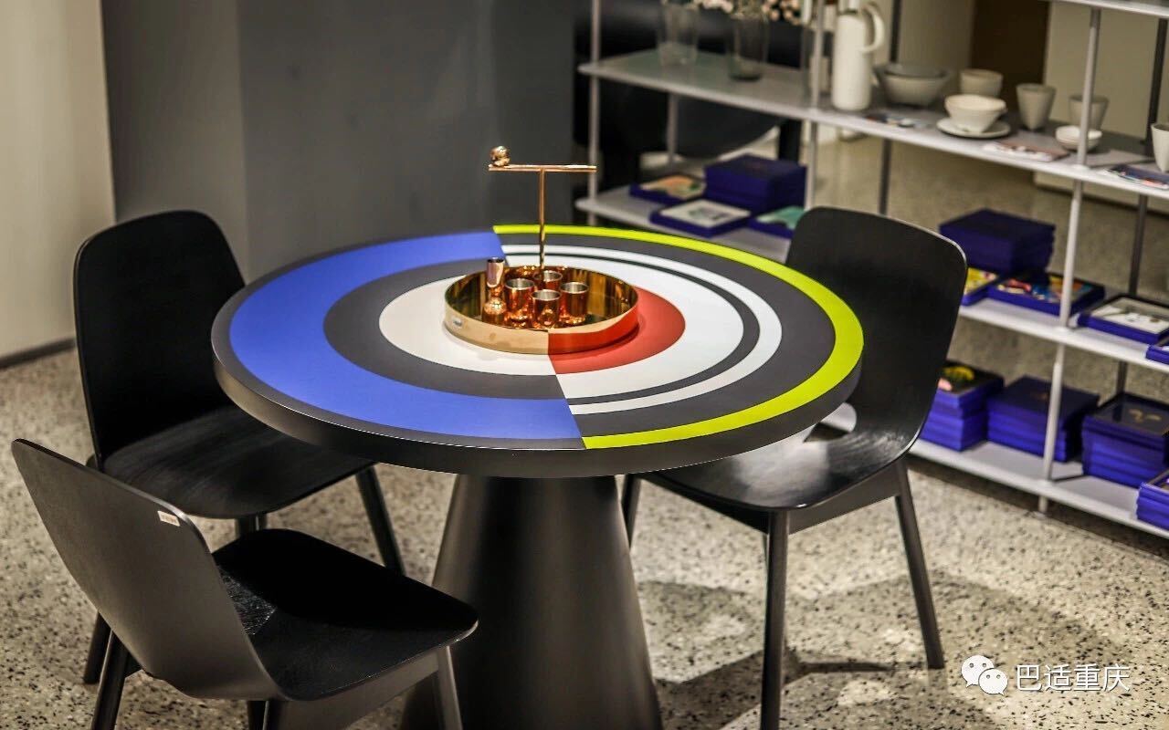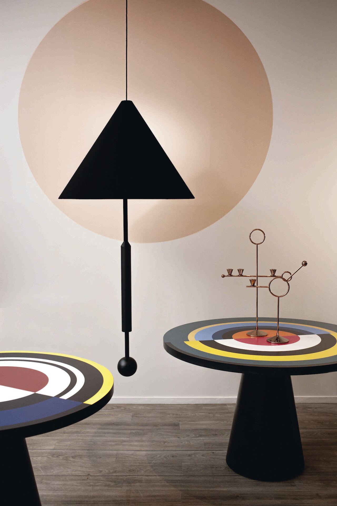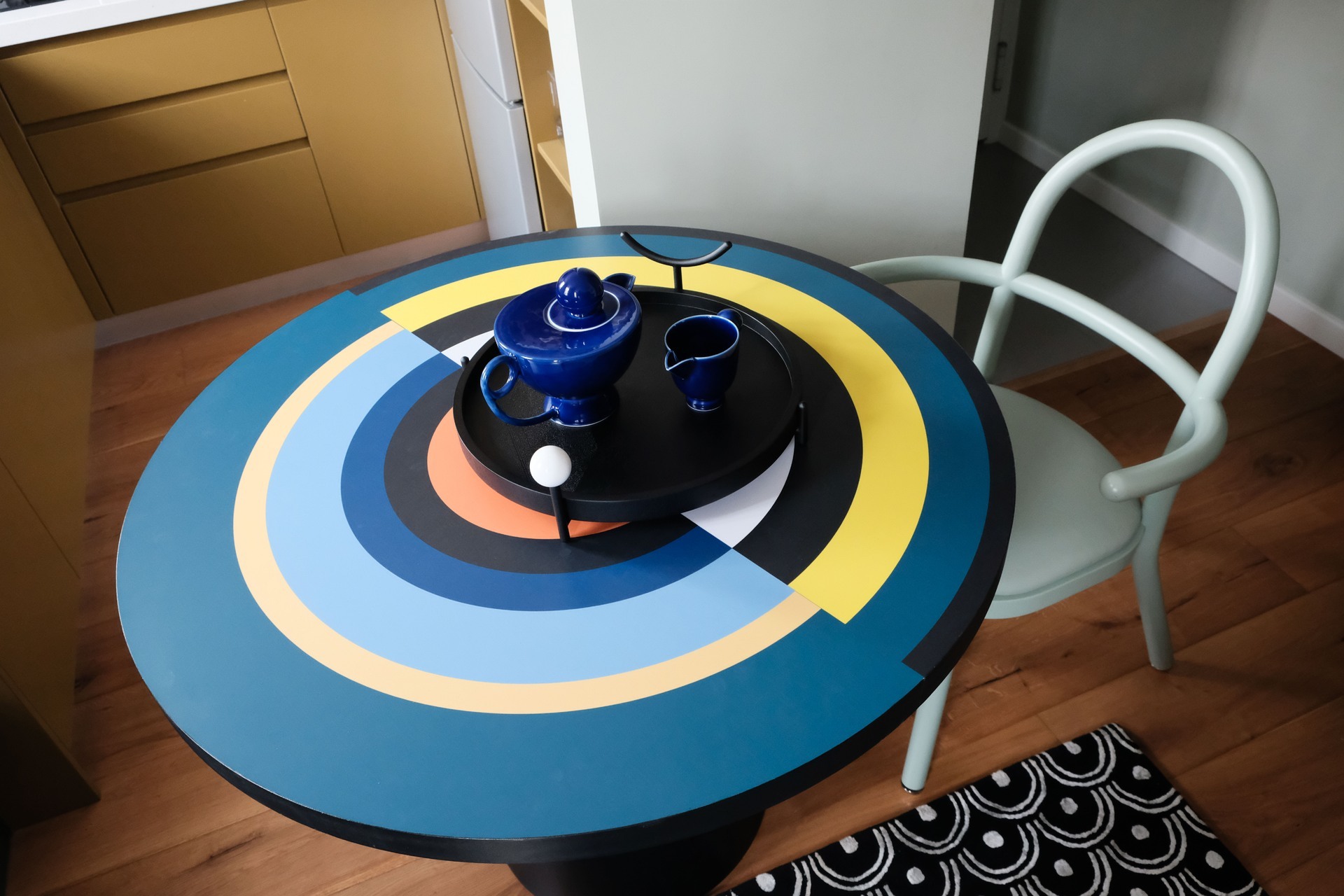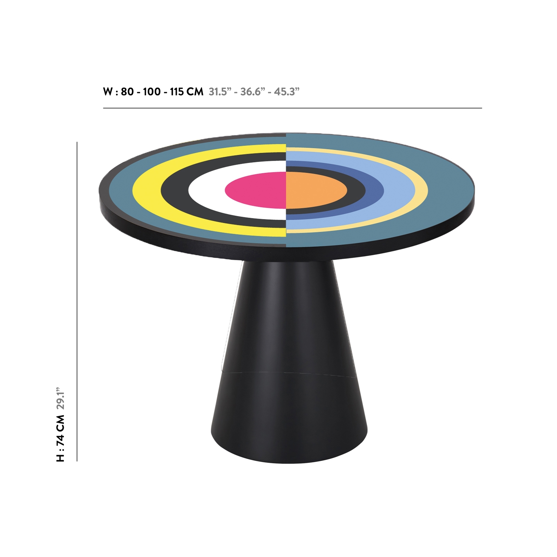 Вдохновленный ее картинами и абстрактным искусством, этот предмет мебели отличается от традиционного дизайна обеденного стола. Закрепленный на одной или двух конических цилиндрических ножках, столешница играет с движением. Она состоит из трех концентрических круга, каждый из которых состоит из широких цветовых полос, которые сливаются друг с другом. "Sonia et Ctera" привлекает внимание, где бы она ни была.