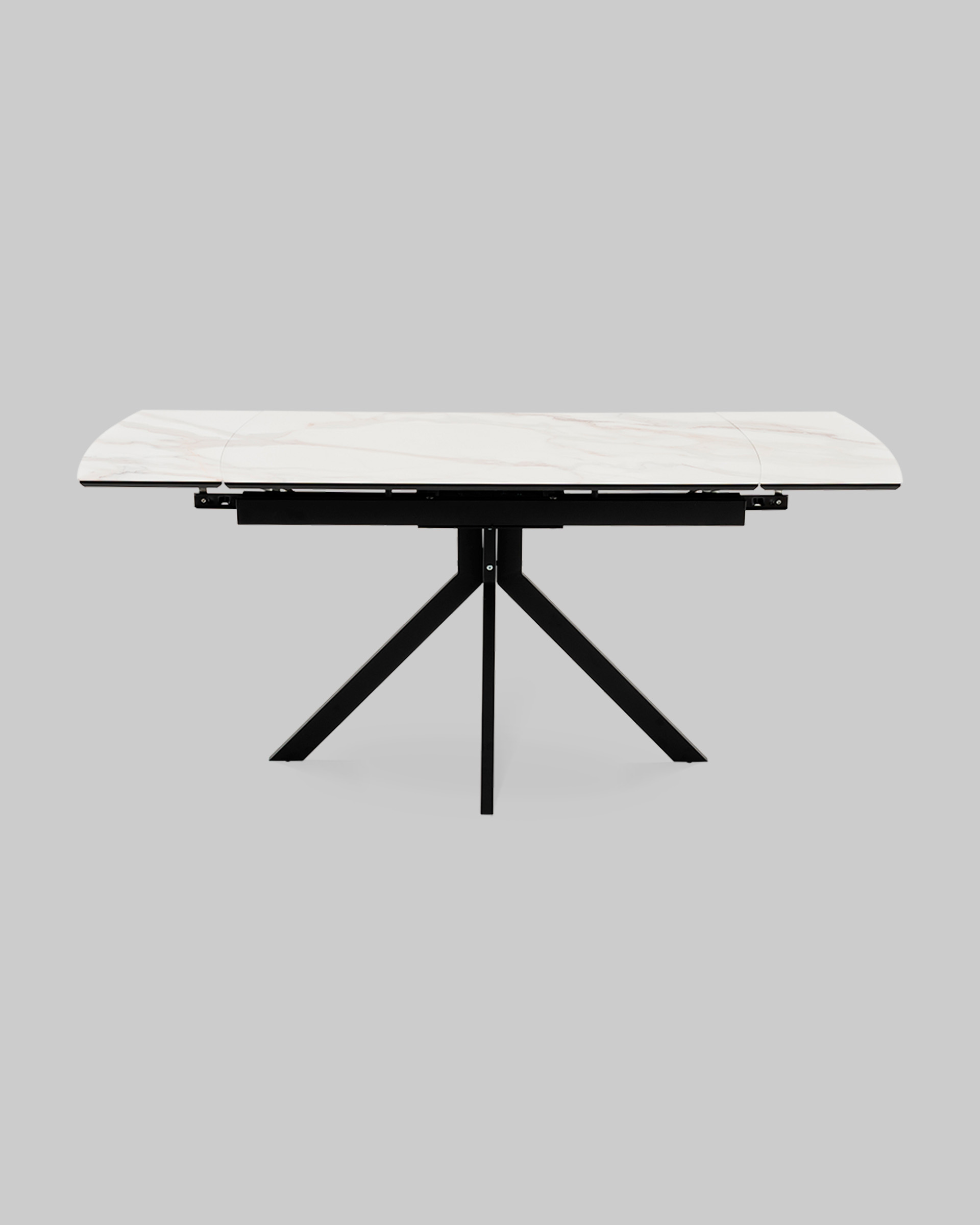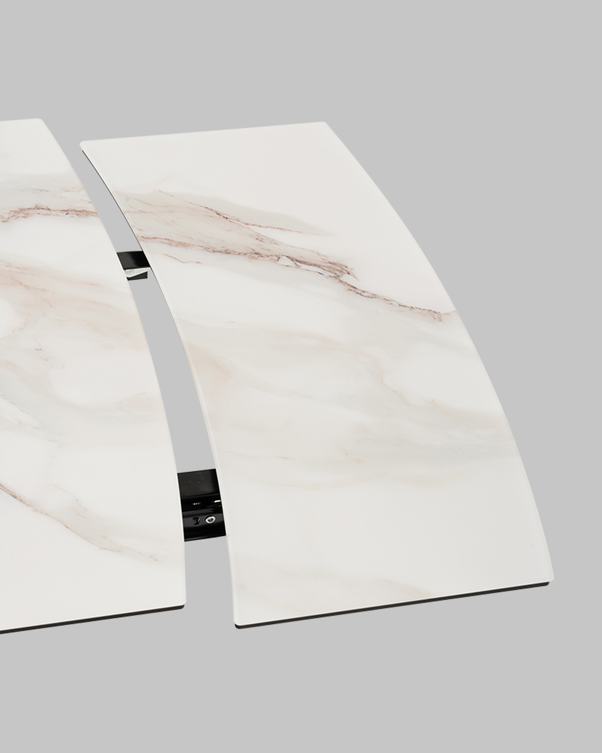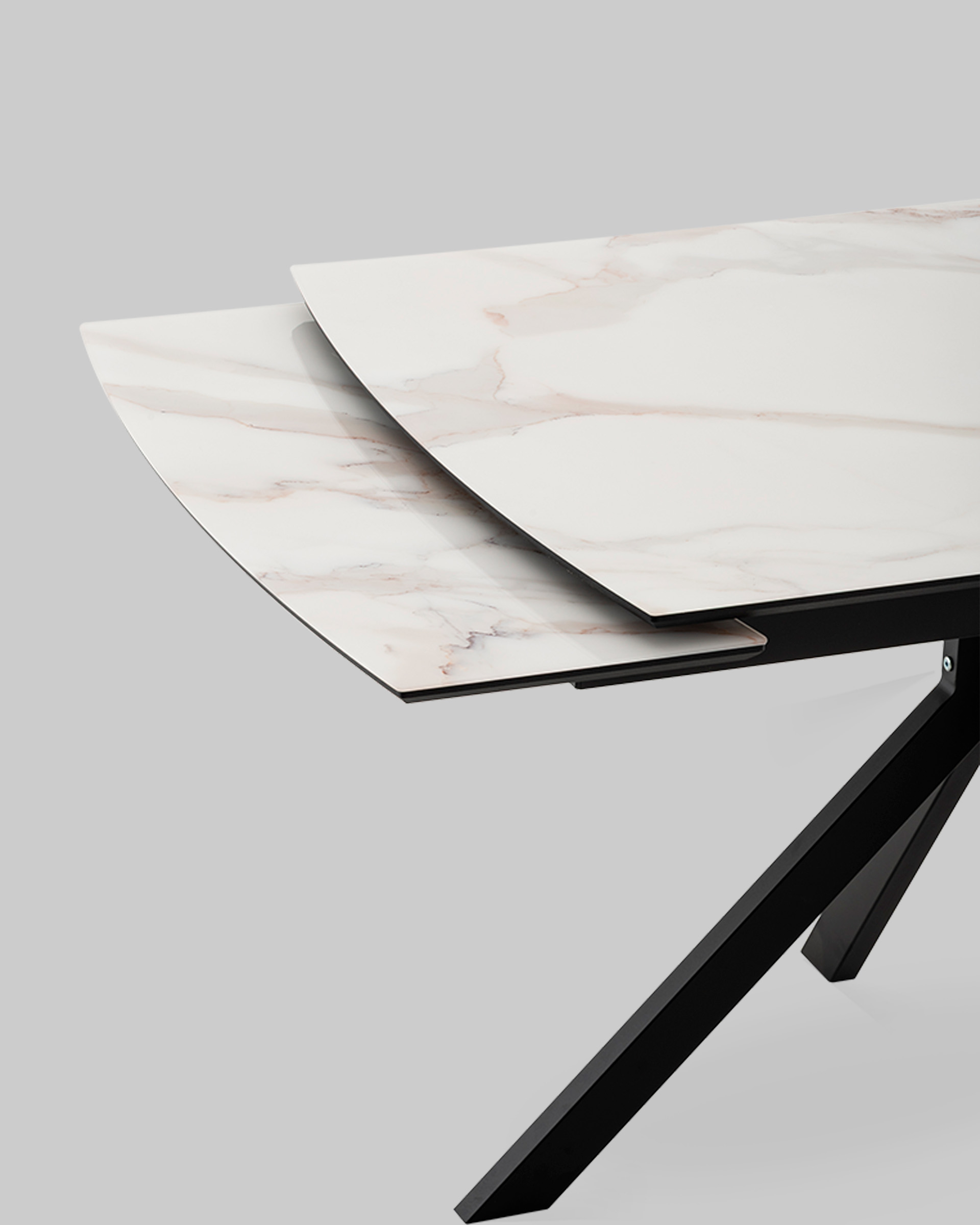 Стол обеденный раскладной Галац привлекает внимание эффектной столешницей из закалённого стекла с мраморным рисунком. Такой дизайн имитирует натуральный камень и придаёт столу дорогой, изысканный вид, делая его ярким акцентом в интерьере.