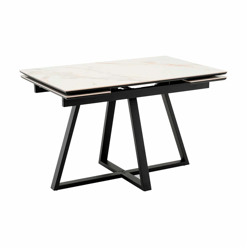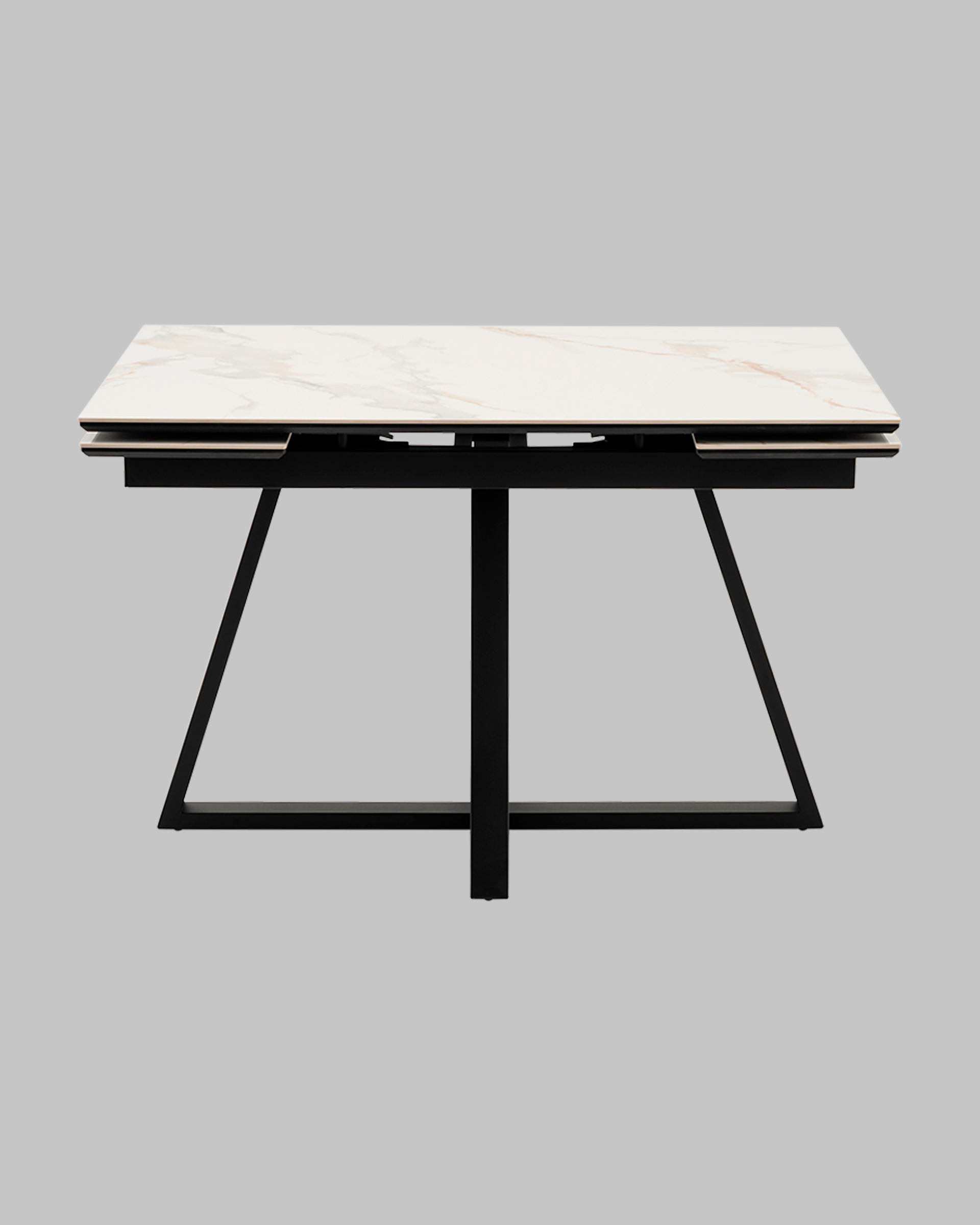 Стол Кассика привлекает сдержанным, но выразительным обликом. Столешница из белой керамики с тонким мраморным рисунком выглядит изысканно и свежо, добавляя интерьеру светлый, утончённый акцент. Чёрное металлическое основание выполнено в виде геометричной рамы с пересекающимися линиями, подчёркивая современный характер модели и придавая конструкции визуальную лёгкость.