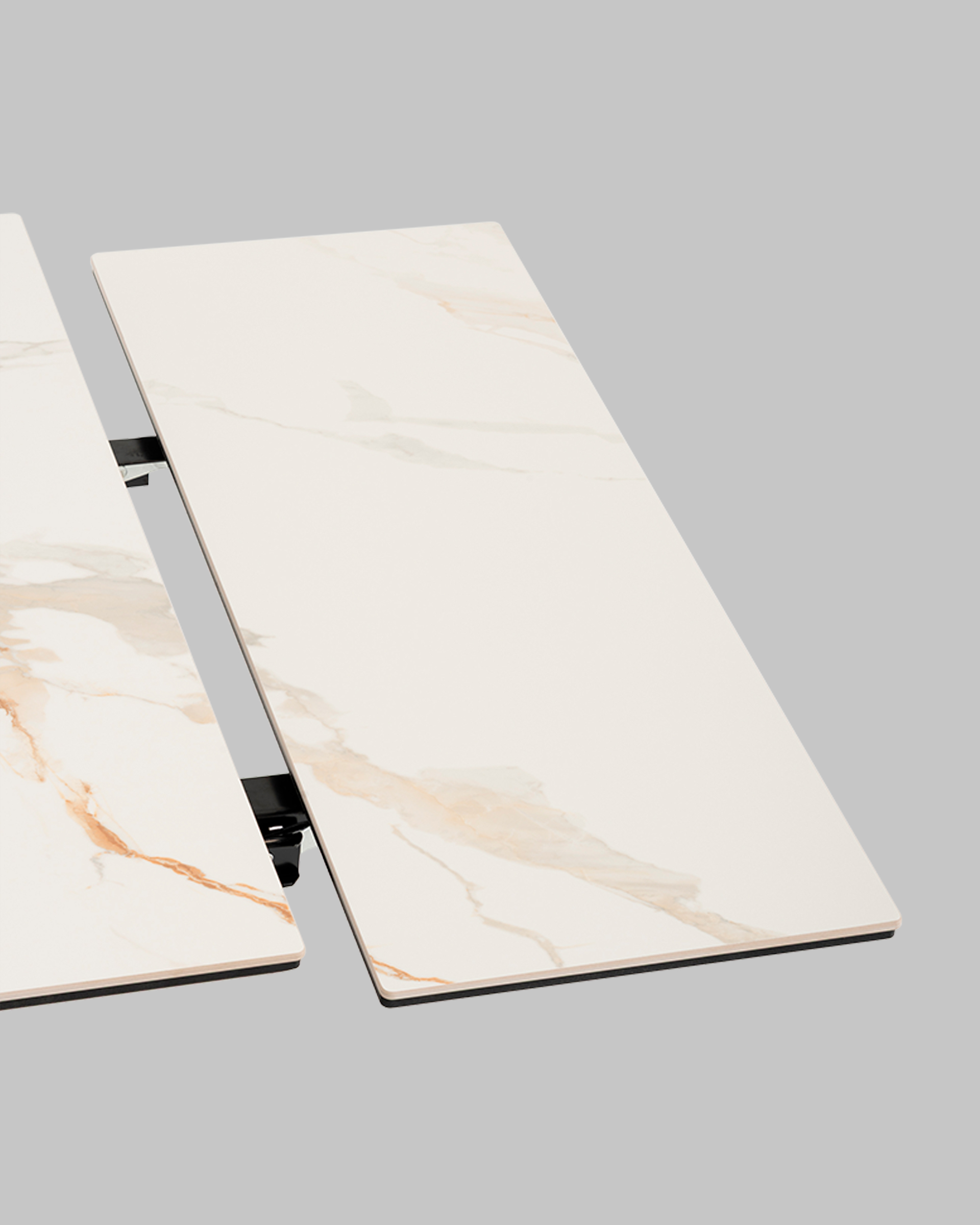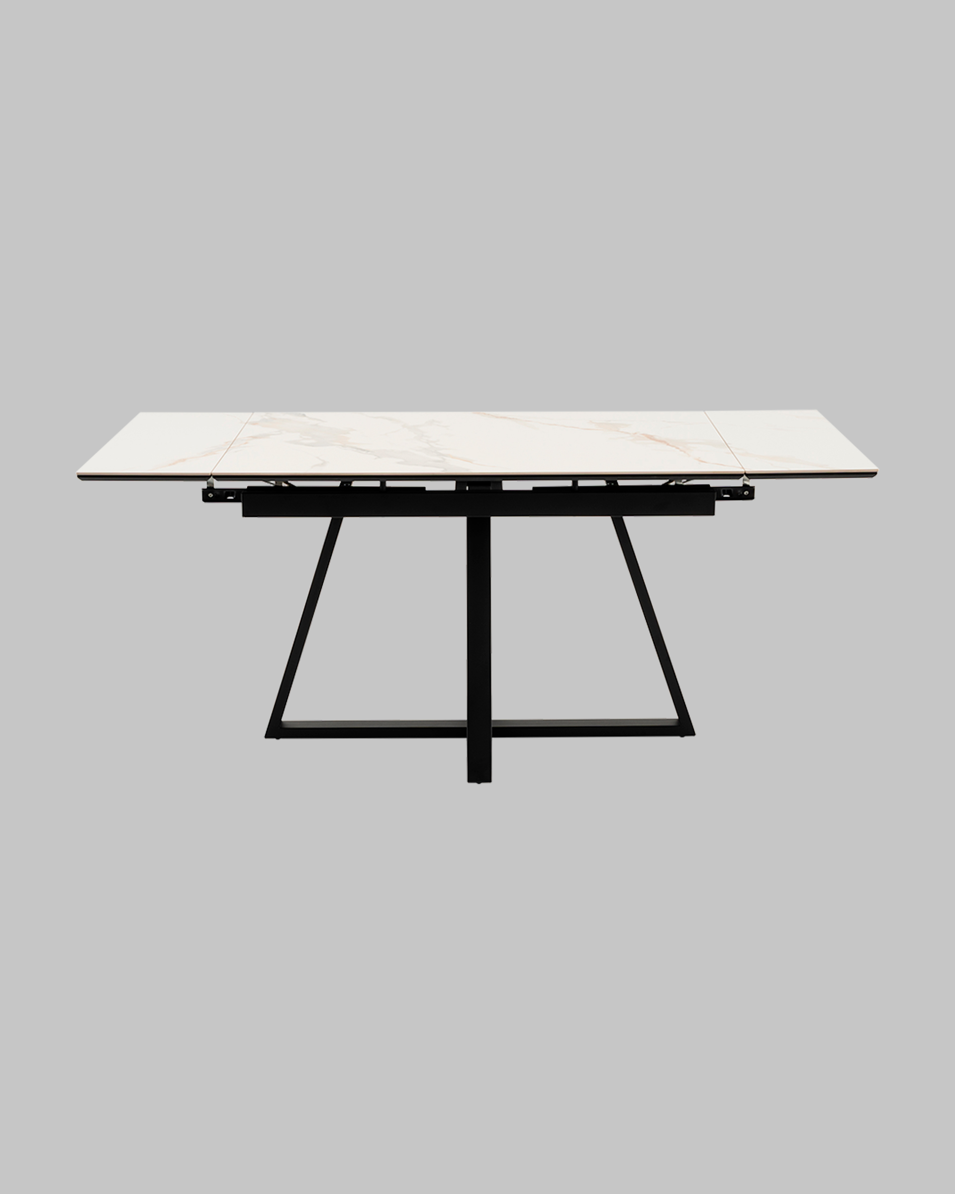Благодаря механизму раскладки стол легко трансформируется с 120 до 180 см, обеспечивая комфортное размещение гостей и универсальность для повседневного использования. Прочный керамический верх не только эффектно выглядит, но и устойчив к повреждениям и высоким температурам, делая его практичным выбором для кухни или столовой.