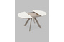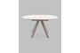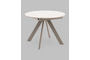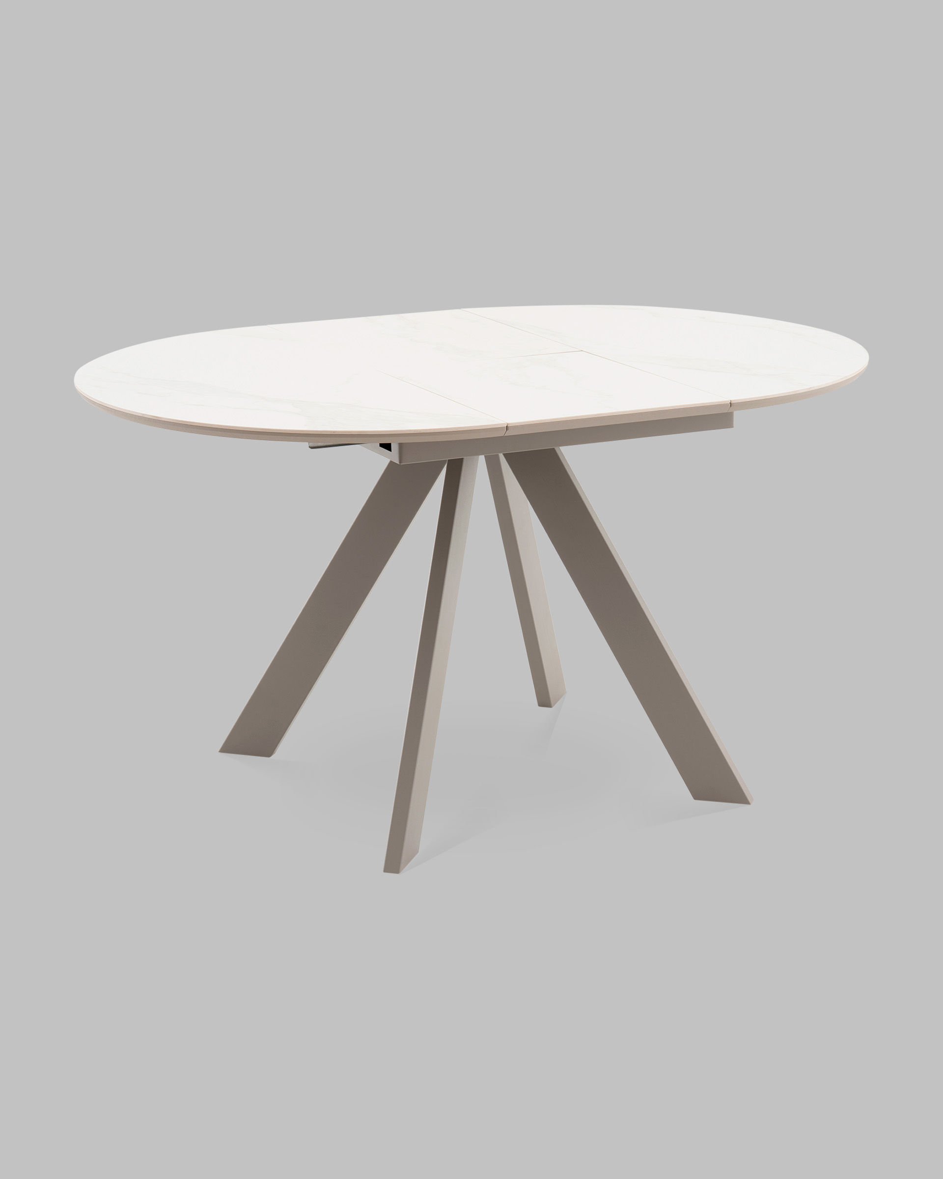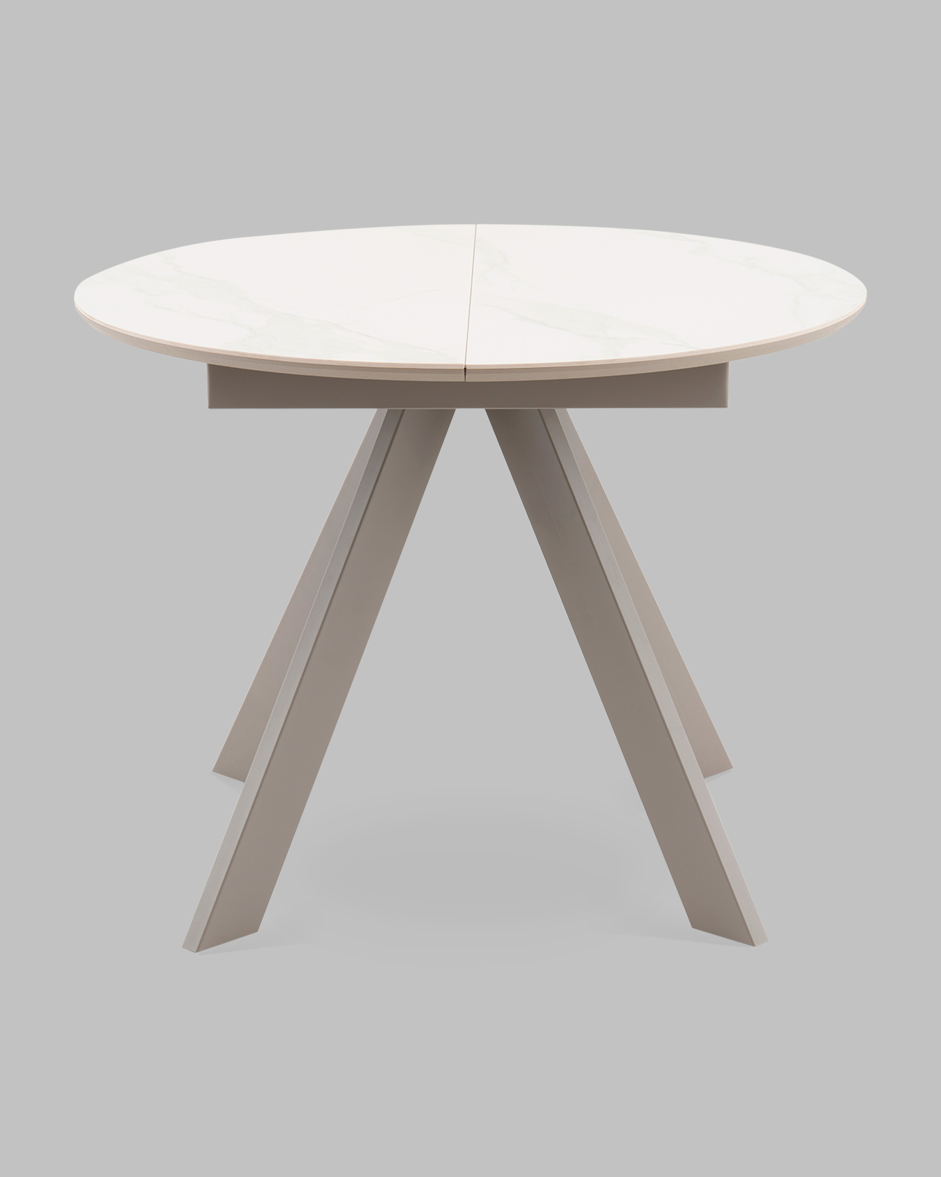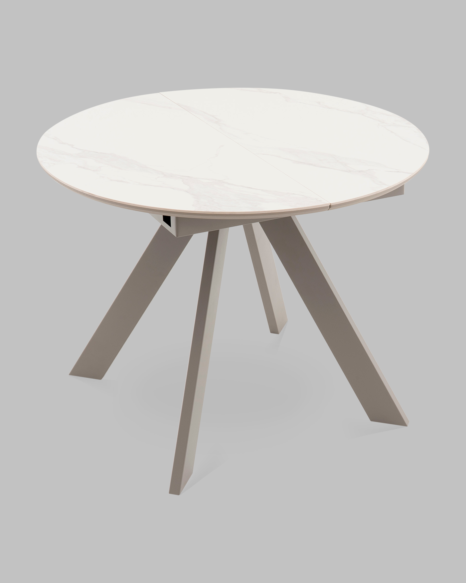 Стол оснащён удобным механизмом раскладки: диаметр увеличивается с 100 до 140 см, позволяя комфортно разместить гостей и подстроиться под любые ситуации. Массивное металлическое основание в оттенке латте выполнено в виде расходящихся под углом ножек — оно подчёркивает современный характер модели и обеспечивает отличную устойчивость.