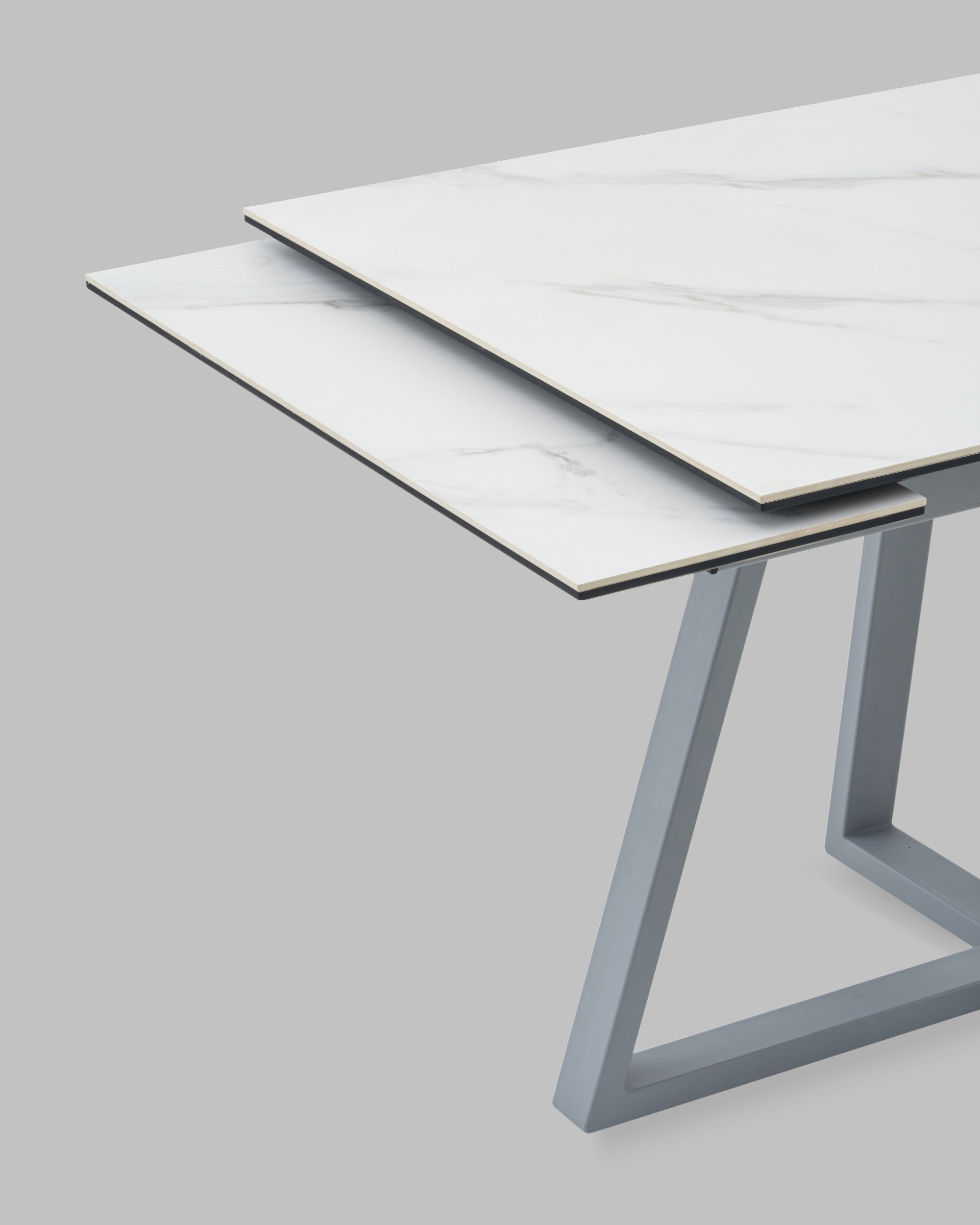 Столешница выполнена из керамики на МДФ — материала, который отличается высокой прочностью, устойчивостью к влаге, перепадам температур, механическим повреждениям и простотой в уходе. Керамика сохраняет безупречный внешний вид даже при активной эксплуатации, что делает стол особенно практичным для ежедневного использования.