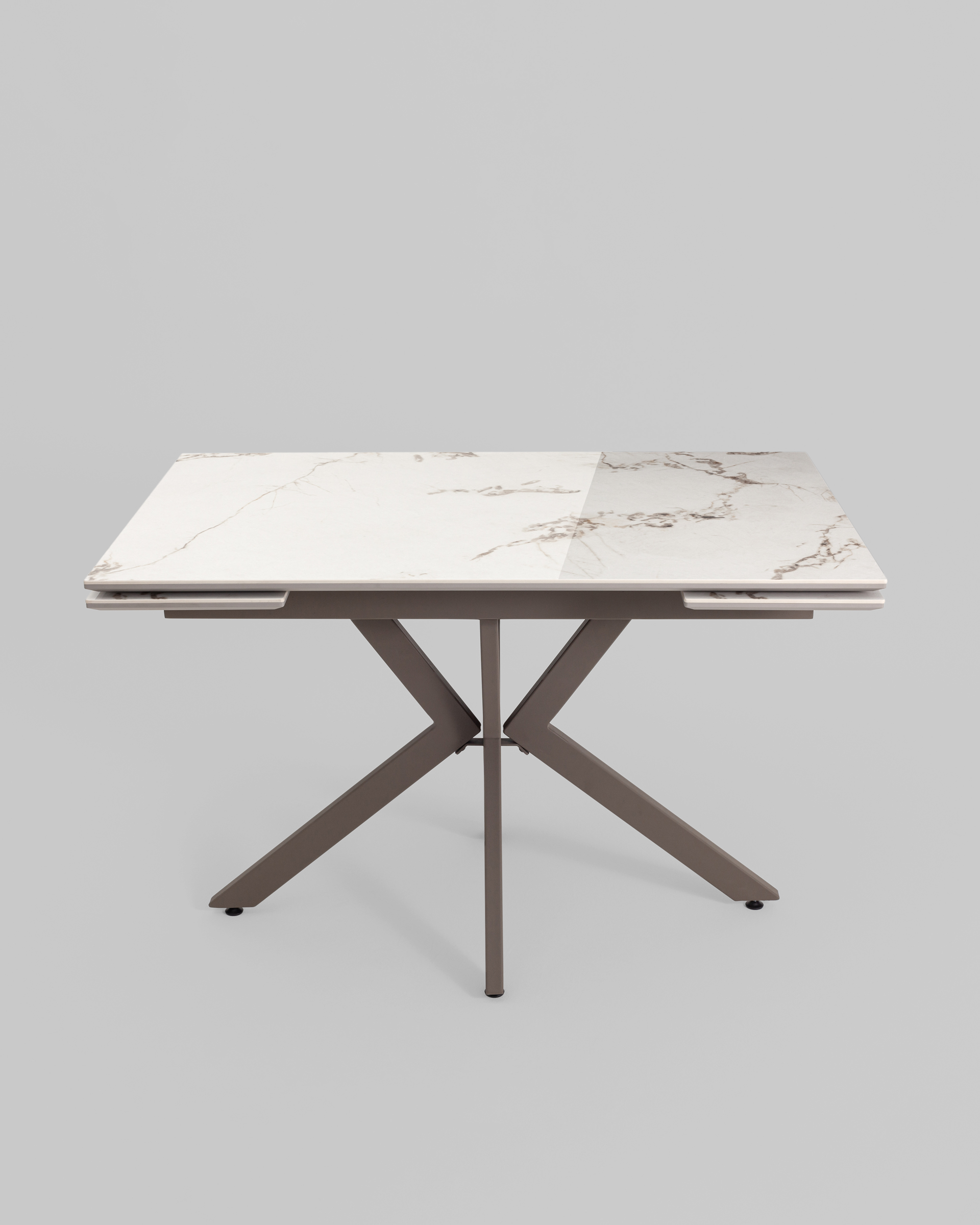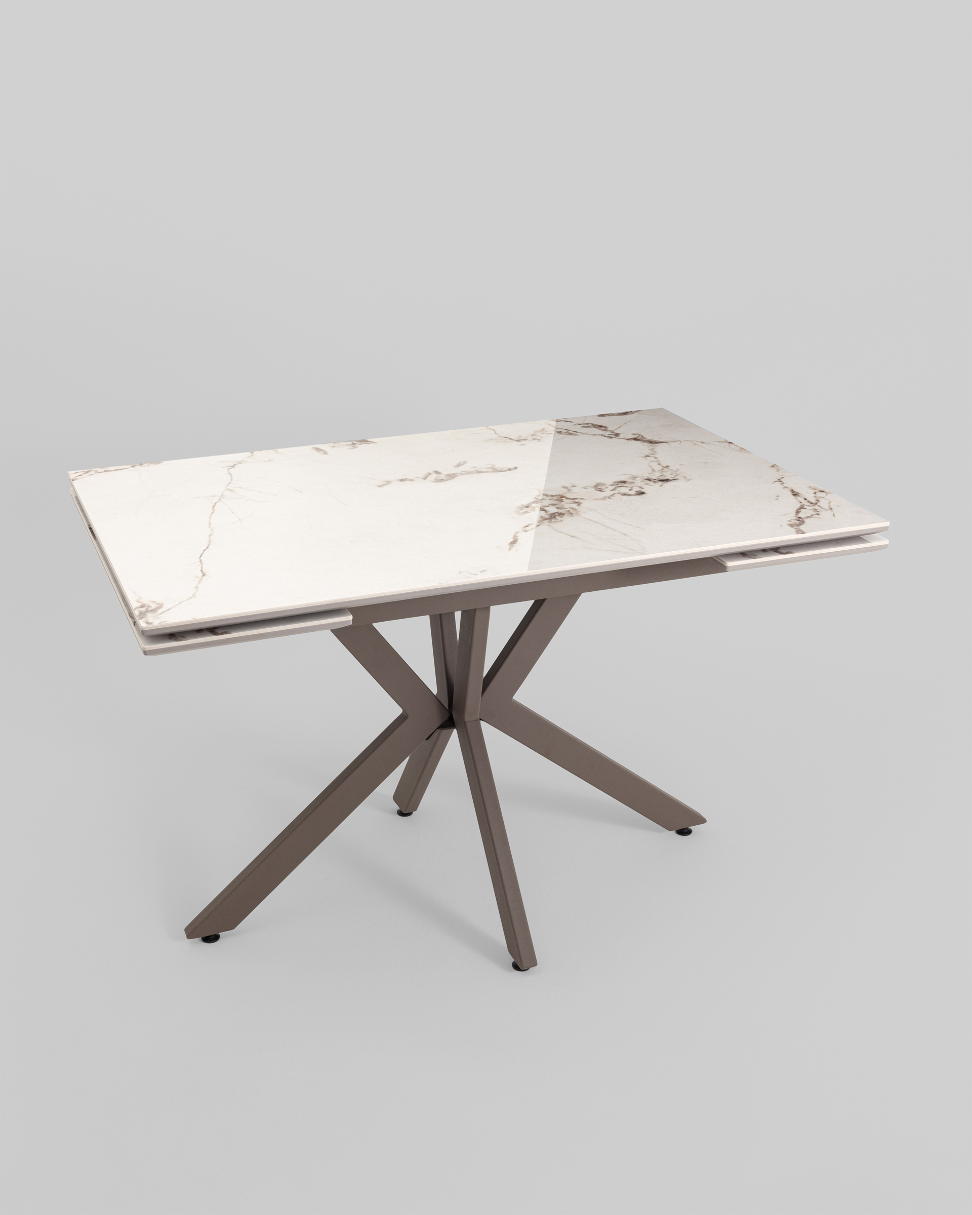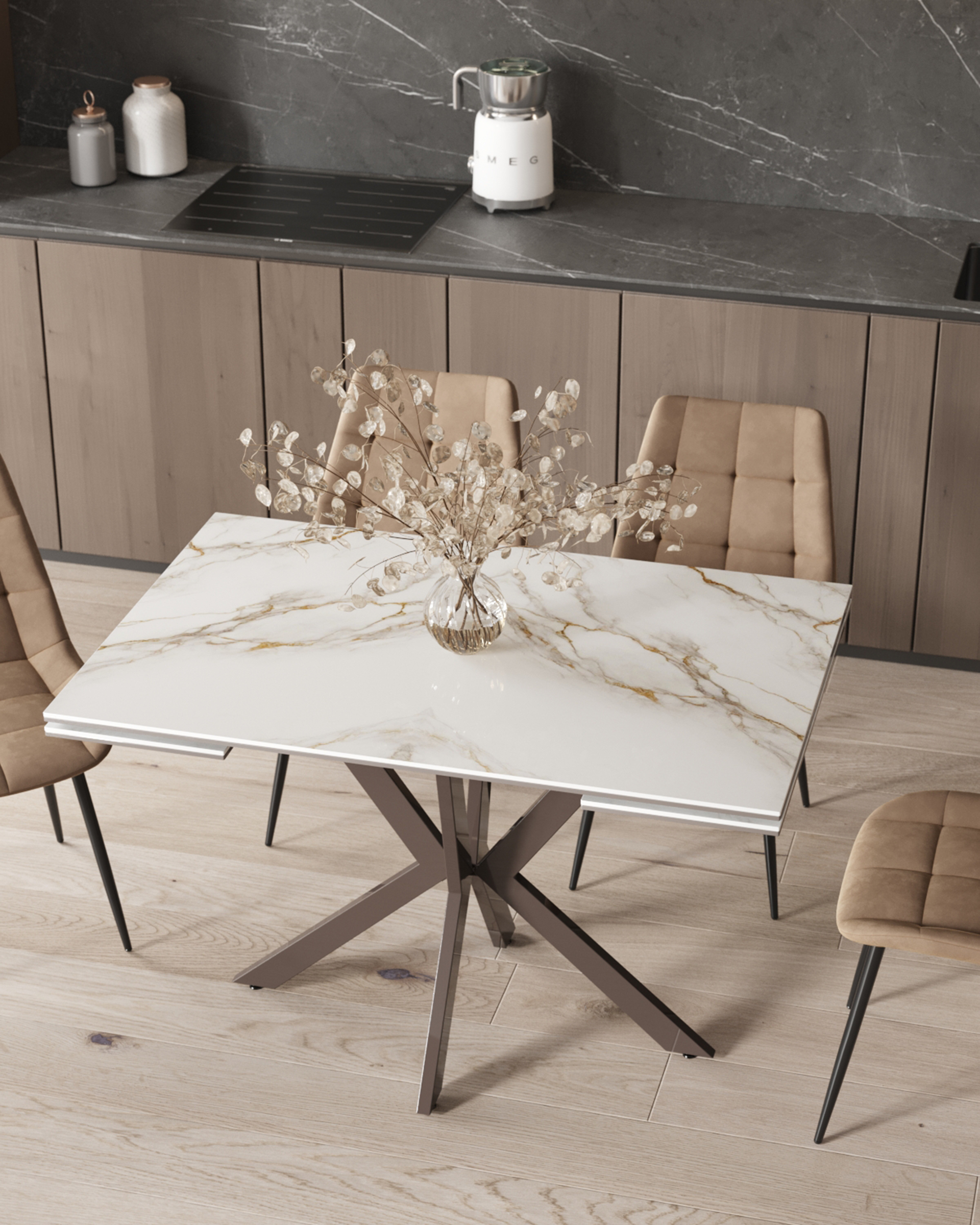 Столешница выполнена из керамики - устойчива к перепадам температуры, к чрезмерной влаге, а любые загрязнения на поверхности легко устранимы. При необходимости длину стола можно увеличить со 120 см до 180 см. Раздвижной механизм позволяет легко раздвигать и сдвигать стол одному человеку с минимальным физическим усилием. Аккуратные металлические ножки в цвете капучино образуют простую и надёжную конструкцию. Благодаря металлическому каркасу стол прочный и устойчивый, а пластиковые насадки надежно защищают пол от царапин. Стол раскладной Marmer станет практичным украшением любой кухни или обеденной зоны.