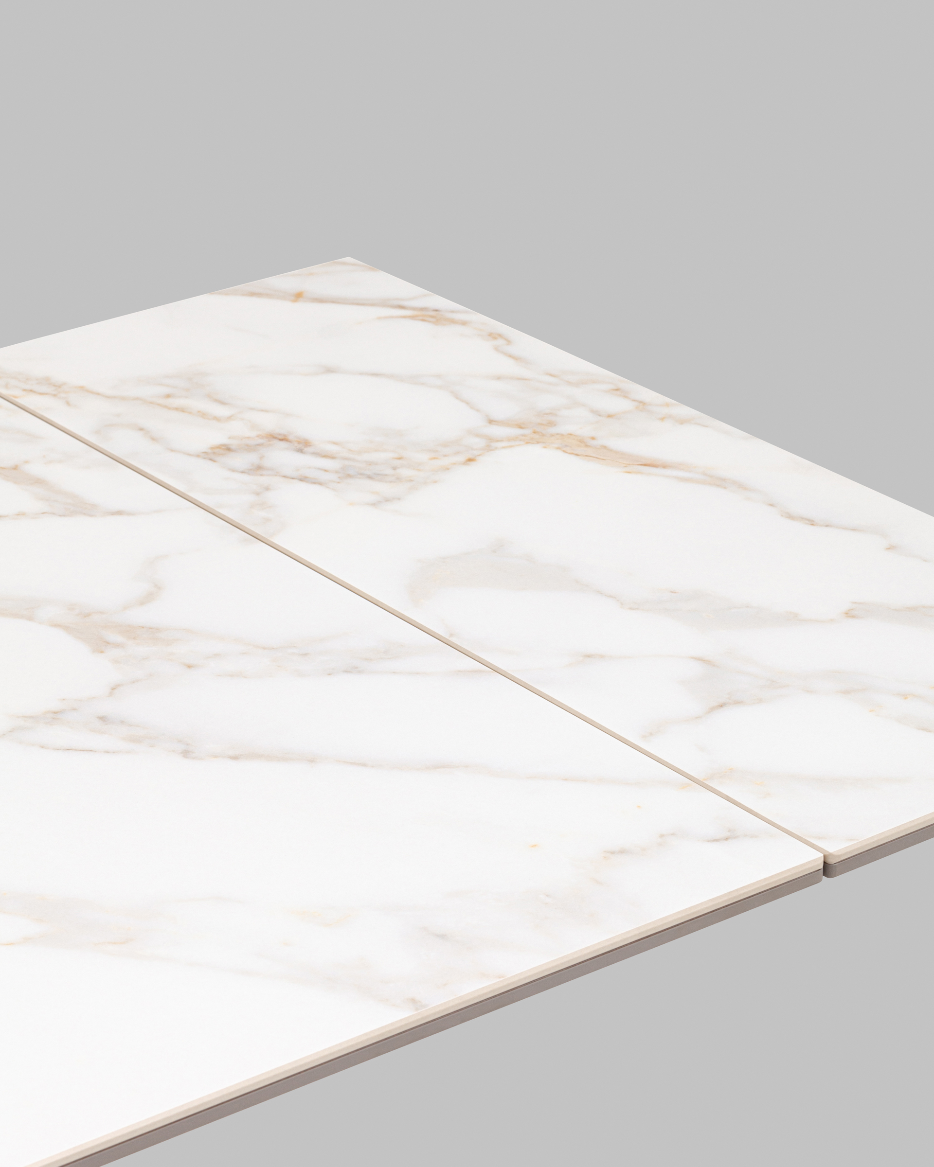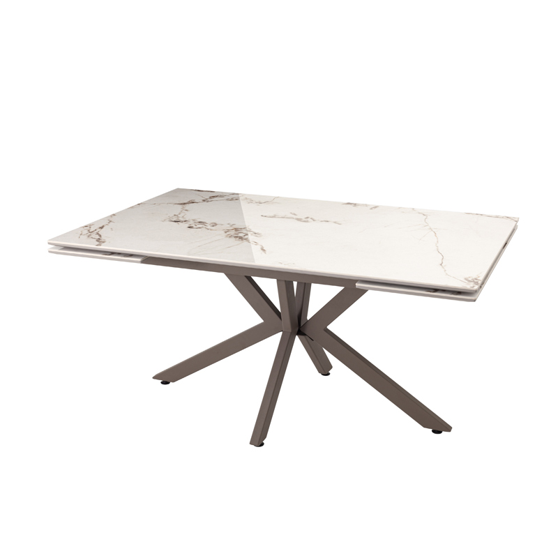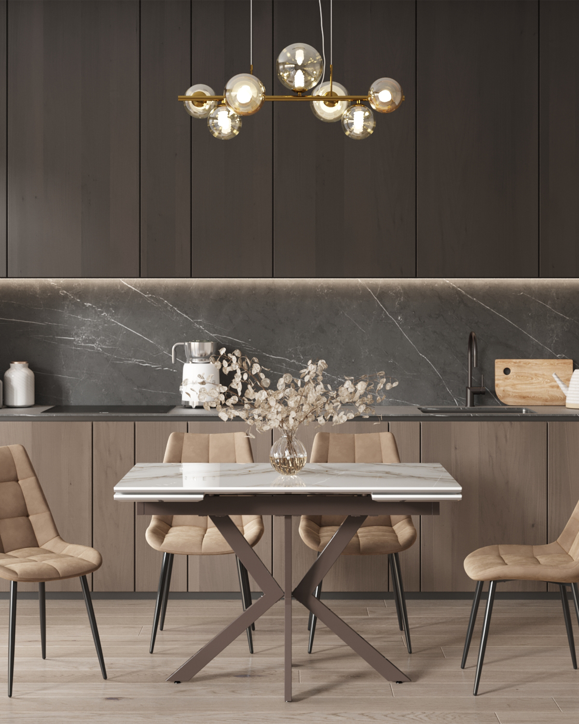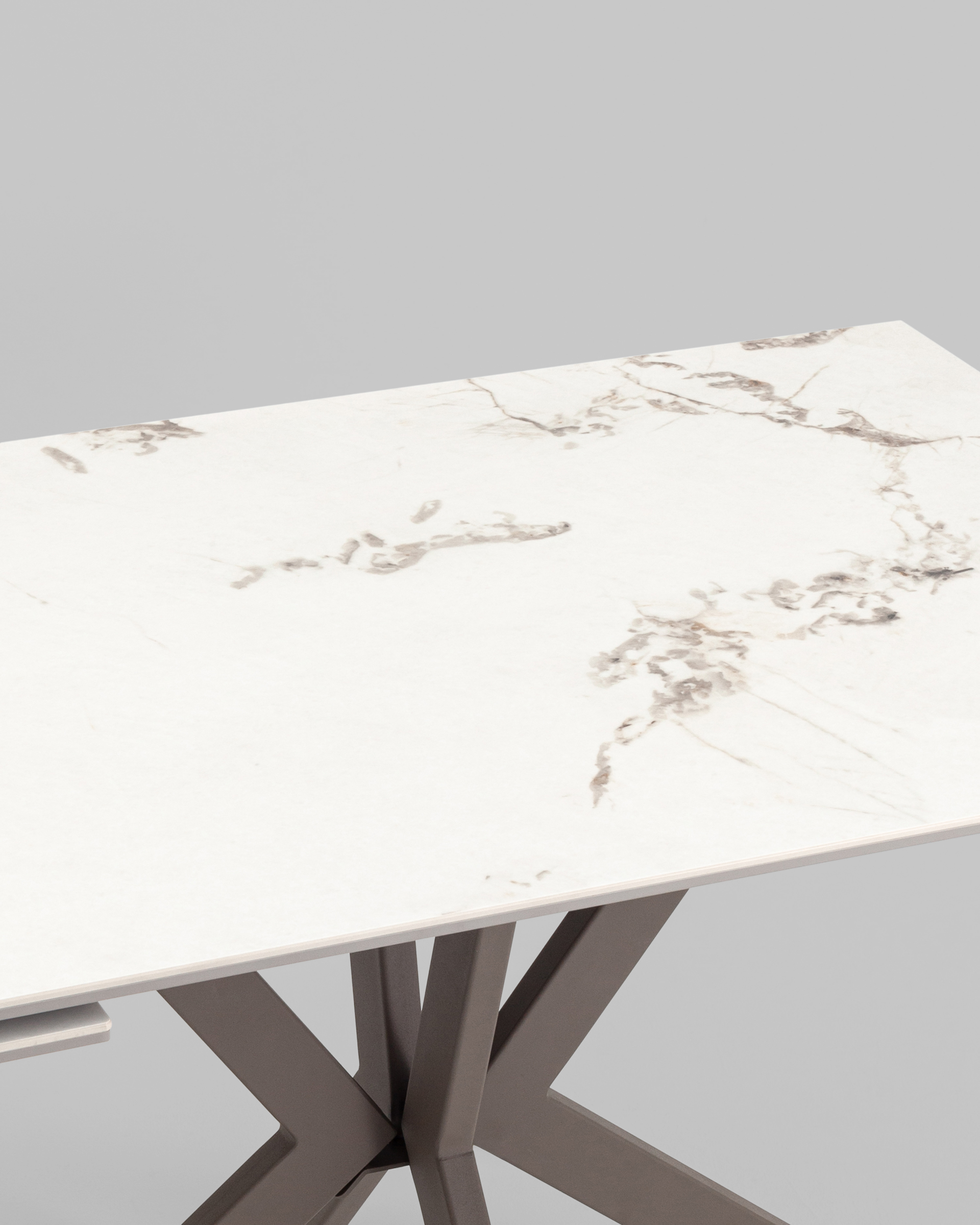 Столешница выполнена из керамики - устойчива к перепадам температуры, к чрезмерной влаге, а любые загрязнения на поверхности легко устранимы. При необходимости длину стола можно увеличить со 120 см до 180 см. Раздвижной механизм позволяет легко раздвигать и сдвигать стол одному человеку с минимальным физическим усилием. Аккуратные металлические ножки в цвете капучино образуют простую и надёжную конструкцию. Благодаря металлическому каркасу стол прочный и устойчивый, а пластиковые насадки надежно защищают пол от царапин. Стол раскладной Marmer станет практичным украшением любой кухни или обеденной зоны.