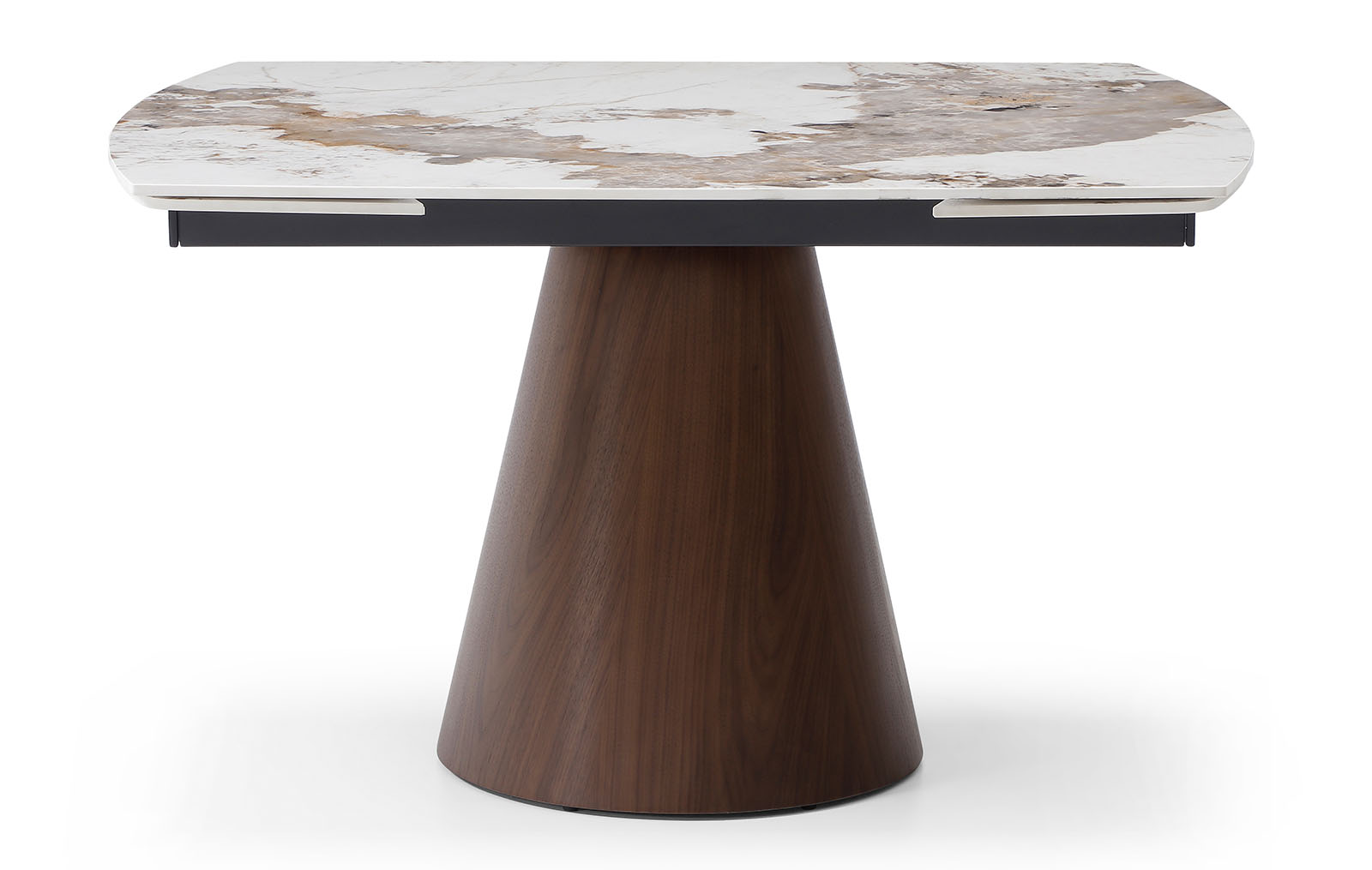 Стол имеет 2 вставки по 30 см, которые удобно убираются под столешницу. Механизмы торцевого раздвижения позволяют легко раскладывать и складывать эту модель.
