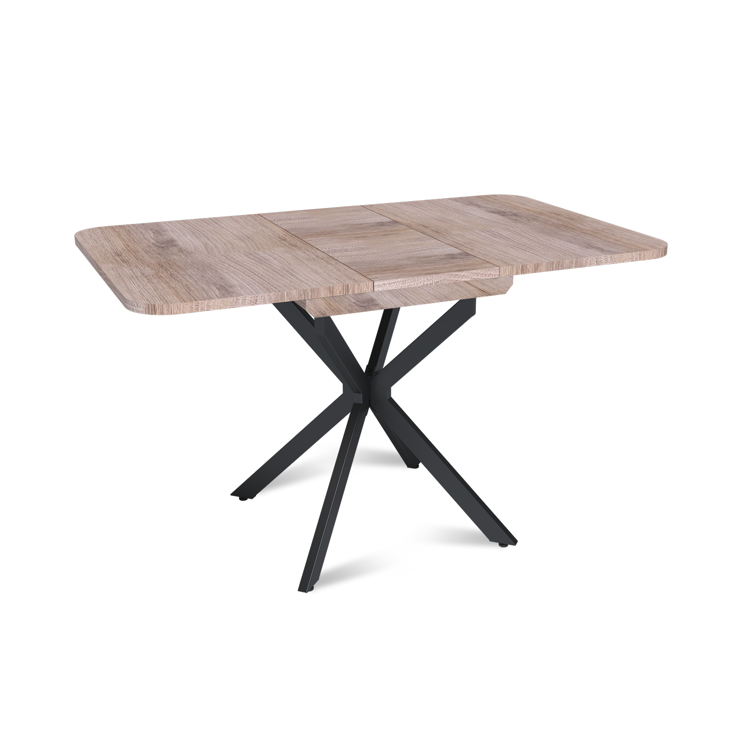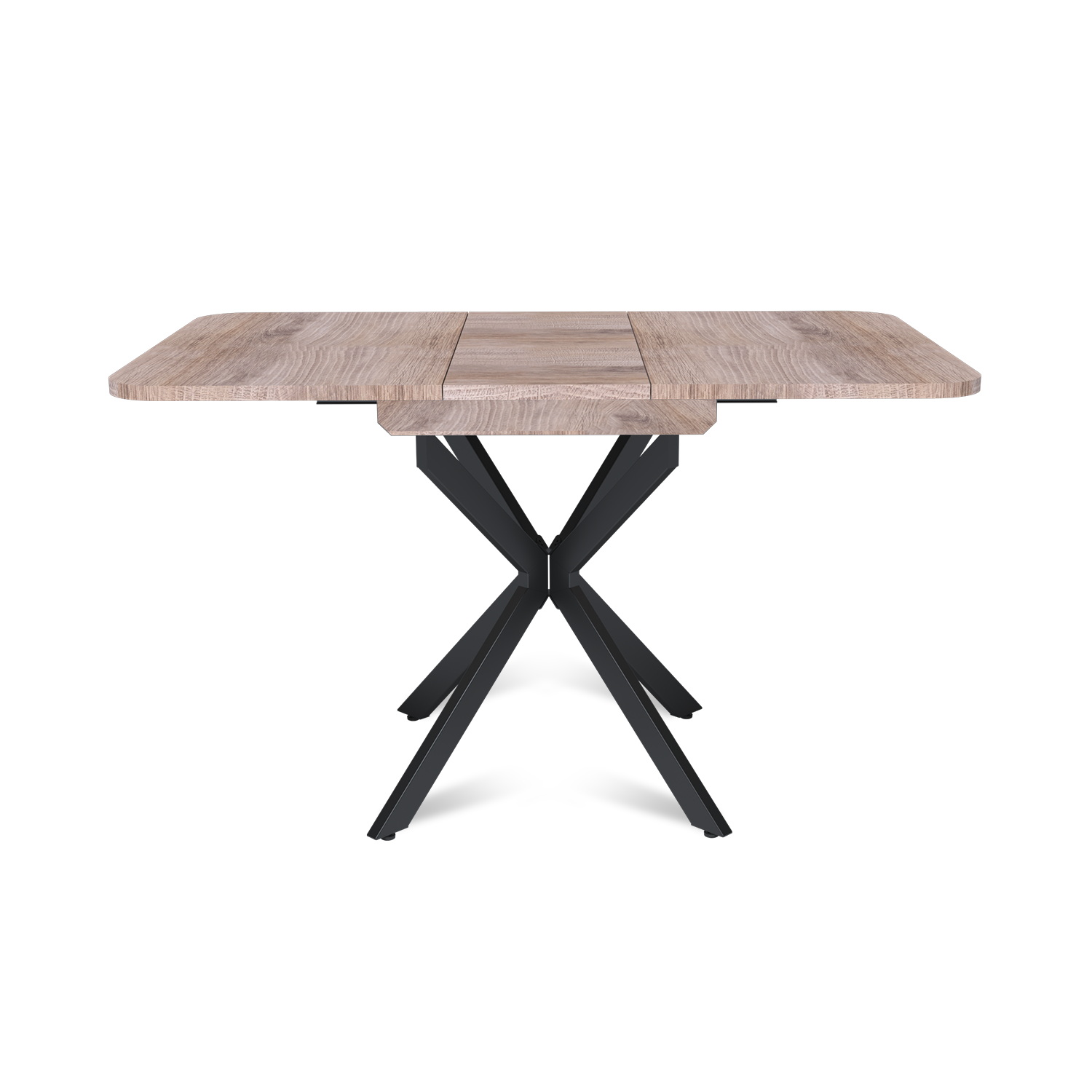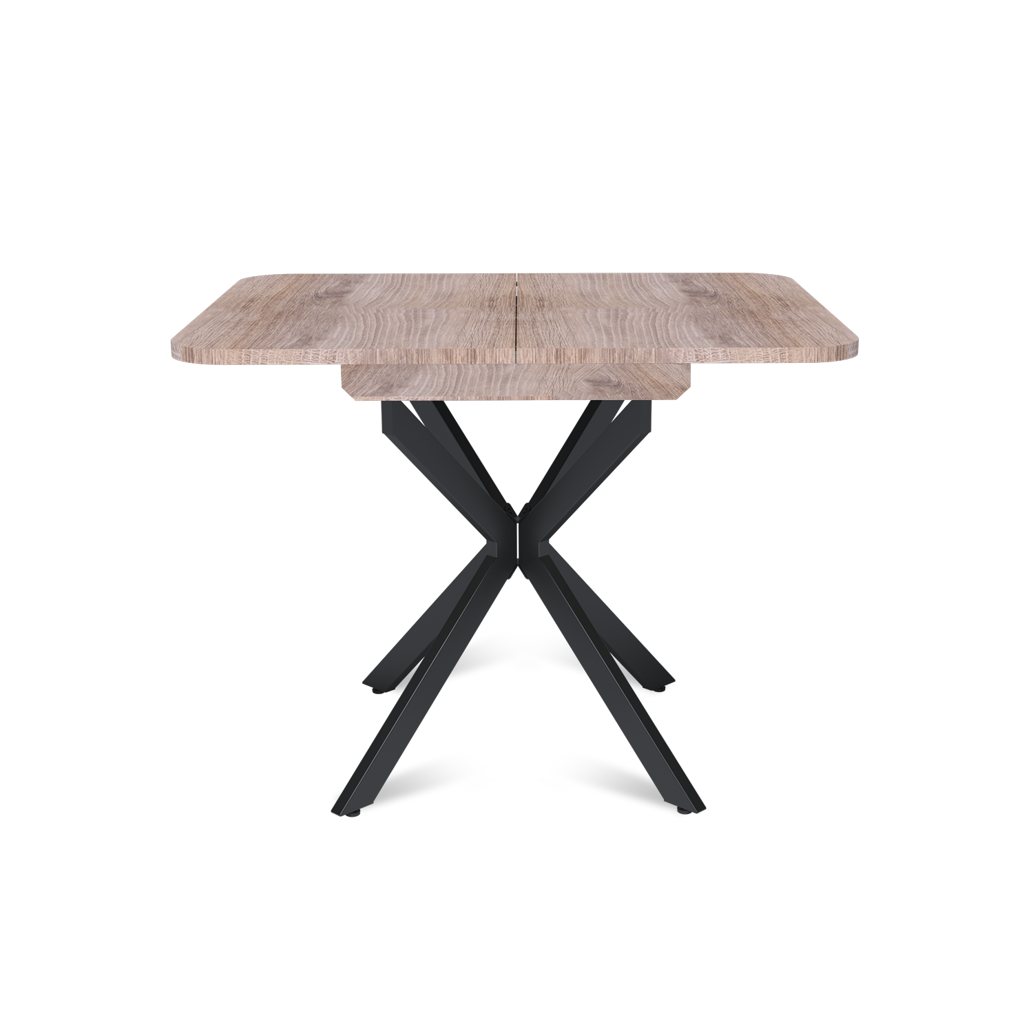 Трансформация стола построена на синхронном принципе: обе половины столешницы расходятся одновременно, сохраняя идеальную геометрию. Центральная вставка-«бабочка» шириной 30 см плотно фиксируется между ними, исключая люфт и перепады высоты. В разложенном виде стол выглядит монолитно, а механизм не доставляет хлопот при каждой сборке. Вставка повторяет цвет и фактуру столешницы, благодаря этому конструкция выглядит монолитно: переход от столешницы к опорам визуально сглажен, а общий вид остается максимально аккуратным и продуманным.