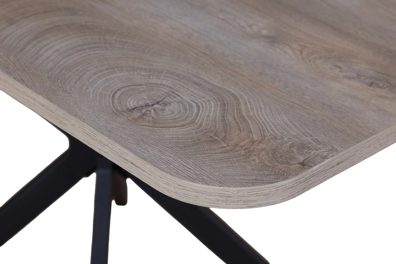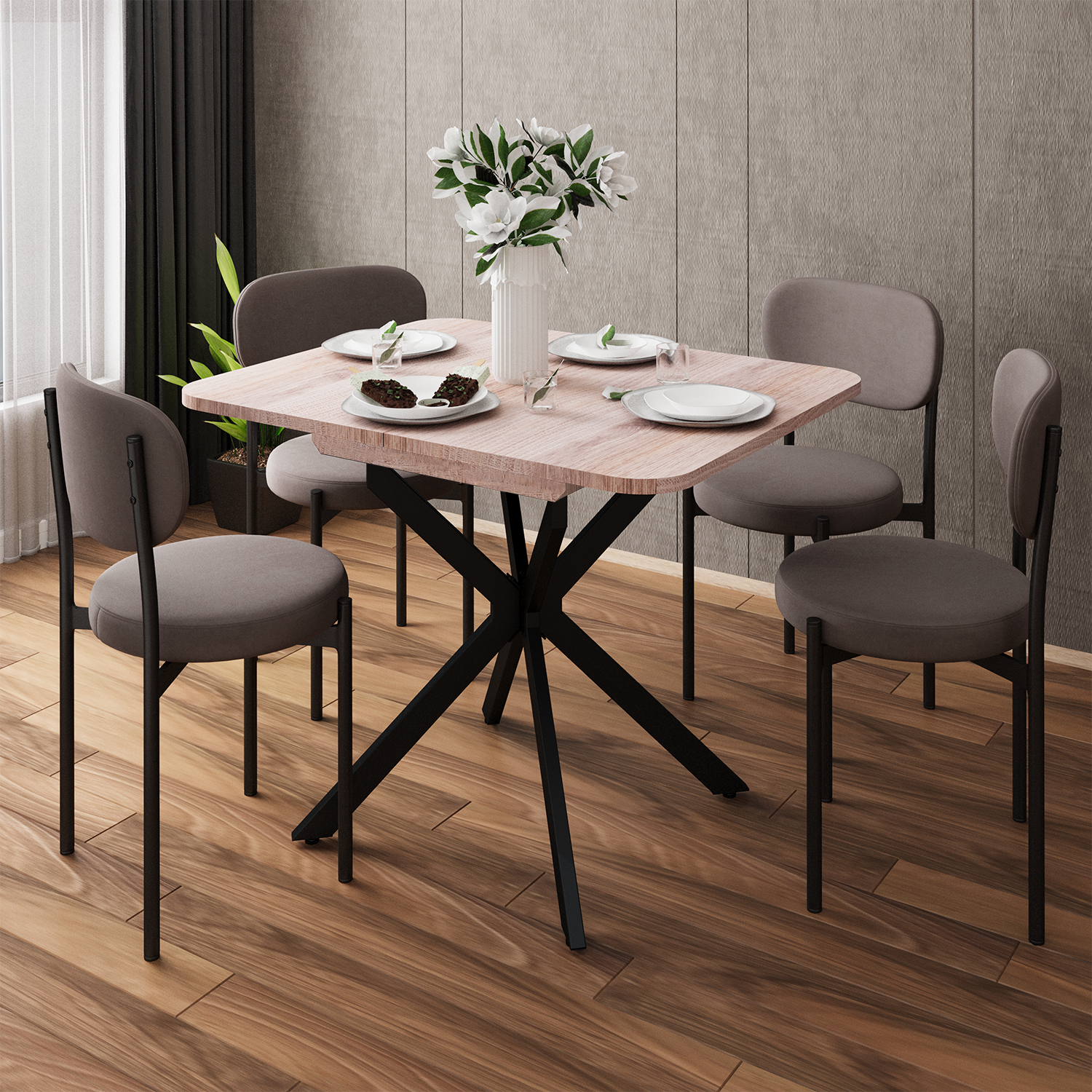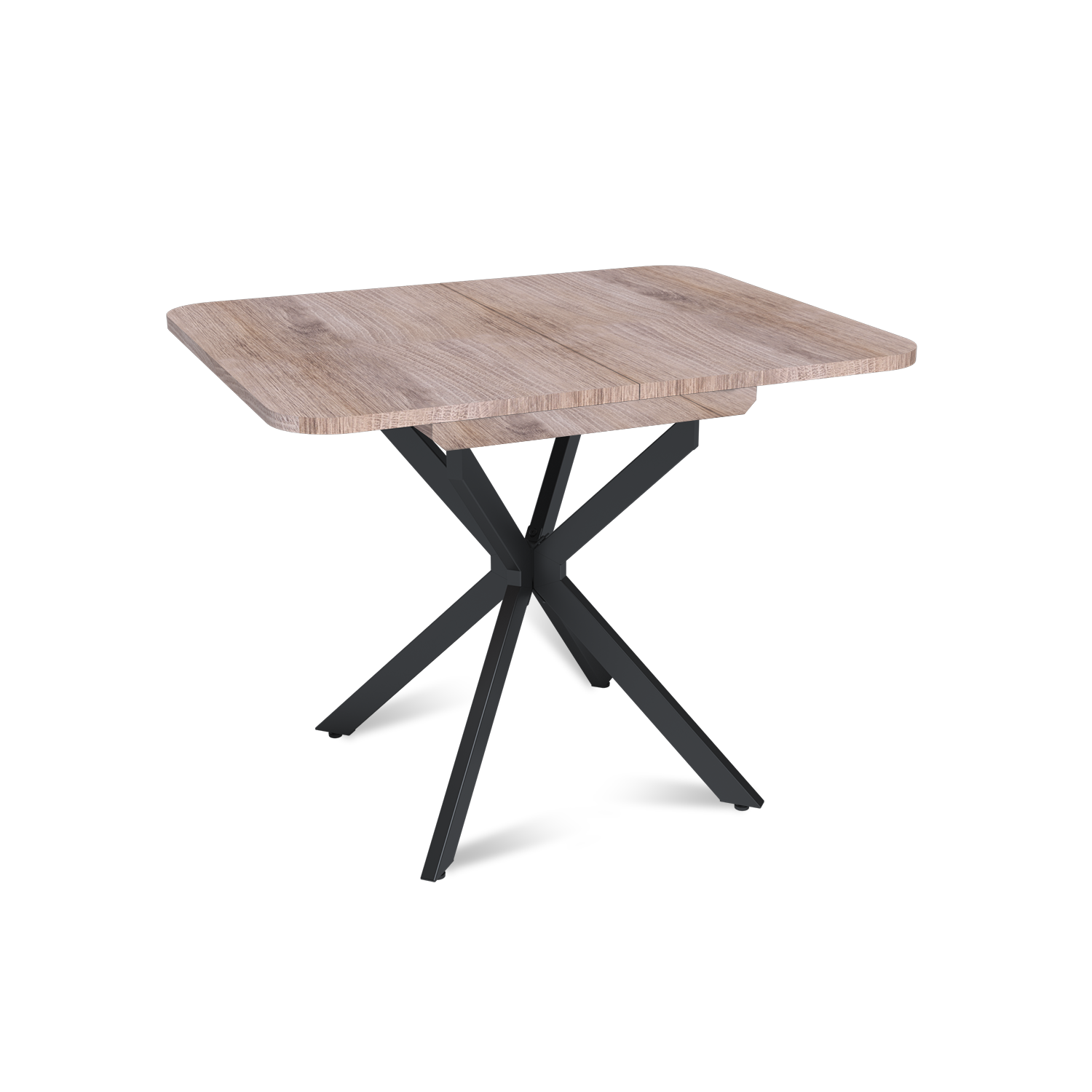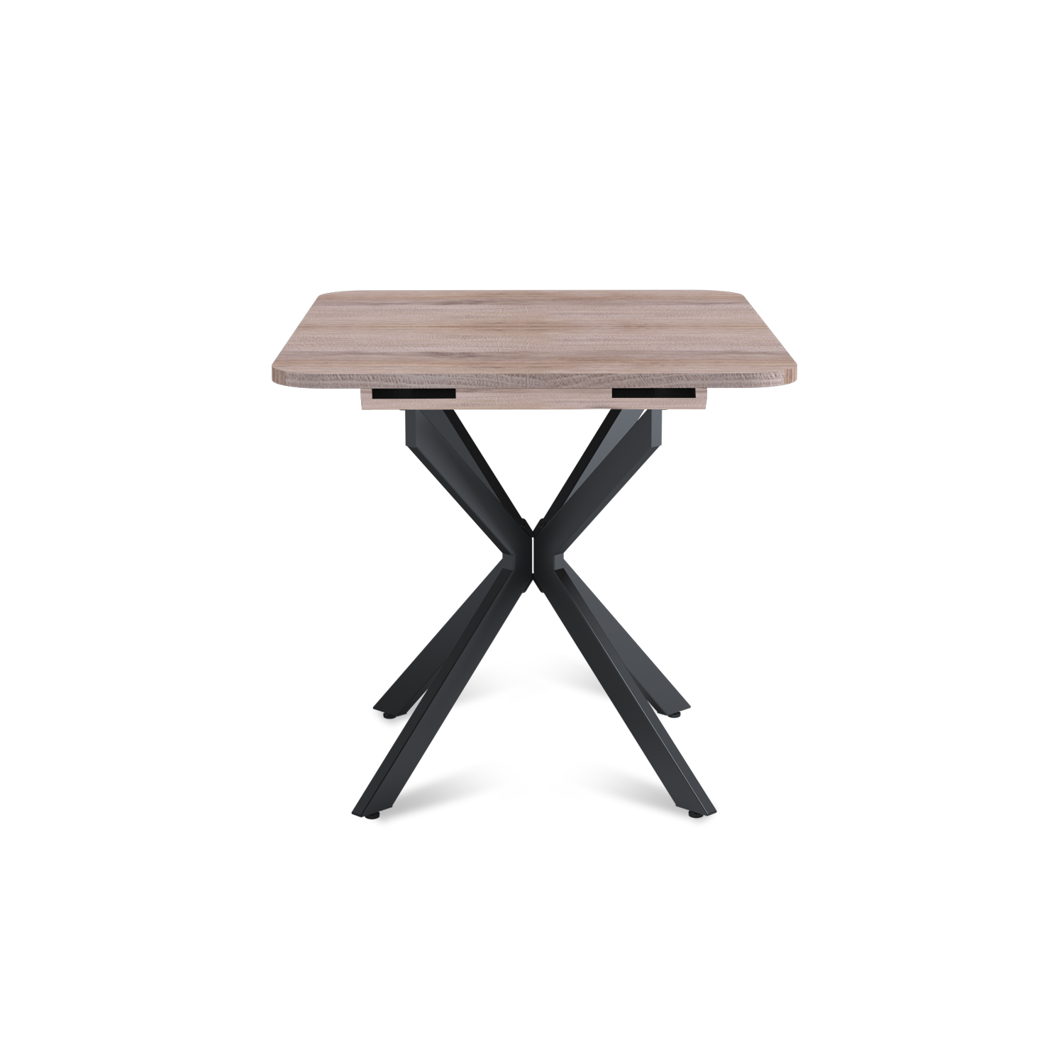 Трансформация стола построена на синхронном принципе: обе половины столешницы расходятся одновременно, сохраняя идеальную геометрию. Центральная вставка-«бабочка» шириной 30 см плотно фиксируется между ними, исключая люфт и перепады высоты. В разложенном виде стол выглядит монолитно, а механизм не доставляет хлопот при каждой сборке. Вставка повторяет цвет и фактуру столешницы, благодаря этому конструкция выглядит монолитно: переход от столешницы к опорам визуально сглажен, а общий вид остается максимально аккуратным и продуманным.