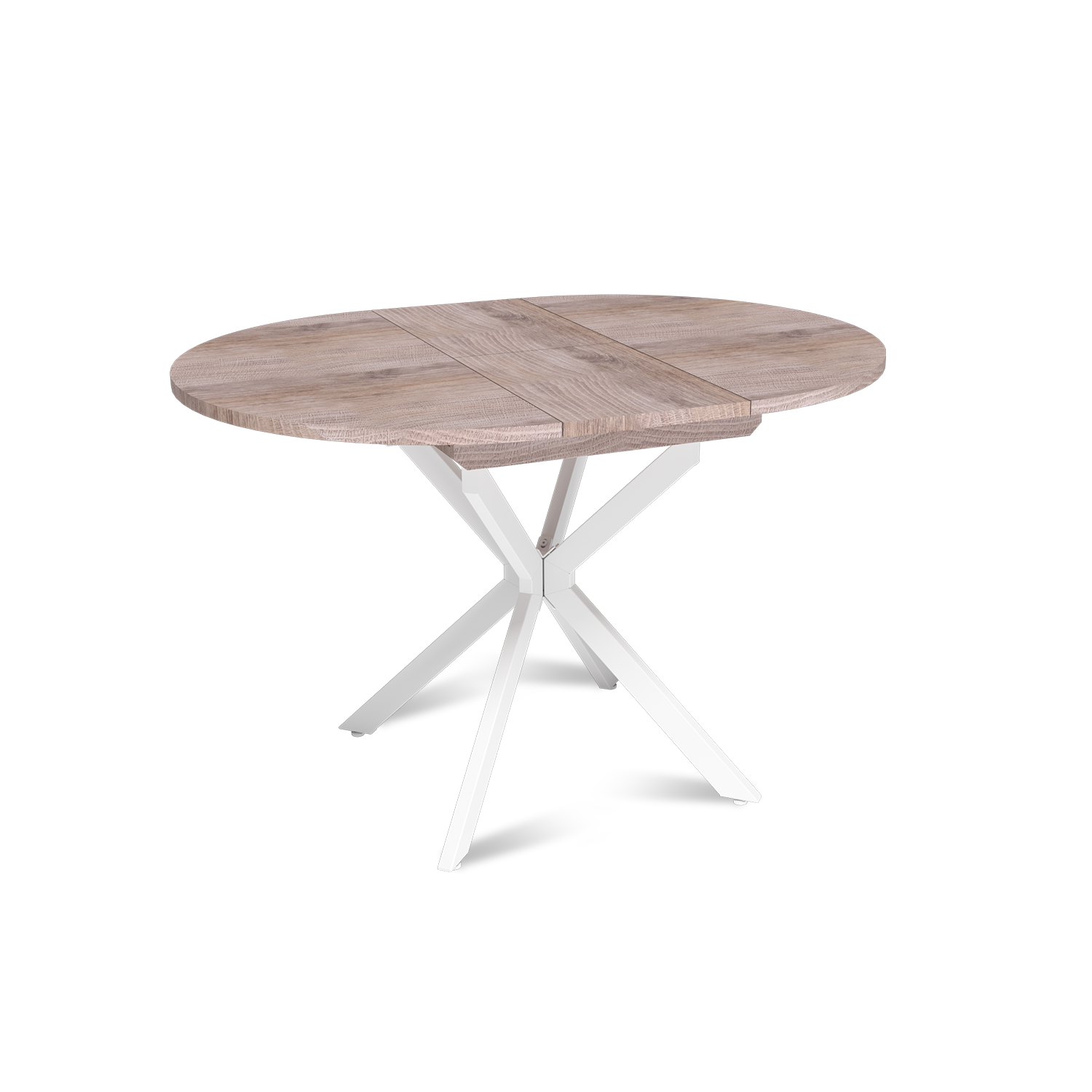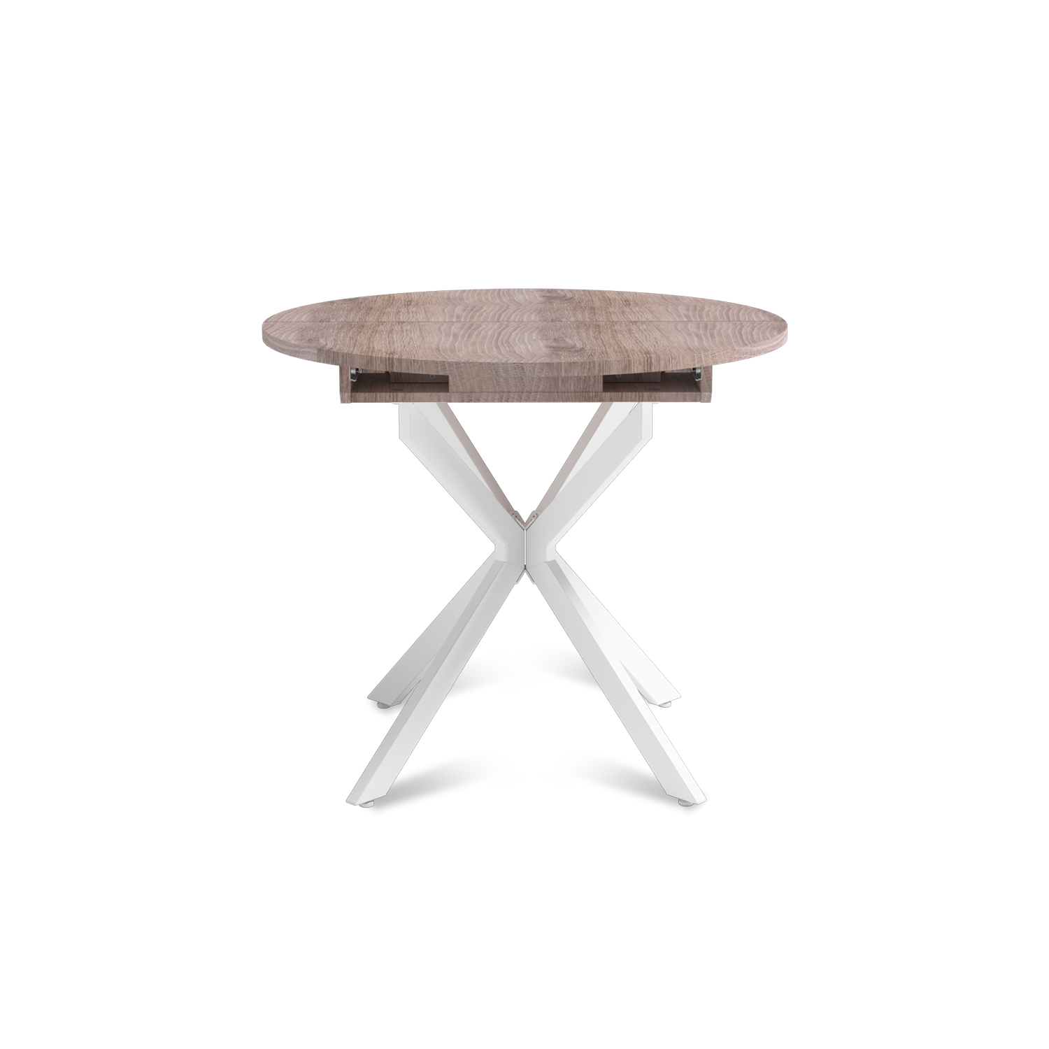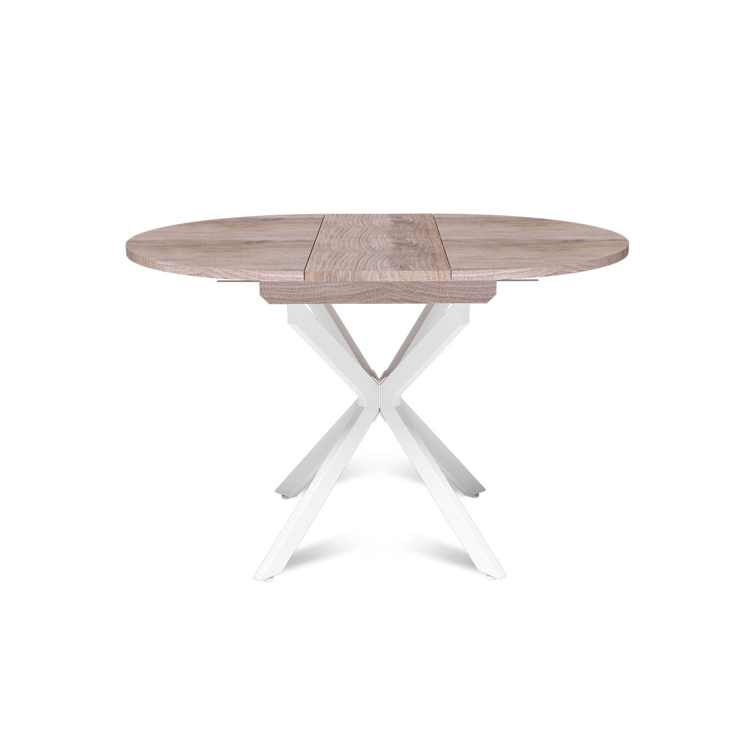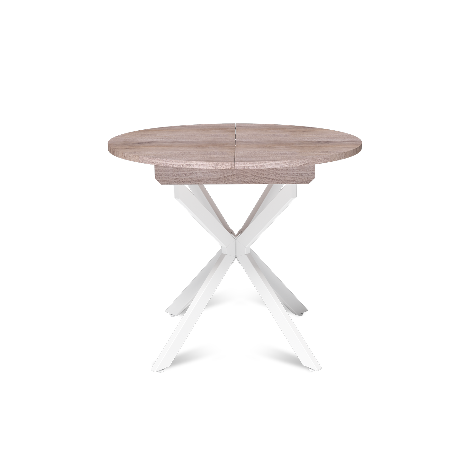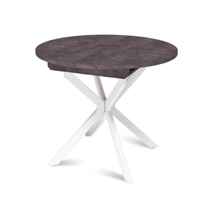Трансформация стола построена на синхронном принципе: обе половины столешницы расходятся одновременно, сохраняя идеальную геометрию. Центральная вставка-«бабочка» шириной 30 см плотно фиксируется между ними, исключая люфт и перепады высоты. В разложенном виде стол выглядит монолитно, а механизм не доставляет хлопот при каждой сборке. Вставка повторяет цвет и фактуру столешницы, благодаря этому конструкция выглядит монолитно: переход от столешницы к опорам визуально сглажен, а общий вид остается максимально аккуратным и продуманным.