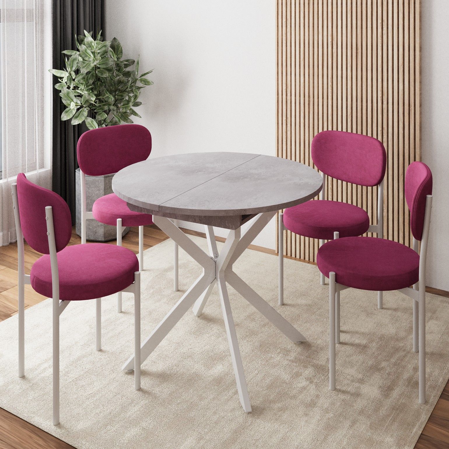 Трансформация стола построена на синхронном принципе: обе половины столешницы расходятся одновременно, сохраняя идеальную геометрию. Центральная вставка-«бабочка» шириной 30 см плотно фиксируется между ними, исключая люфт и перепады высоты. В разложенном виде стол выглядит монолитно, а механизм не доставляет хлопот при каждой сборке. Вставка повторяет цвет и фактуру столешницы, благодаря этому конструкция выглядит монолитно: переход от столешницы к опорам визуально сглажен, а общий вид остается максимально аккуратным и продуманным.