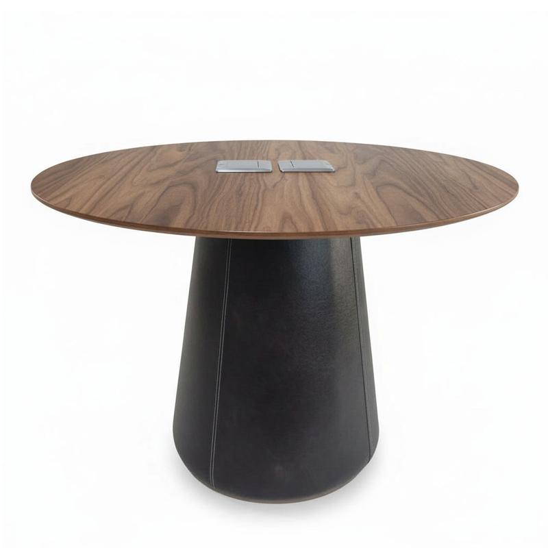 Столешница диаметром 1200 мм выполнена из натурального шпона американского ореха. Выразительная текстура древесины и глубокий природный оттенок формируют ощущение тепла и статуса, делая стол визуальным центром интерьера.