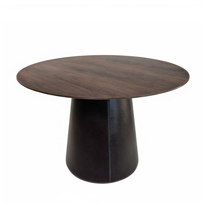 Подстолье: коническая конструкция, покрытая коричневой экокожей с белой прострочкой. Элемент одновременно устойчивый и визуально лёгкий, служит акцентом, а не просто опорой.