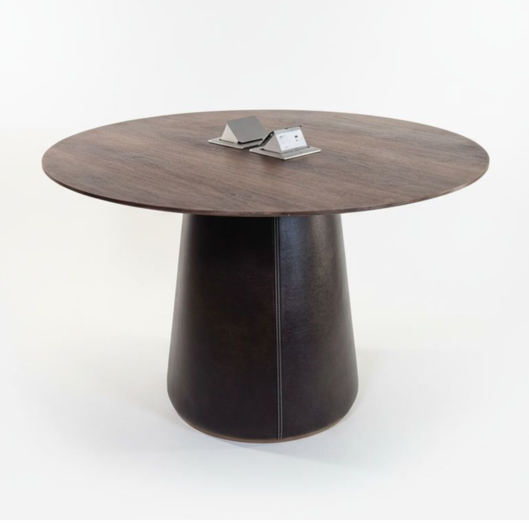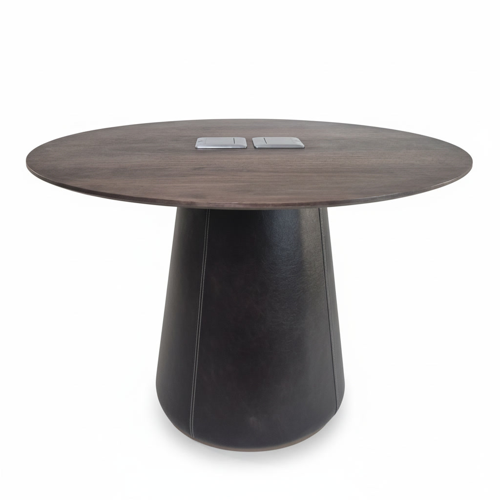 Подстолье: коническая форма, обтянутая коричневой экокожей с контрастной белой прострочкой. Тактильная отделка подчёркивает премиальность и визуальный баланс между тёплым деревом и архитектурной формой.