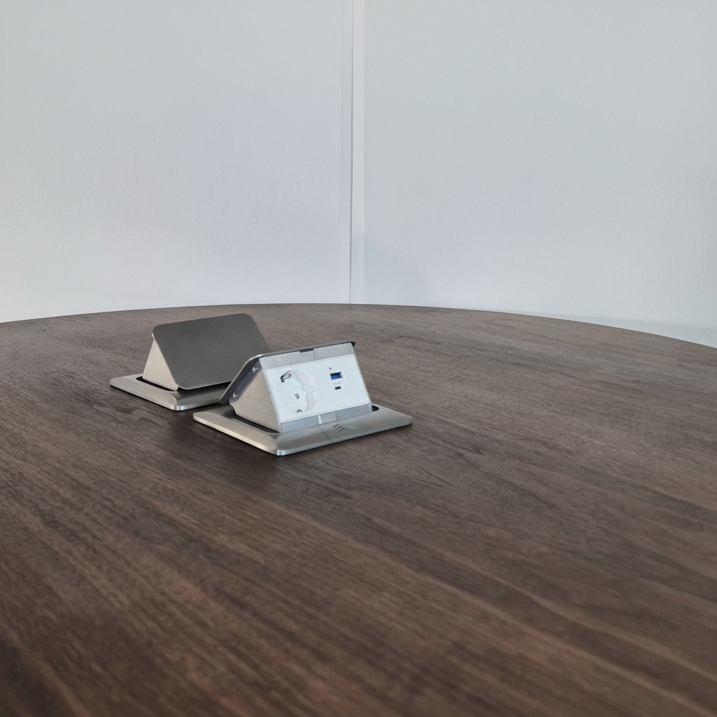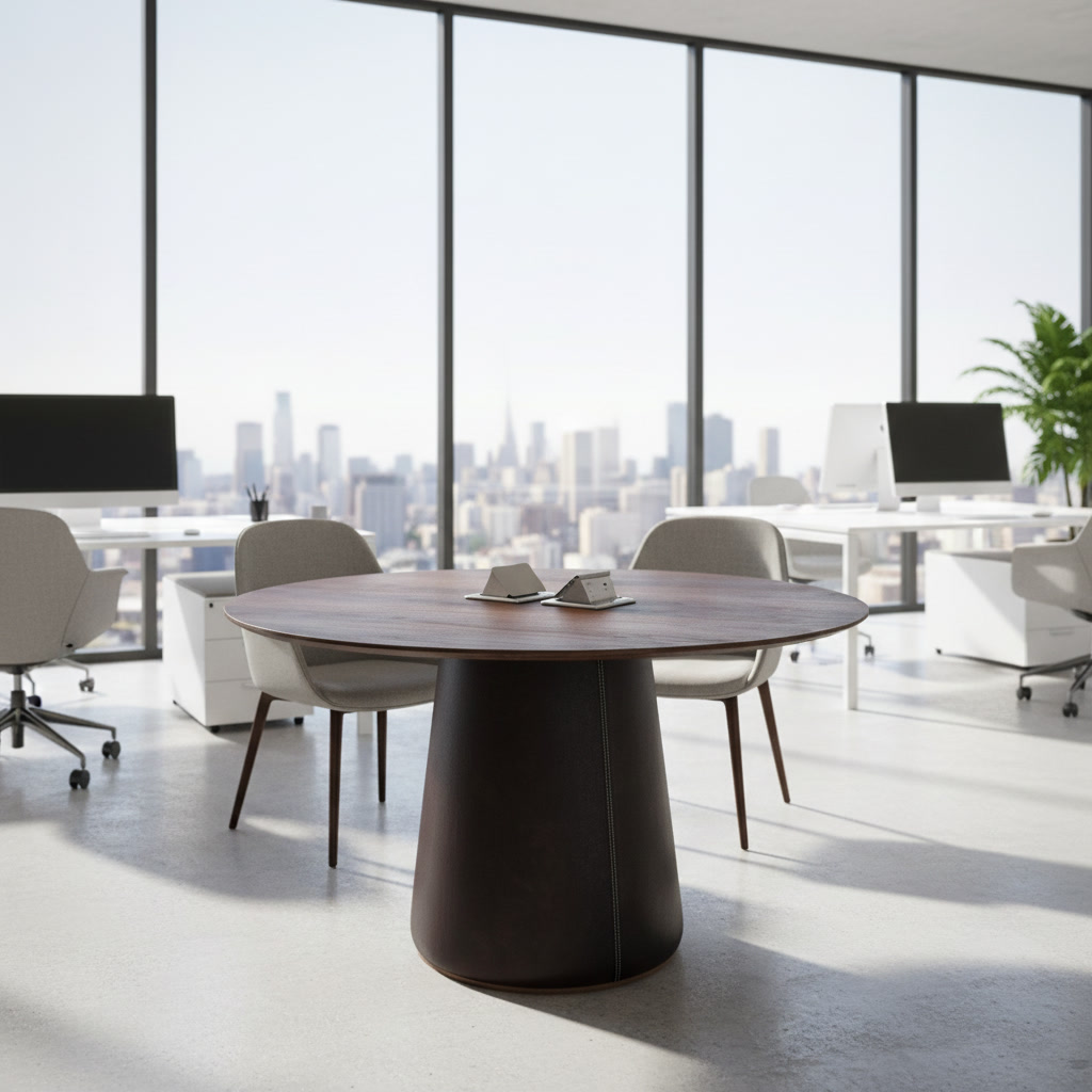 Столешница: диаметр 1200 мм, выполнена из натурального шпона американского ореха, затем тонирована для усиления глубины цвета и контраста древесного рисунка. Это придаёт столу более строгий, насыщенный характер, идеально подходящий для современного кабинета или переговорной.