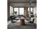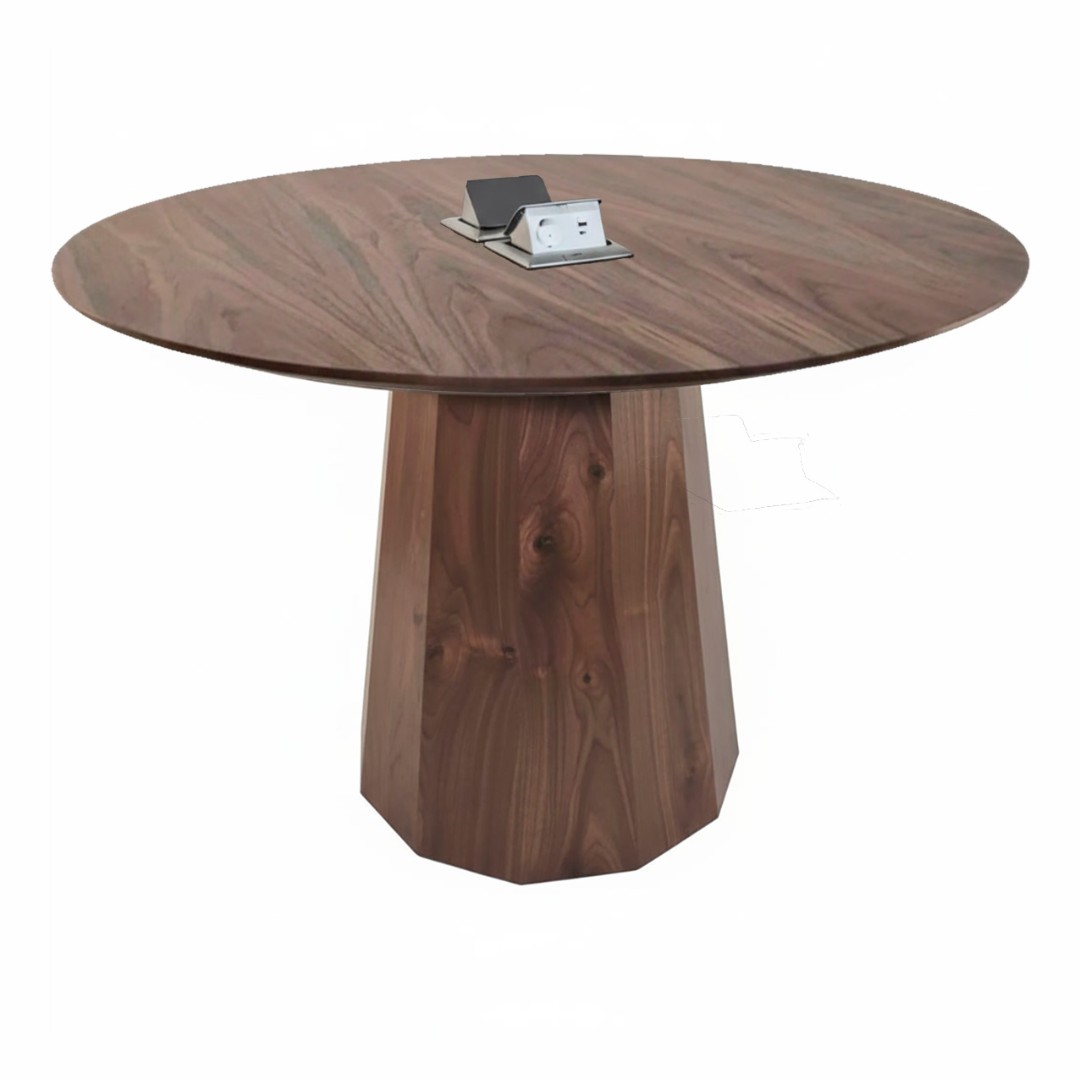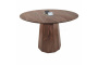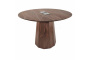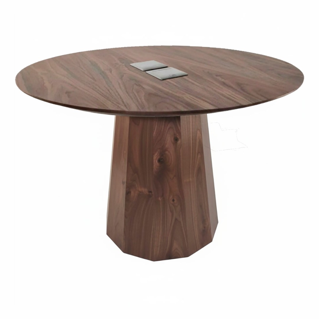 Столешница диаметром 1200 мм выполнена из натурального шпона американского ореха с насыщенной текстурой и тёплым природным оттенком. Материал подчёркивает премиальный характер изделия и делает стол визуальным центром пространства.