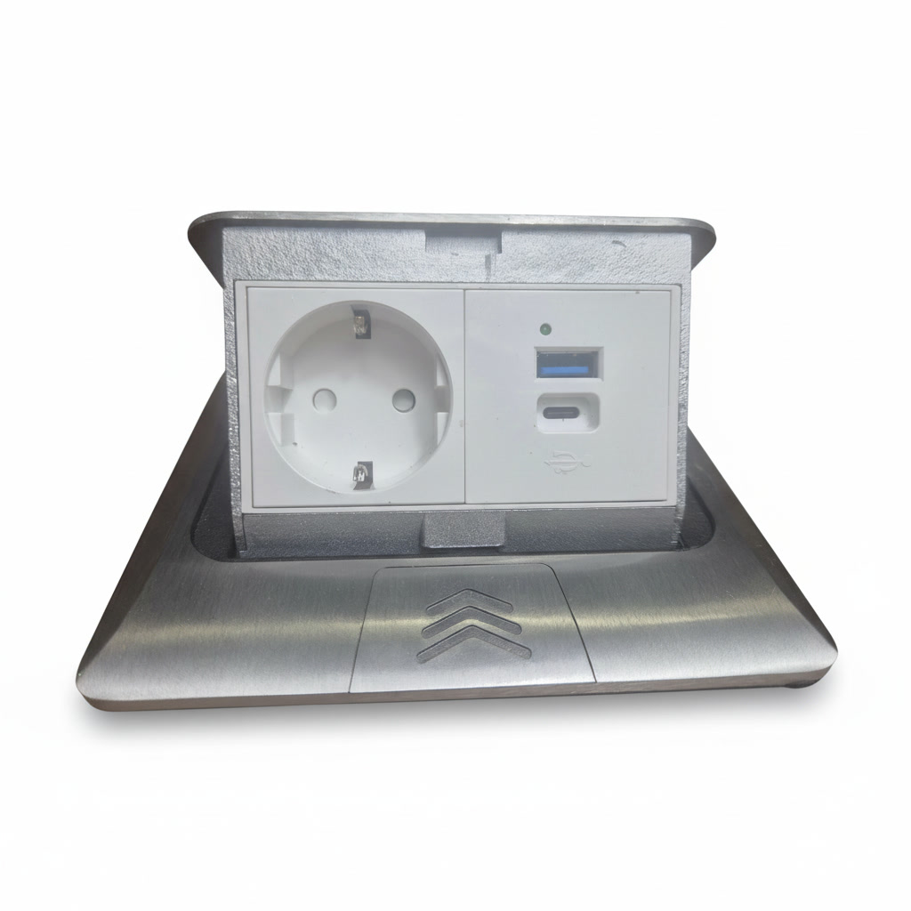 В столешницу интегрирован алюминиевый блок розеток, включающий 220 В, USB Type-C, RJ-45 и HDMI. Блок аккуратно встроен и сохраняет чистоту поверхности в закрытом состоянии.