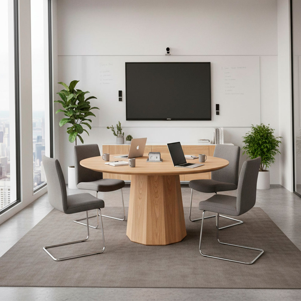 Геометричное двенадцатигранное подстолье обеспечивает устойчивость и формирует архитектурный образ.