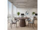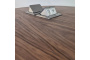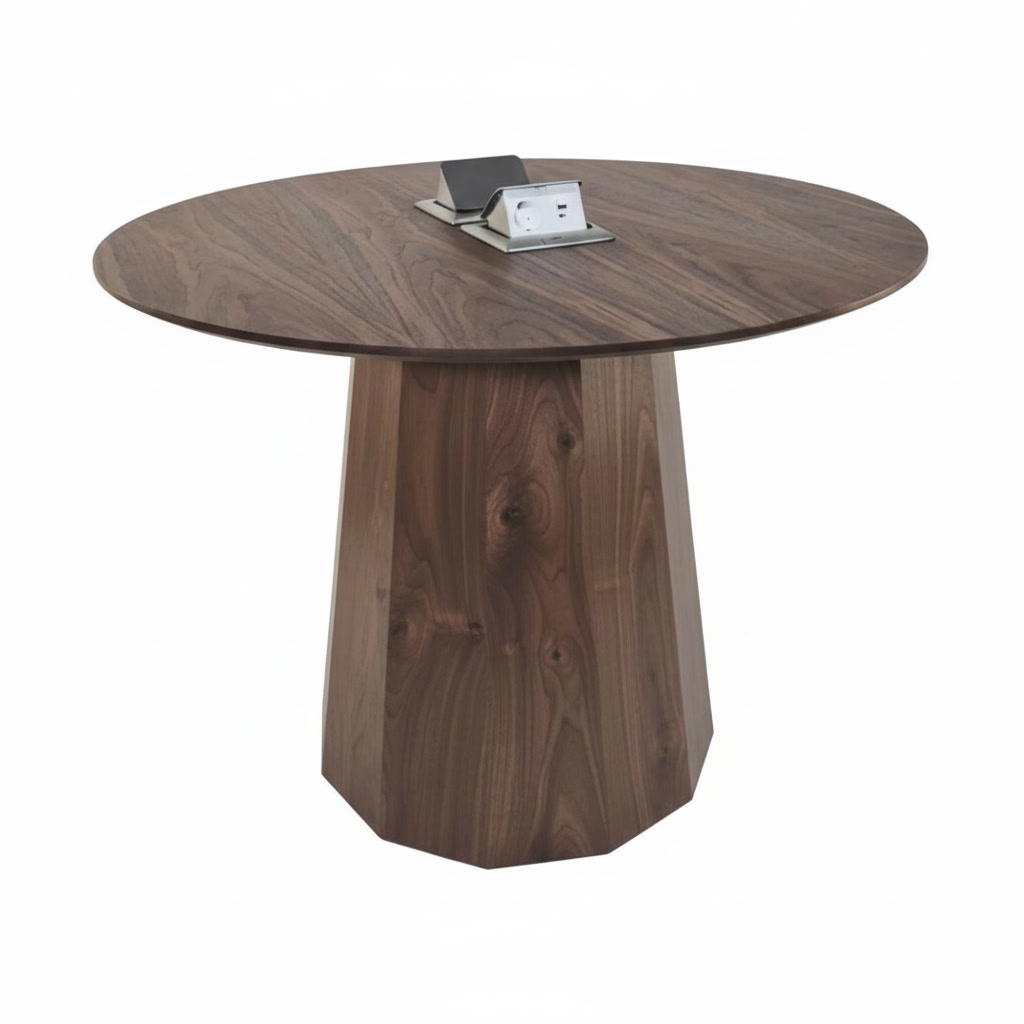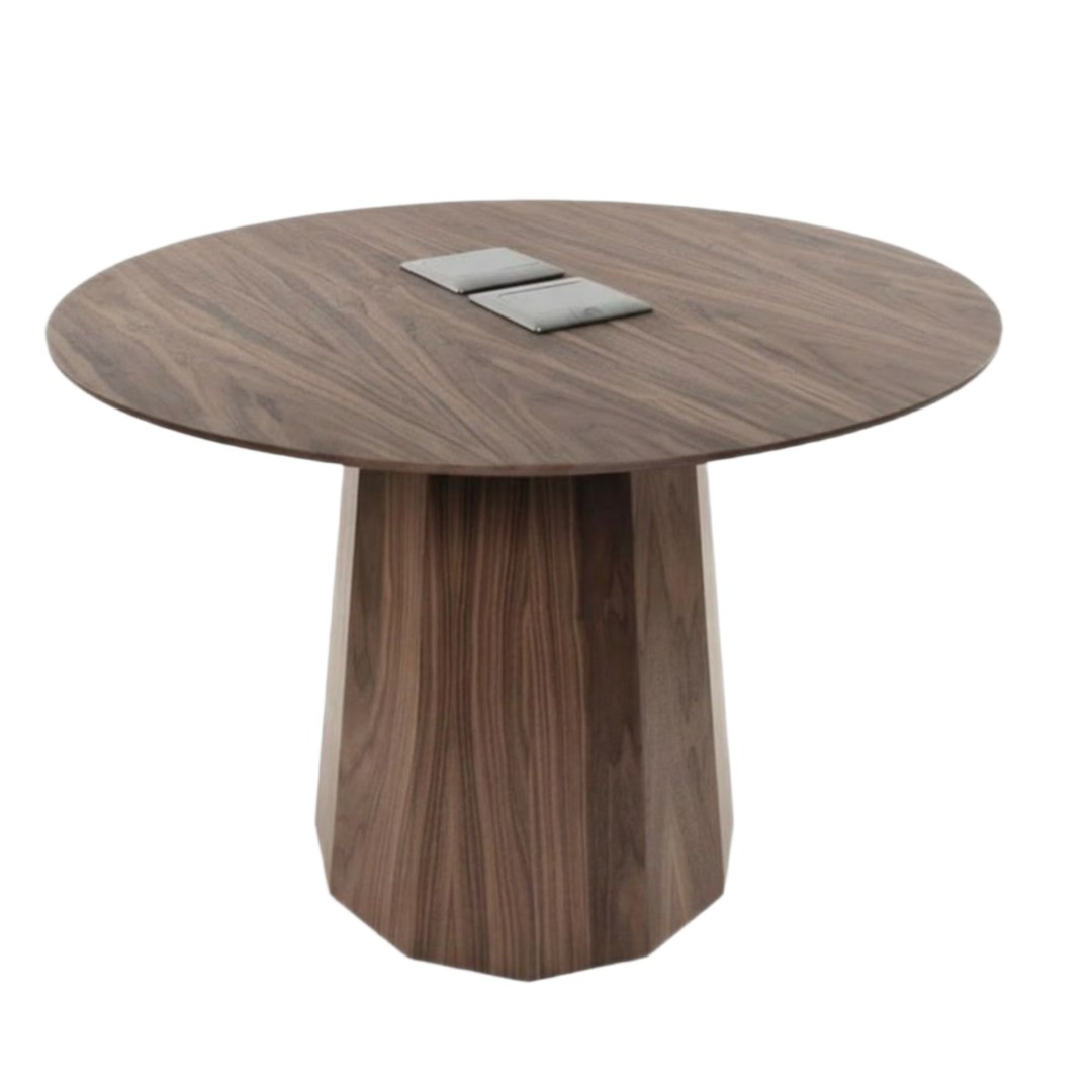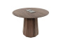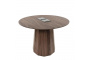 Столешница диаметром 1000 мм выполнена из натурального шпона американского ореха с насыщенной текстурой и тёплым природным оттенком. Материал подчёркивает премиальный характер изделия и делает стол визуальным центром пространства.