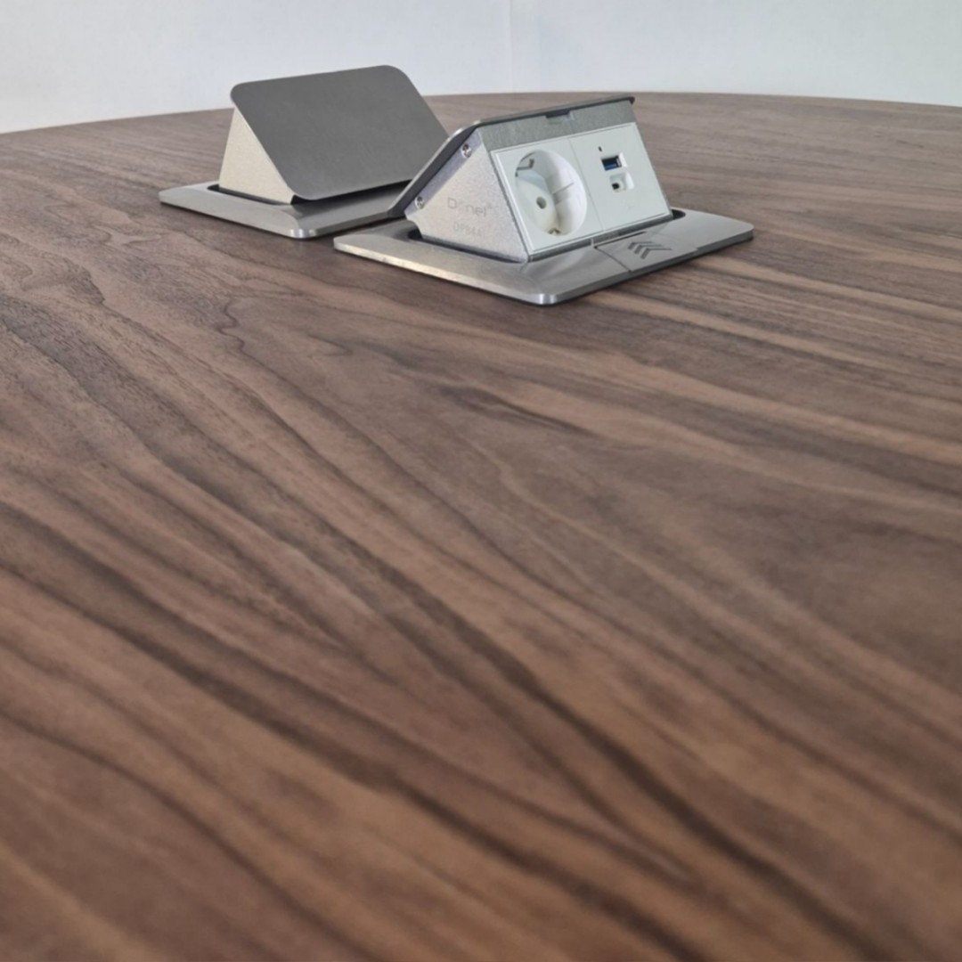 В столешницу интегрирован алюминиевый блок розеток, включающий 220 В, USB Type-C, RJ-45 и HDMI. Блок аккуратно встроен и сохраняет чистоту поверхности в закрытом состоянии.