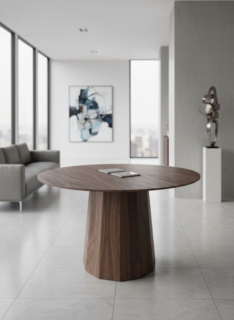 Двенадцатигранное подстолье имеет расширение к основанию и сужение кверху, создавая устойчивую и динамичную форму. Чёткие грани формируют архитектурный силуэт и подчёркивают дизайнерский характер стола.