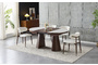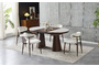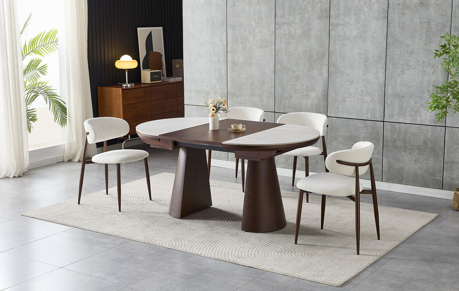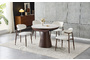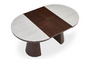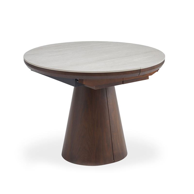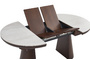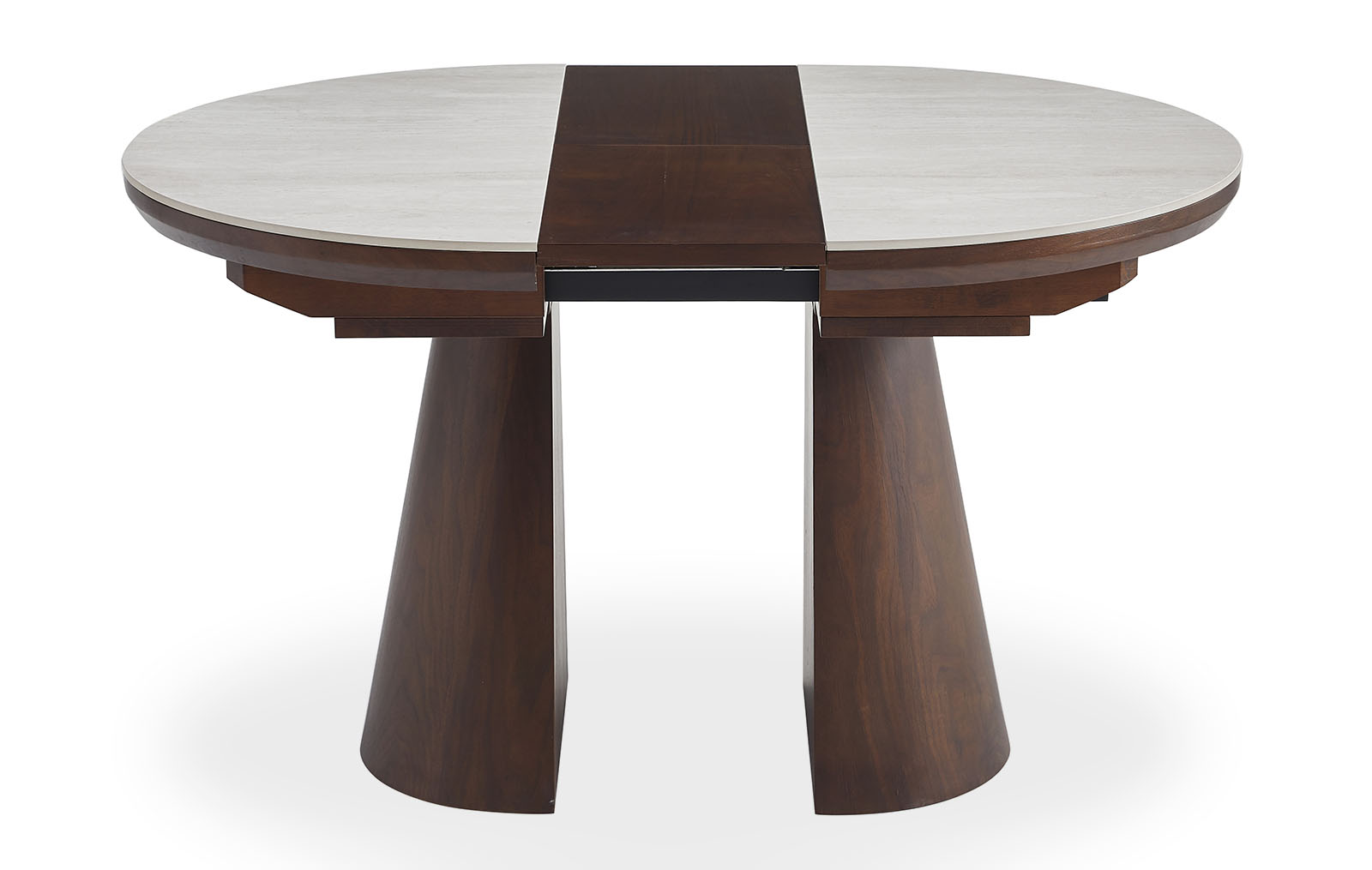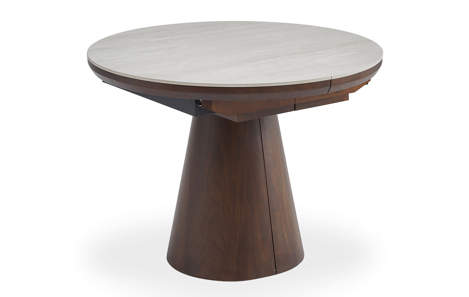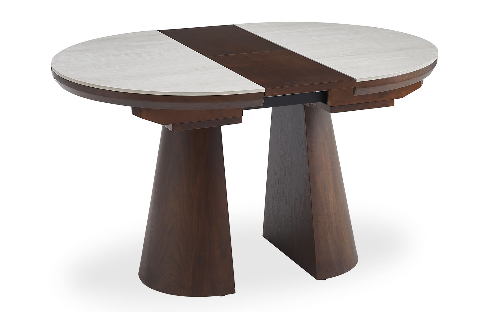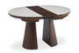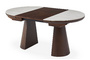 Столешница сделана из керамики в каменно-сером оттенке. Ножки и дополнительные вставки изготовлены из MDF в шпоне ореха.