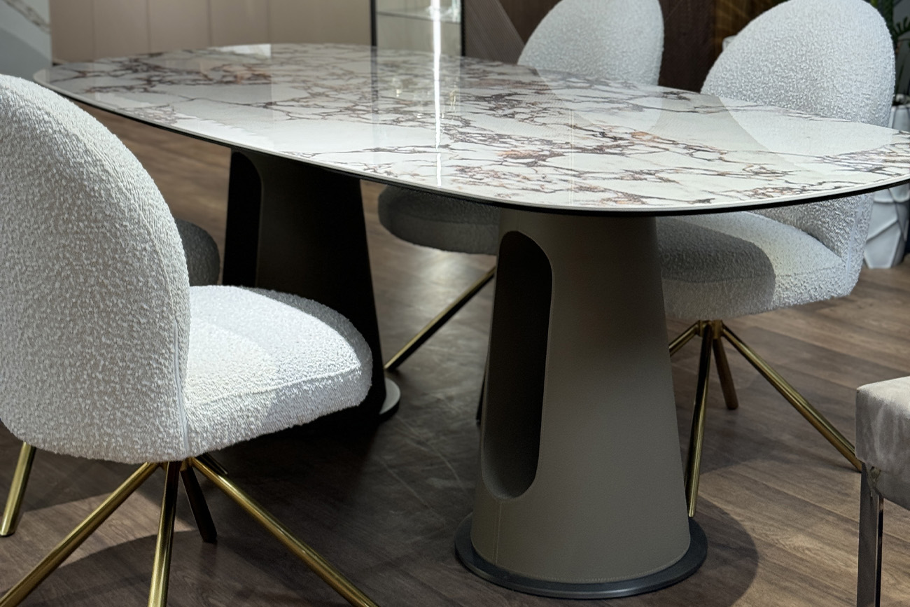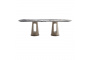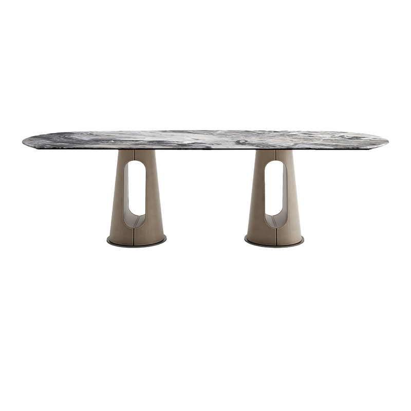 Запросить индивидуальное предложениеЭффектный большой обеденный стол – прекрасное решение для интерьера, в котором хочется воплотить модные тренды дизайна и создать комфортную атмосферу. Акцент сделан на столешнице 6мм керамики с 8мм закаленным стеклом и узором мрамора Булгари Пёрпл (Bulgari Purple) с уникальным выразительным рисунком. За устойчивость и декоративность отвечают основания оригинальной формы из металла, обтянутого экокожей бежевого цвета – актуальный тренд в современных интерьерах. Обеденный стол овальной формы займет центральное место в столовой комнате или просторной кухне, добавит обстановке элегантного шика. На нашем сайте можно купить обеденный стол из мрамора вместе с креслами и стульями, которые идеально подойдут по стилю и цвету. Толщина столешницы 14мм. Сочетается со стульями 160KD-80200, выполненными в бежевой экокоже.