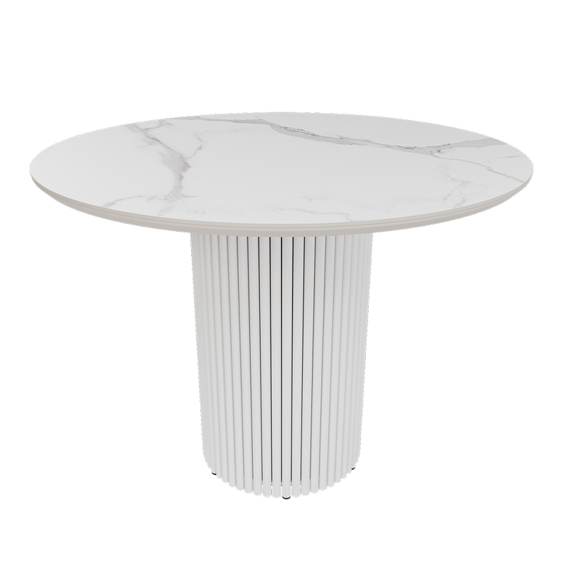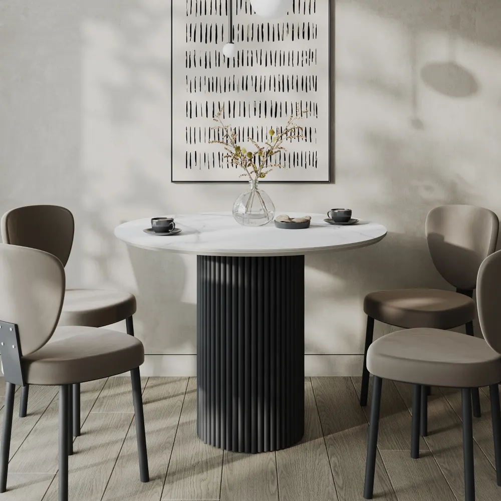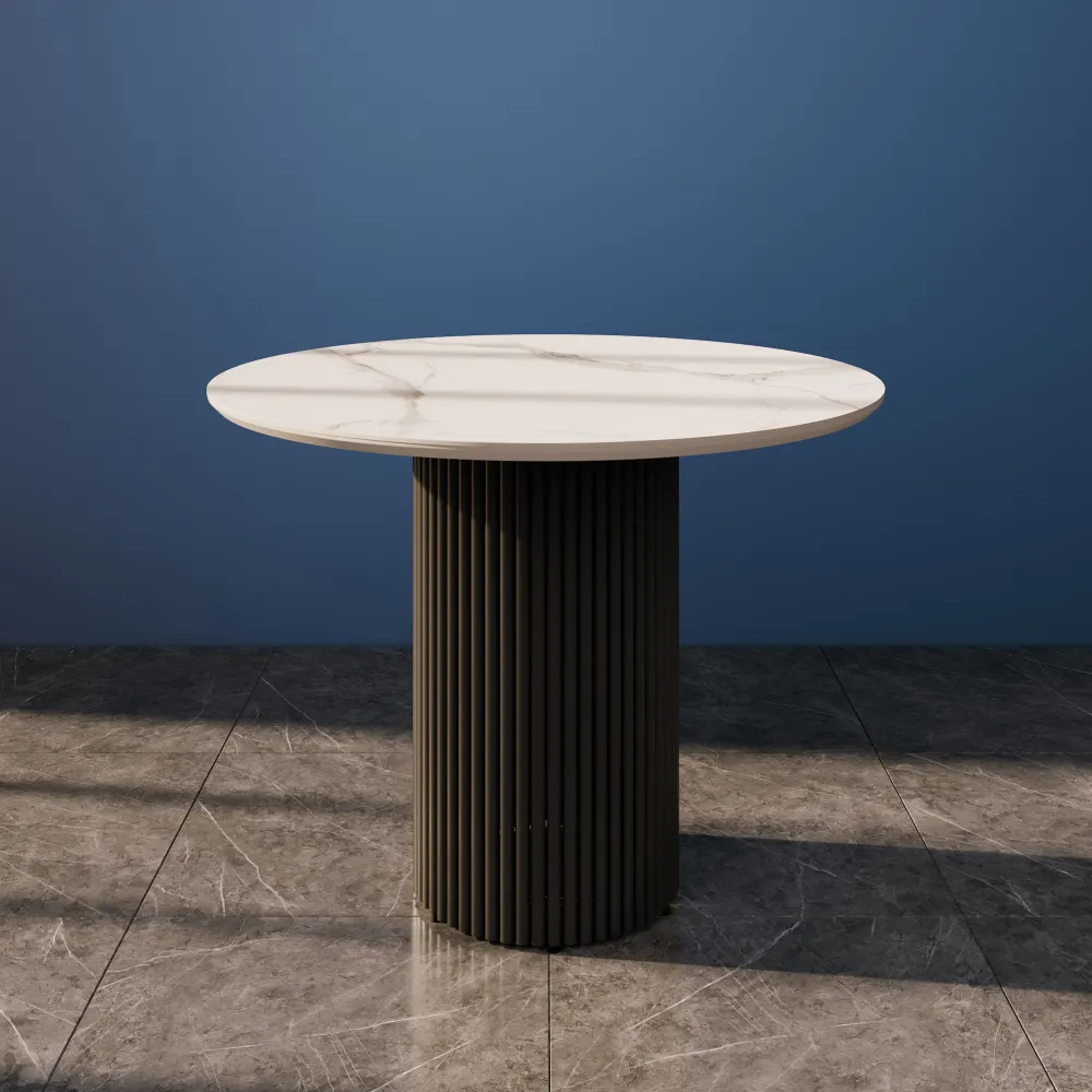 Запросить индивидуальное предложениеКруглый стол с металлическим трубчатым подстольем идеально впишется в кухонный интерьер, добавляя элегантности и современности. Его минималистичный дизайн создаёт атмосферу легкости и гармонии, делая стол не только функциональным, но и эстетически привлекательным элементом пространства. Столешница выполнена из МДФ и керамогранита толщиной 2,5 см, в элегантном белом мраморном цвете. Стандартная отделка включает матовую порошковую окраску в золотом, чёрном или белом цвете, что позволяет выбрать идеальный вариант под ваш интерьер. Стол рассчитан на комфортное размещение 2-4 человек, обеспечивая удобство во время трапезы и общения. Для дополнительного удобства предусмотрены регулируемые ножки, которые гарантируют стабильность на неровных поверхностях. Это идеальный выбор для вашей кухни, сочетая в себе стиль, комфорт и практичность.