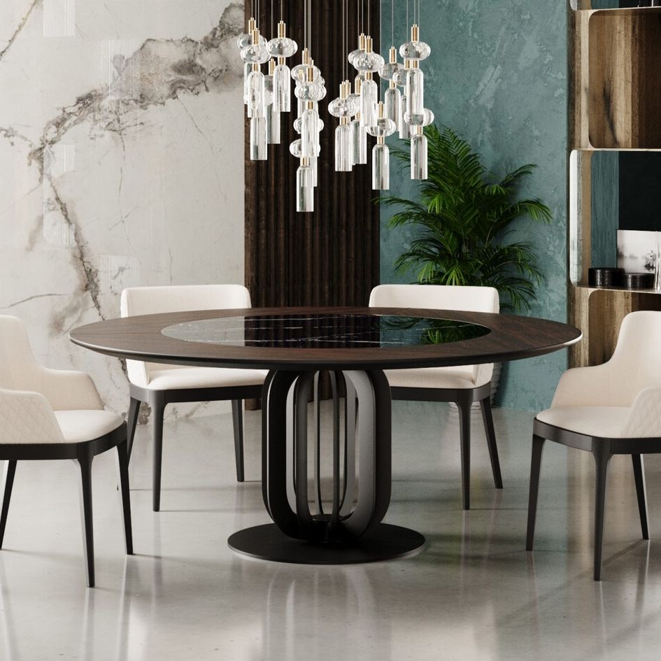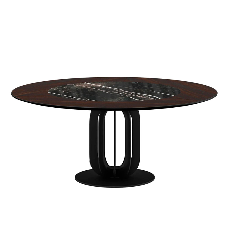 Нераскладывающаяся столешница — изготовлена из МДФ толщиной 40 мм с натуральным шпоном 1 мм и вставкой по центру из матовой или глянцевой керамики 6 мм с диаметром круга 80 см, Круглая форма стола делает его подходящим для повседневного использования и обслуживания гостей. Сохо — стильный и практичный выбор для современных интерьеров.