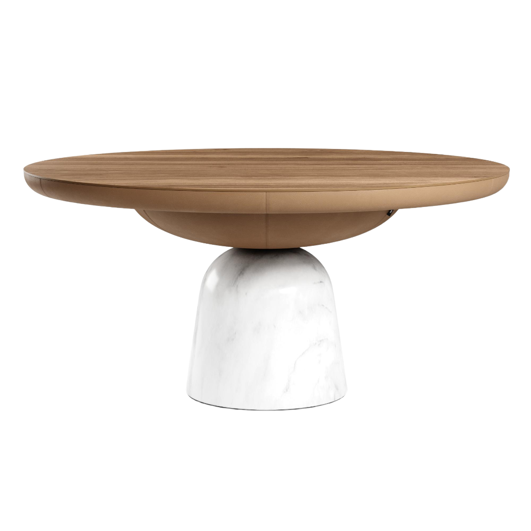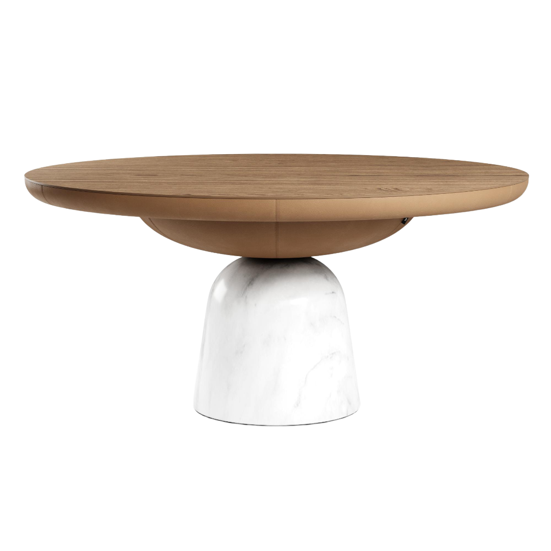 Запросить индивидуальное предложениеСерия монументальных столов САТУРН с мраморной опорой и обтекаемой формой столешницы. Лаконичный и современный, он не перегружает интерьер благодаря комплиментарному сочетанию оттенков столешницы и подстолья. Устойчивая опора выполнена из нового материала, разработанного ТОК, — инженерного мрамора с естественным и предсказуемым рисунком камня. Изделие представлено в нескольких вариациях: с использованием натуральной или искусственной кожи для подстолья, с керамической столешницей или МДФ с покрытием из шпона дуба.