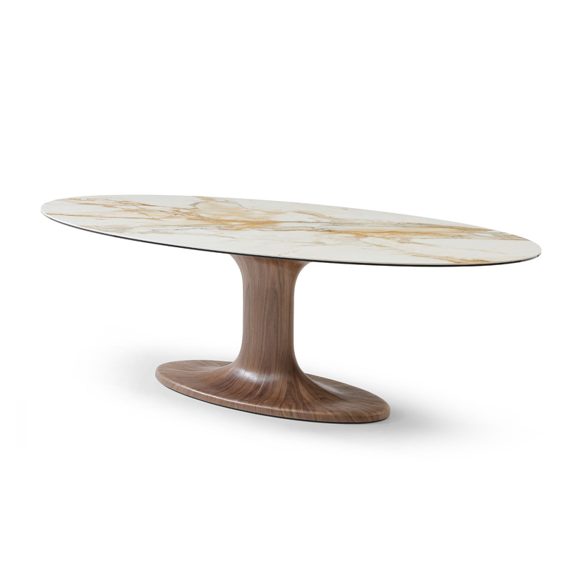 Основание стола изготовлено из прочного стекловолокна и покрыто натуральным шпоном ореха. Теплая текстура древесины подчеркивает благородный характер модели и придает интерьеру статусность. Центральная опора обеспечивает устойчивость и удобство размещения стульев по периметру.