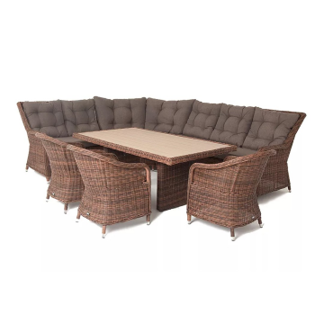 Угловая модульная обеденная группа. Искусственный ротанг, плетение круглое, цвет коричневый,алюминиевый каркас. Столешница из ДПК. "Бергамо" плетеный угловой диванный модуль, цвет коричневый 1шт. 1 630Х900Х980, "Бергамо" плетеный левый модуль дивана, цвет коричневый 1шт. 1 150Х900Х980, "Бергамо" плетеный правый модуль дивана, цвет коричневый 1шт. 1 150Х900Х980, "Бергамо" плетеный центральный модуль дивана, цвет коричневый 1шт. 900Х550Х980, "Бергамо" плетеный обеденный стол, цвет коричневый 1шт. 1 800Х1 000Х680, "Равенна" плетеное кресло из искусственного ротанга, цвет коричневый 3шт. 570Х680Х810,