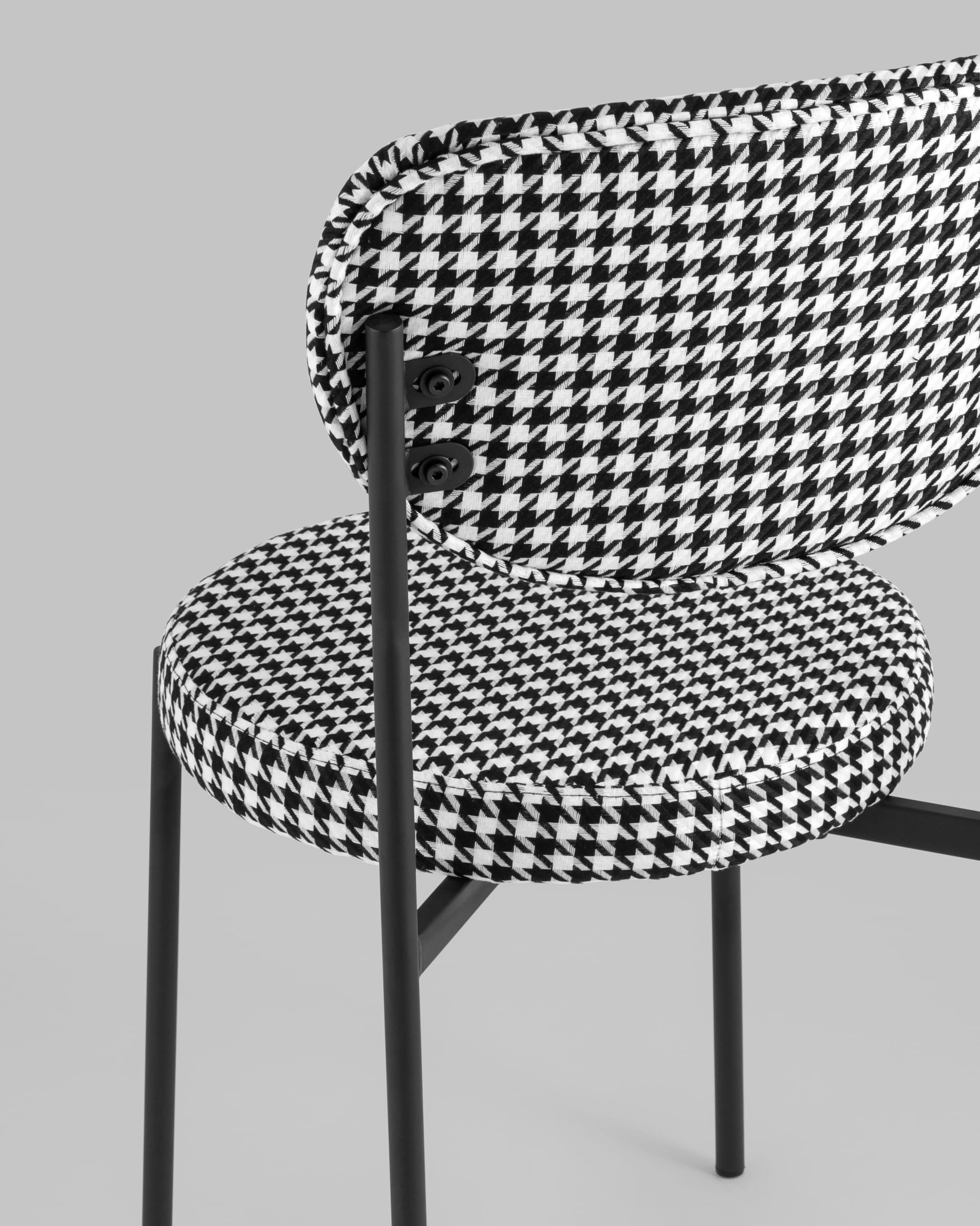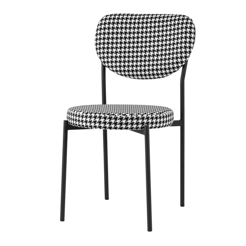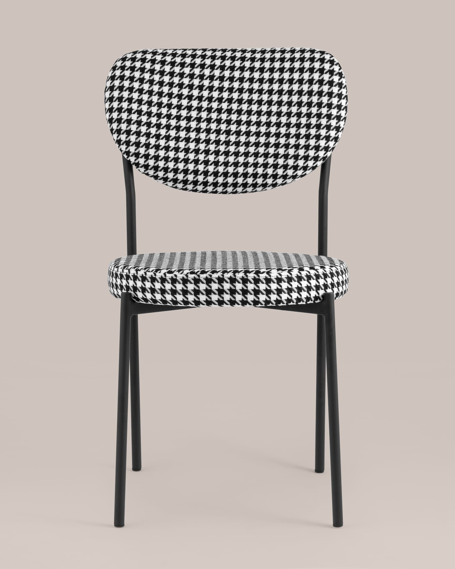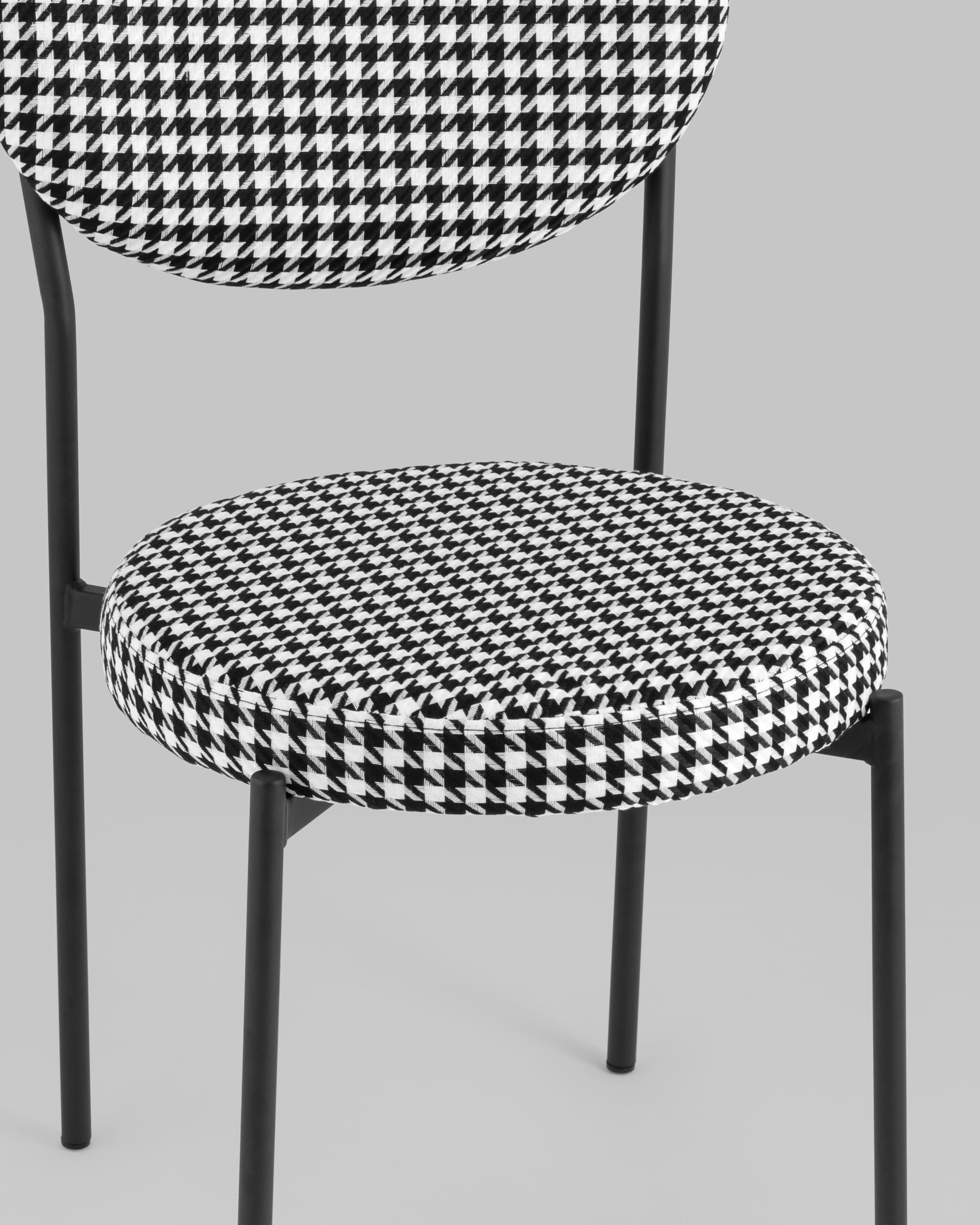 Обивка выполнена из прочной ткани с принтом гусиная лапка, ножки изготовлены из металла в черном цвете. На ножках дополнительно предусмотрены специальные подпятники, которые предотвращают скольжение и повреждение напольного покрытия.