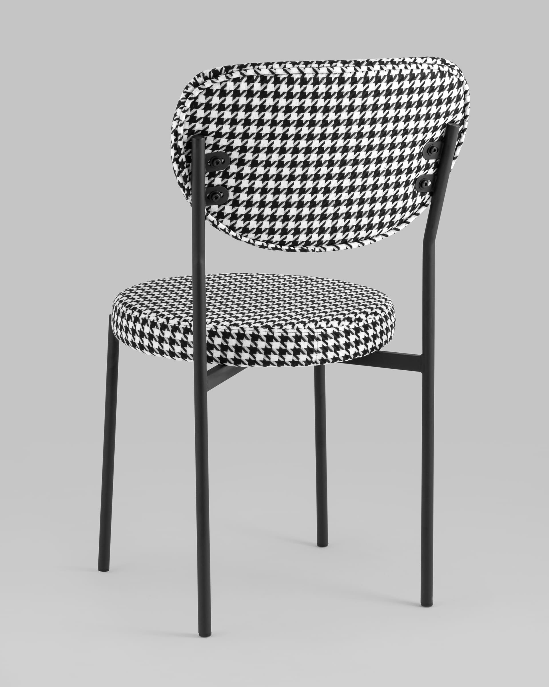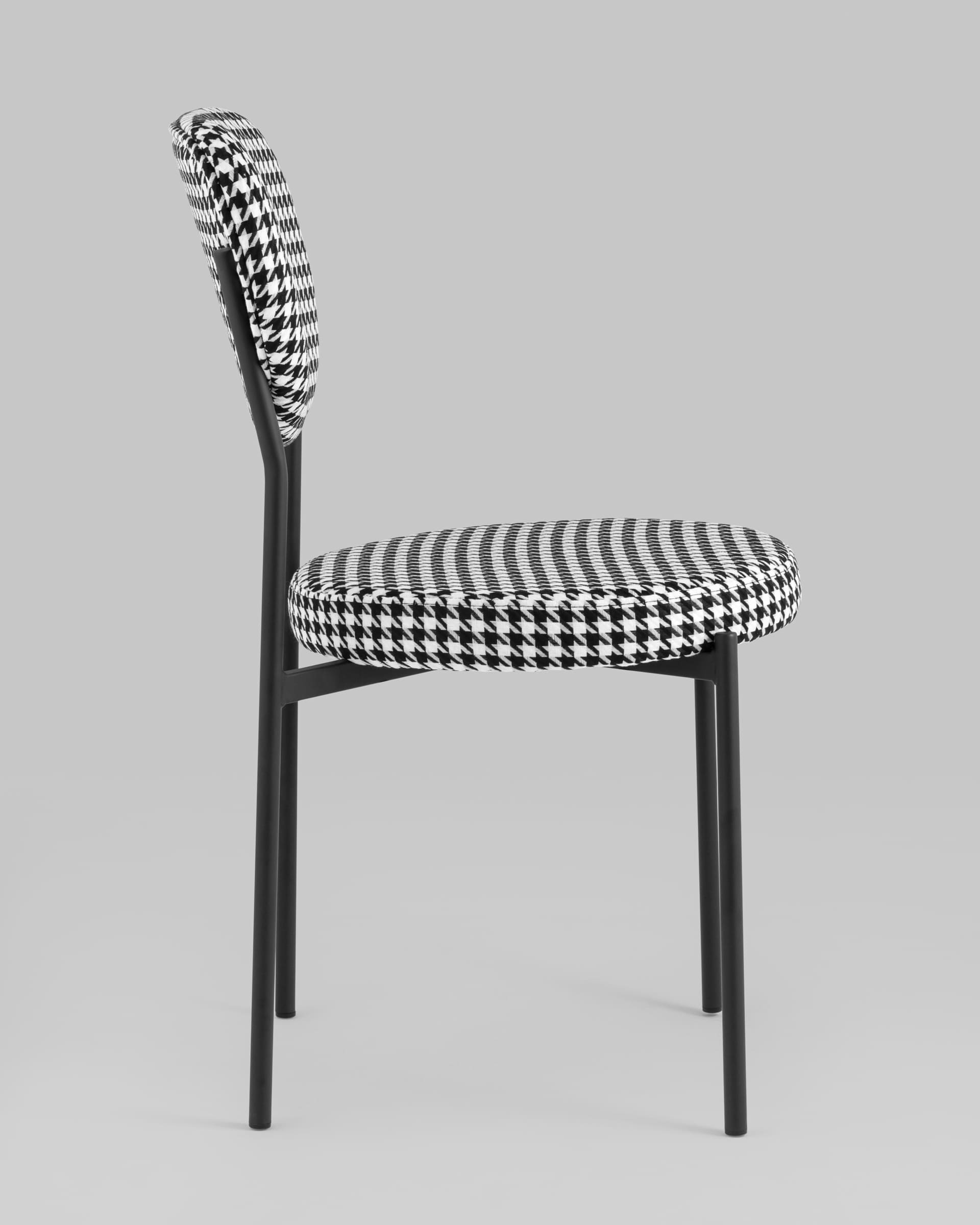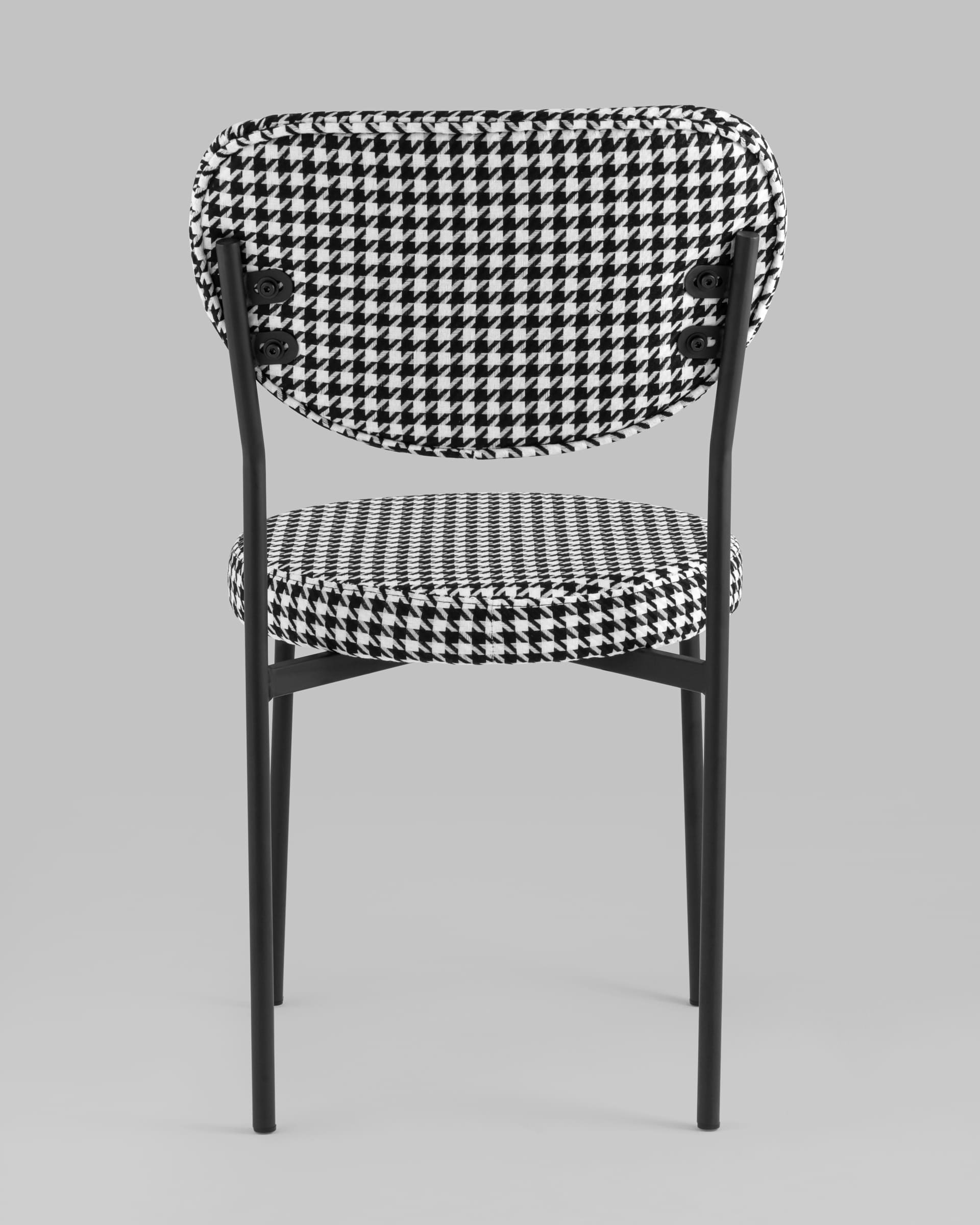 Обивка выполнена из прочной ткани с принтом гусиная лапка, ножки изготовлены из металла в черном цвете. На ножках дополнительно предусмотрены специальные подпятники, которые предотвращают скольжение и повреждение напольного покрытия.