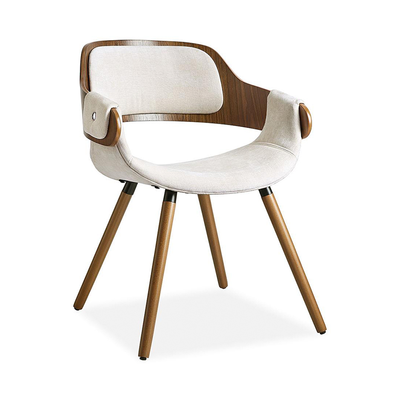 Обивка из бежевой ткани составляет гармоничный дуэт с ореховыми ножками и такими же частями спинки.