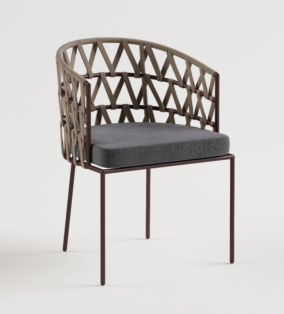 "Диего" стул плетеный из роупа, каркас из стали белый муар, роуп серый меланж круглый, ткань серая 017