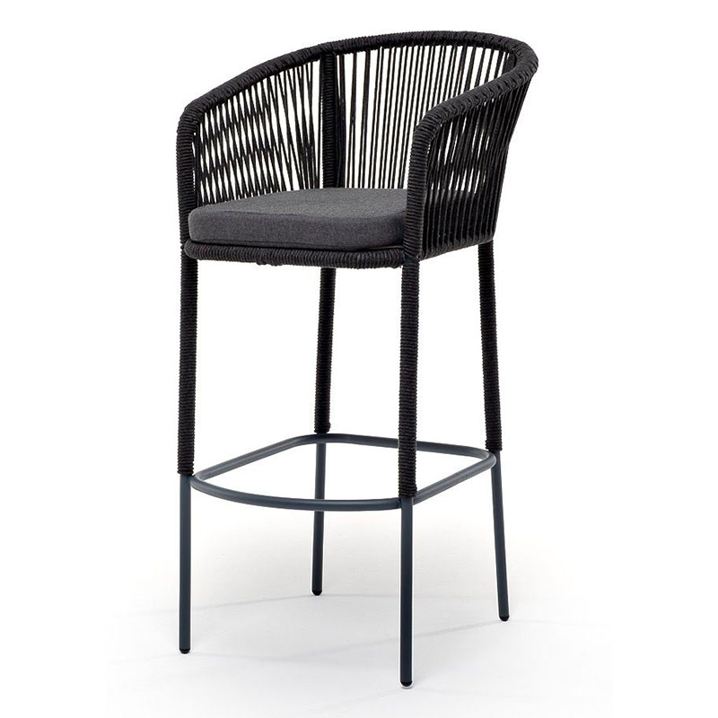 "Марсель" стул барный плетеный из роупа, каркас из стали серый (RAL7022) муар, роуп темно-серый круглый, ткань темно-серая 027
